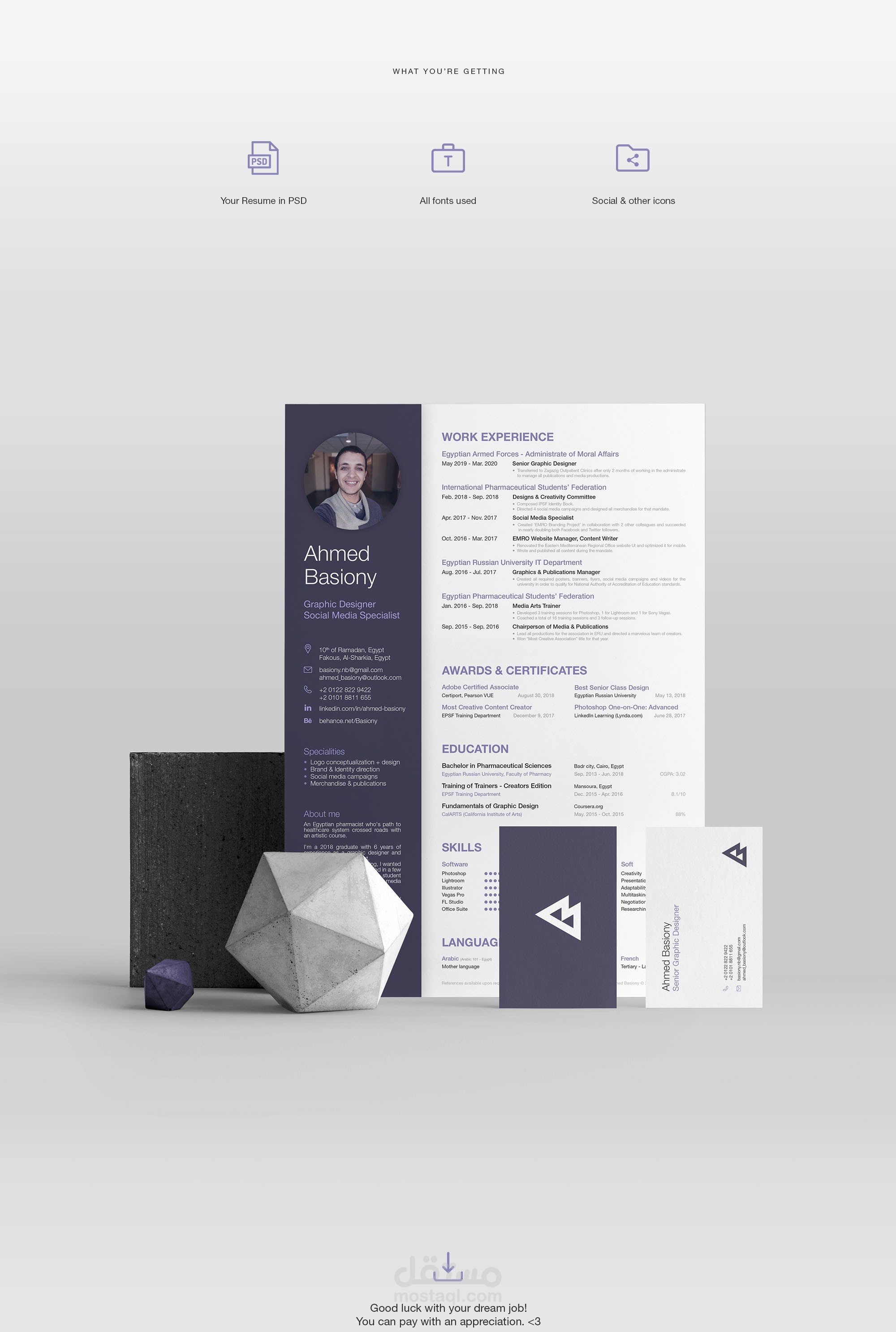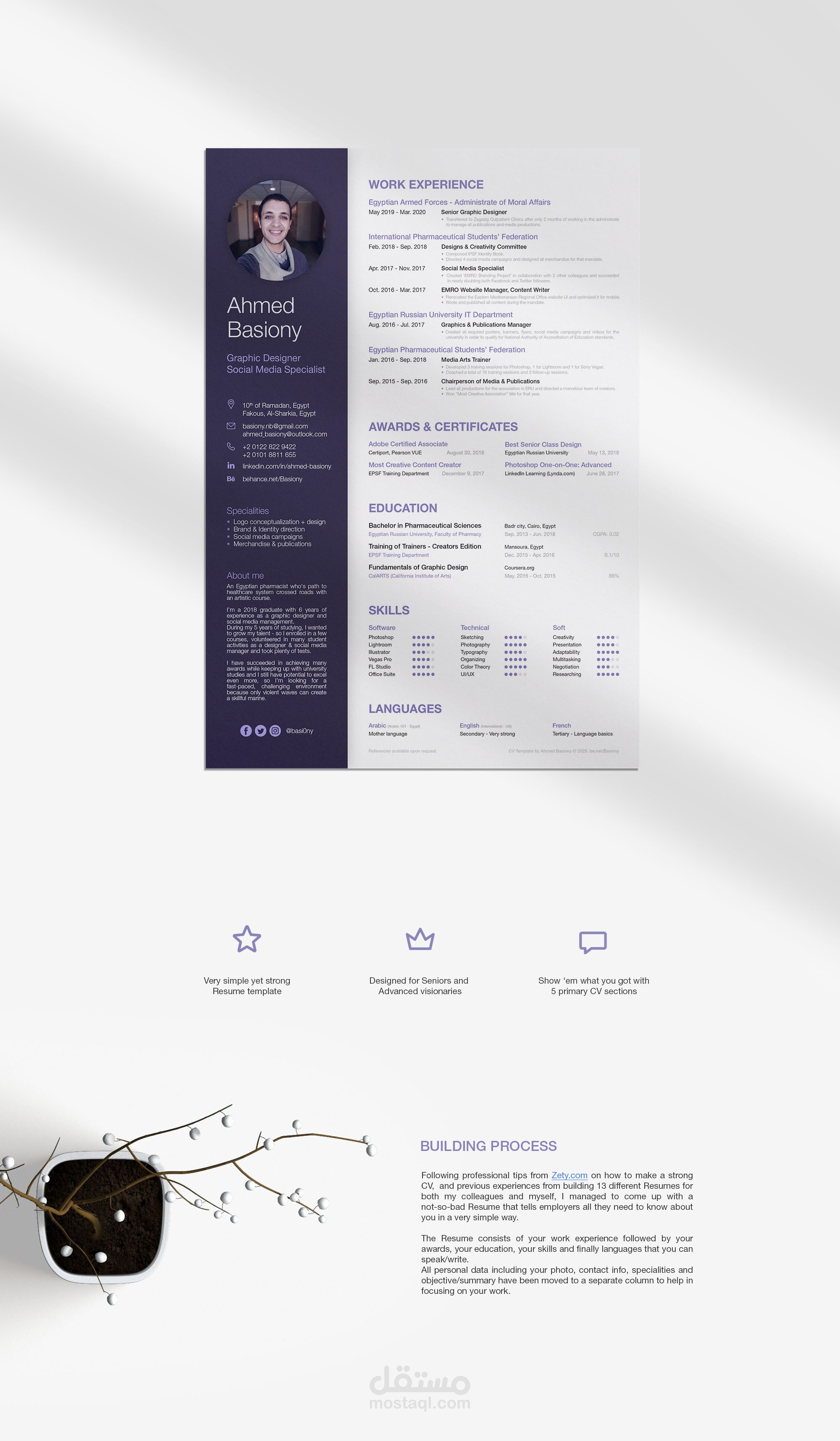 Following professional tips from Zety.com on how to make a strong CV, and previous experiences from building 13 different Resumes for both my colleagues and myself, I managed to come up with a not-so-bad Resume that tells employers all they need to know about you in a very simple way. The Resume consists of your work experience followed by your awards, your education, your skills and finally languages that you can speak/write. All personal data including your photo, contact info, specialities and objective/summary have been moved to a separate column to help in focusing on your work.