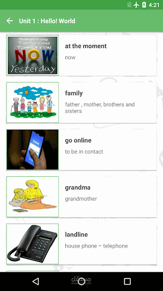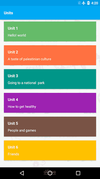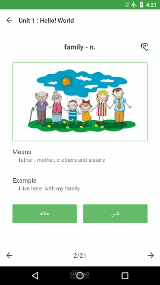 - Save the words of each unit by linking the image with the word in English with the translation of the Arabic with its correct pronunciation. The sound button can be pressed to repeat hearing the word for more than once. Listening is one of the best language learning skills.