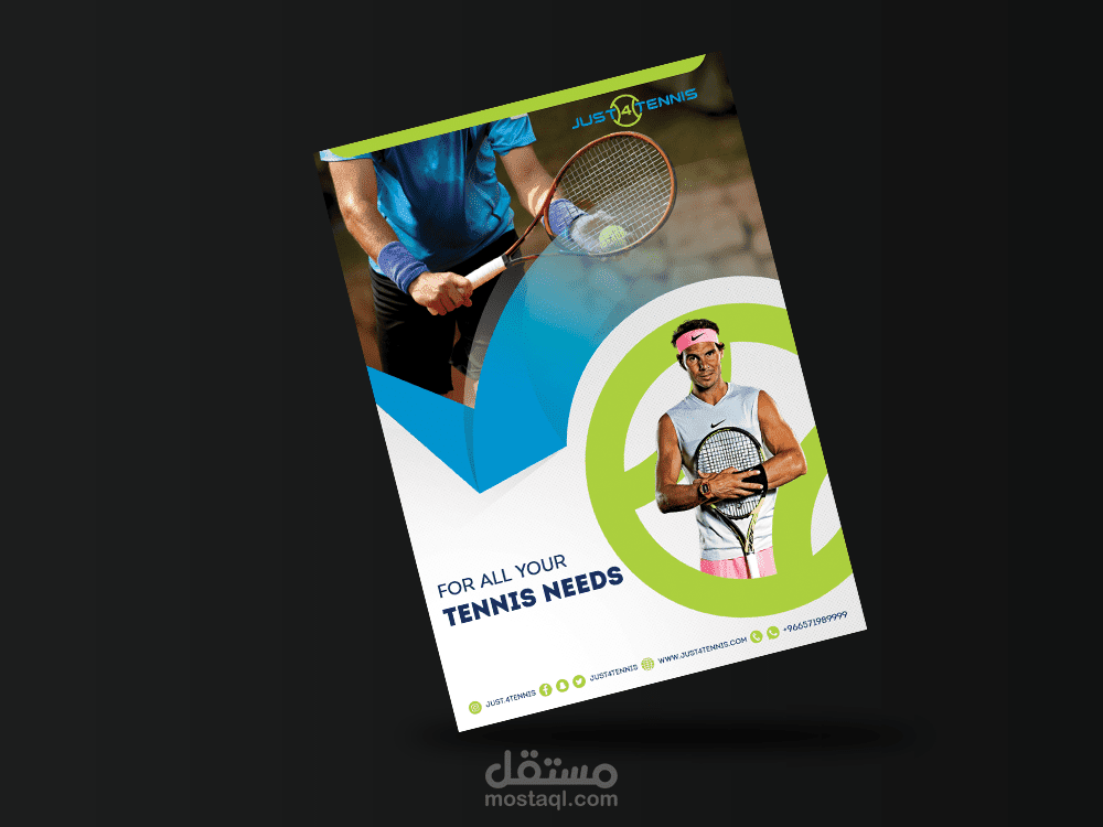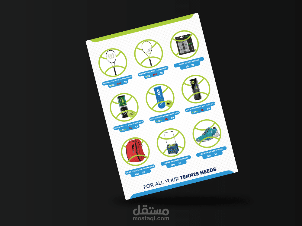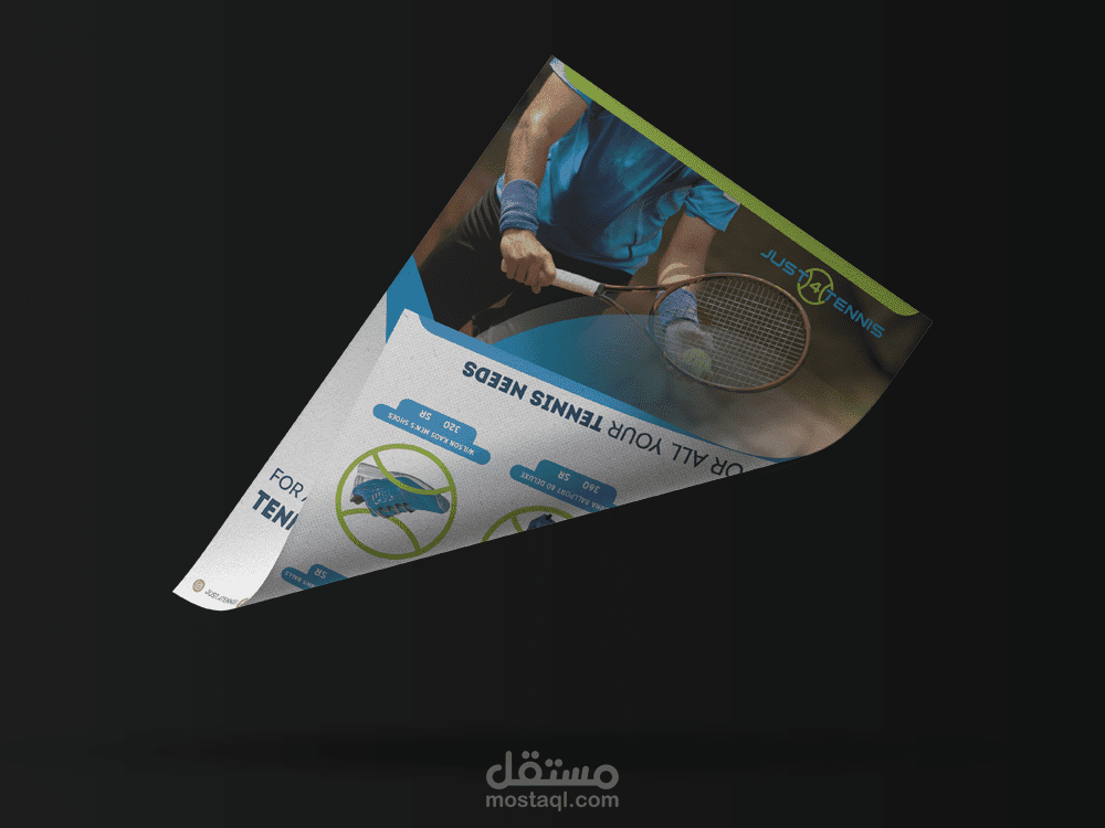 فلاير وجهين قمت بتصميمه لمتجر أون لاين يبيع منتجات التنس ويتعامل مع أغلب البراندات العالمية .. يحتوى الفلاير على بعض العروض والخصومات للمنتجات.