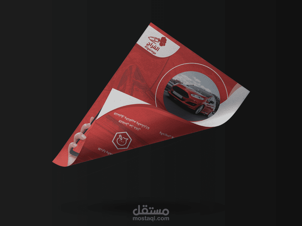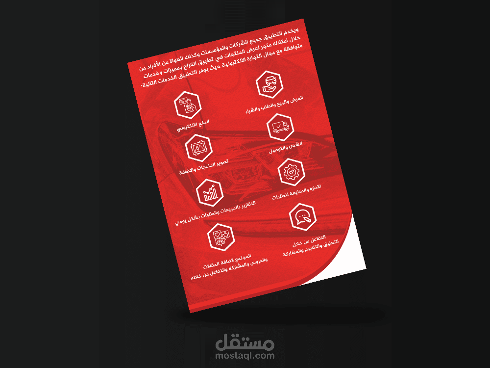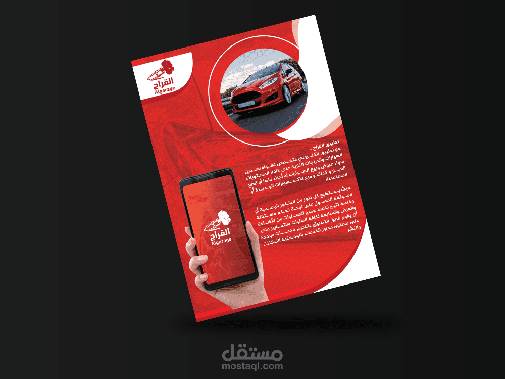 فلاير وجهين قمت بتصميمه لموبايل أبليكيشن بأسم الجراج وهو عبارة عن تطبيق الكتــروني متخــصص لهــواة تعــديل السيارات والدراجات النارية على كافة المسـتويات سواء عروض وبيع الســيارات أو أجزاء منها أو قطع الغيــار و كذلك جميع الاكســسوارات الجـديـدة أو المستعملة .