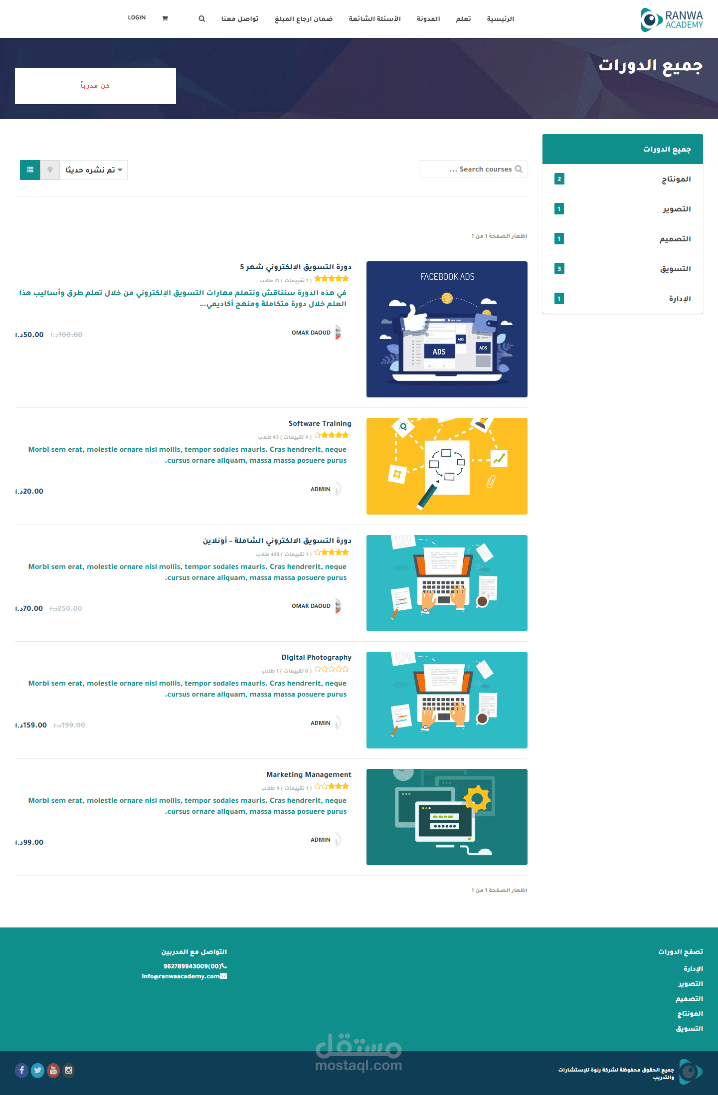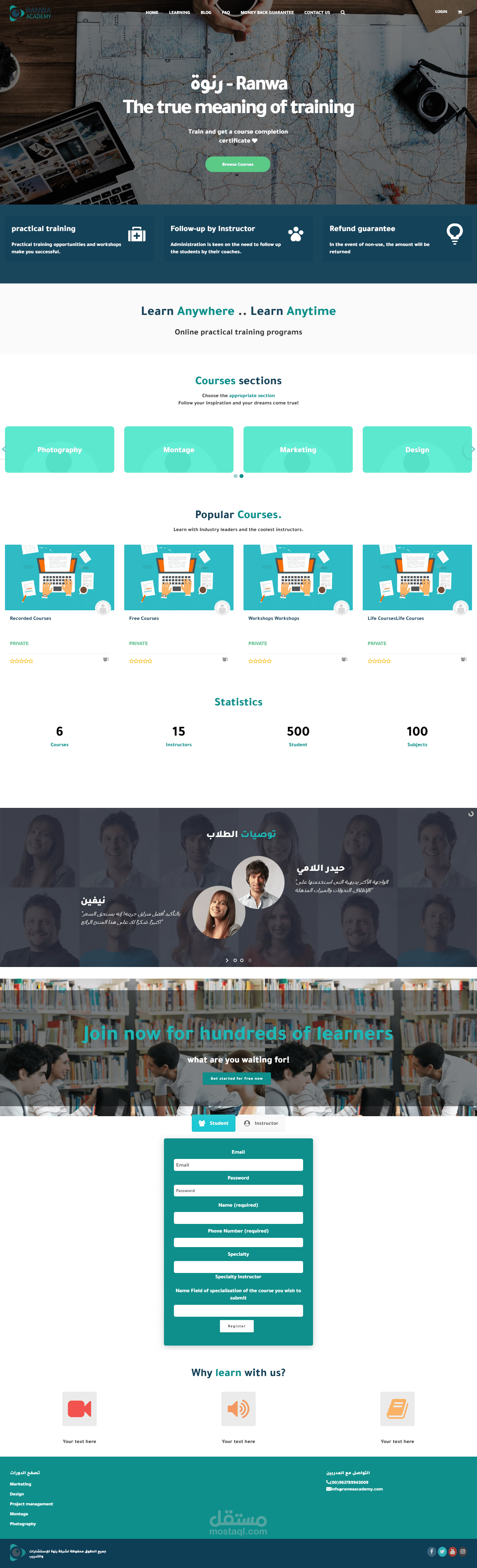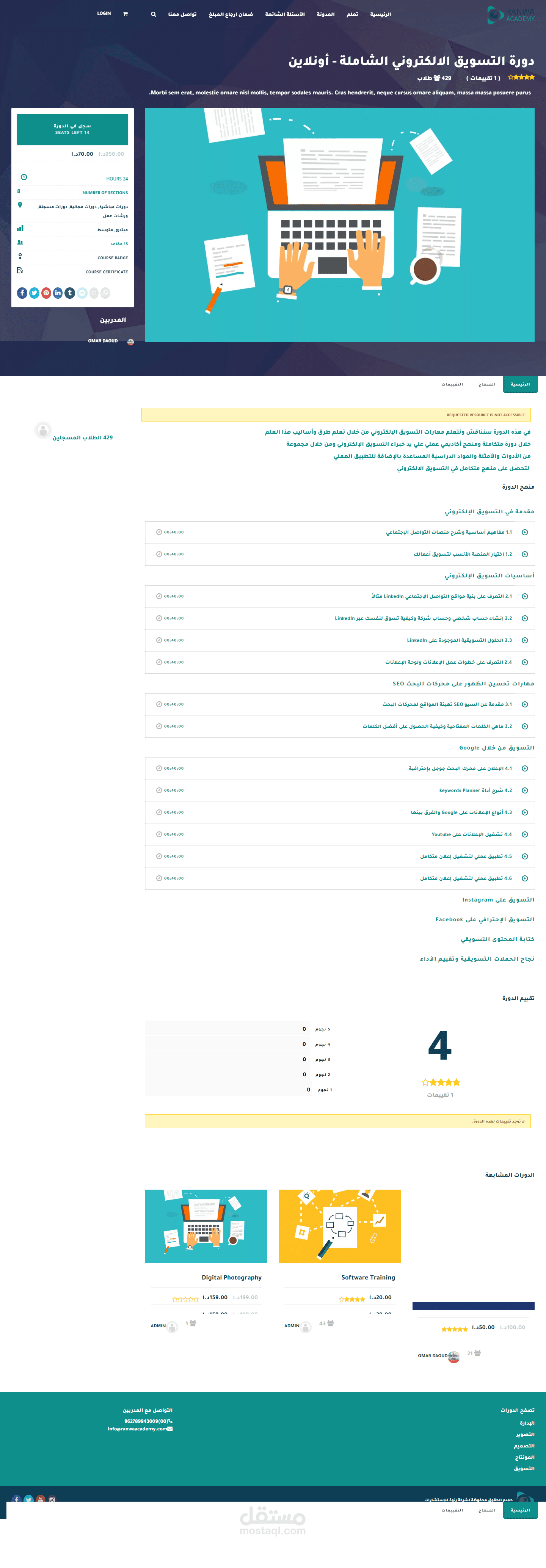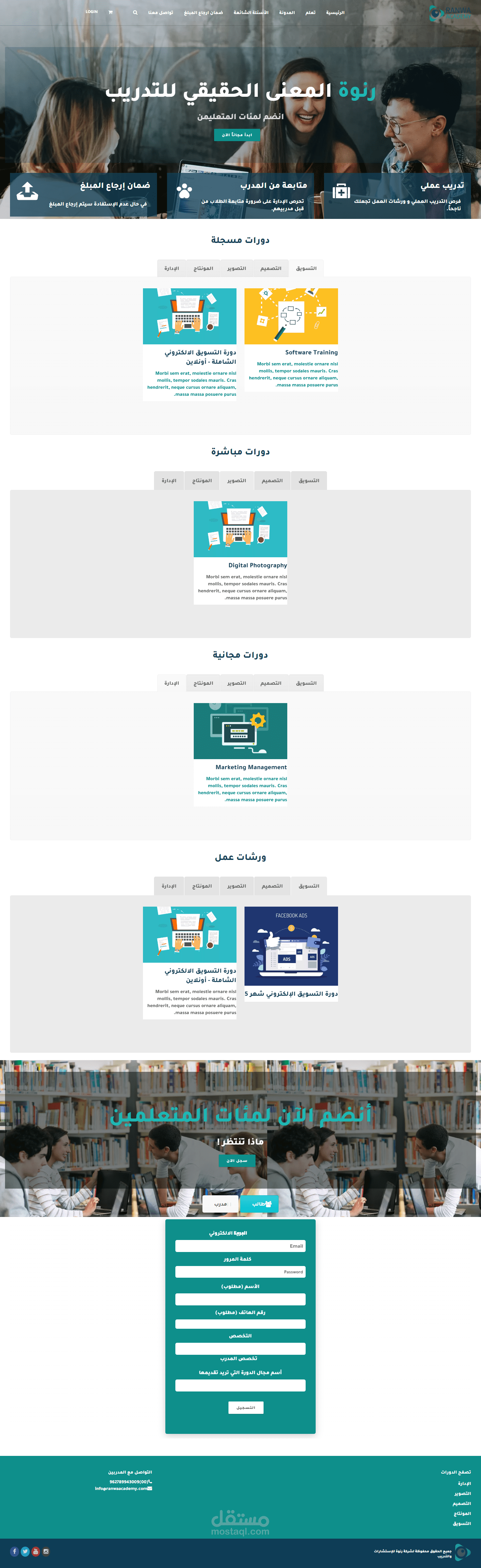 تم تصميم وبرمجة موقع كورسات مجانية ومدفوعة مع نظام الاستاذة او المدربين المتعددين مع اصدار شهادة اتمام الدورة او للطلاب نظام الموقع كورسات مجانية و مدفوعة وسائل الدفع بايبال وفيزا وماستر كارد الموقع باللغتين العربية والانجليزية