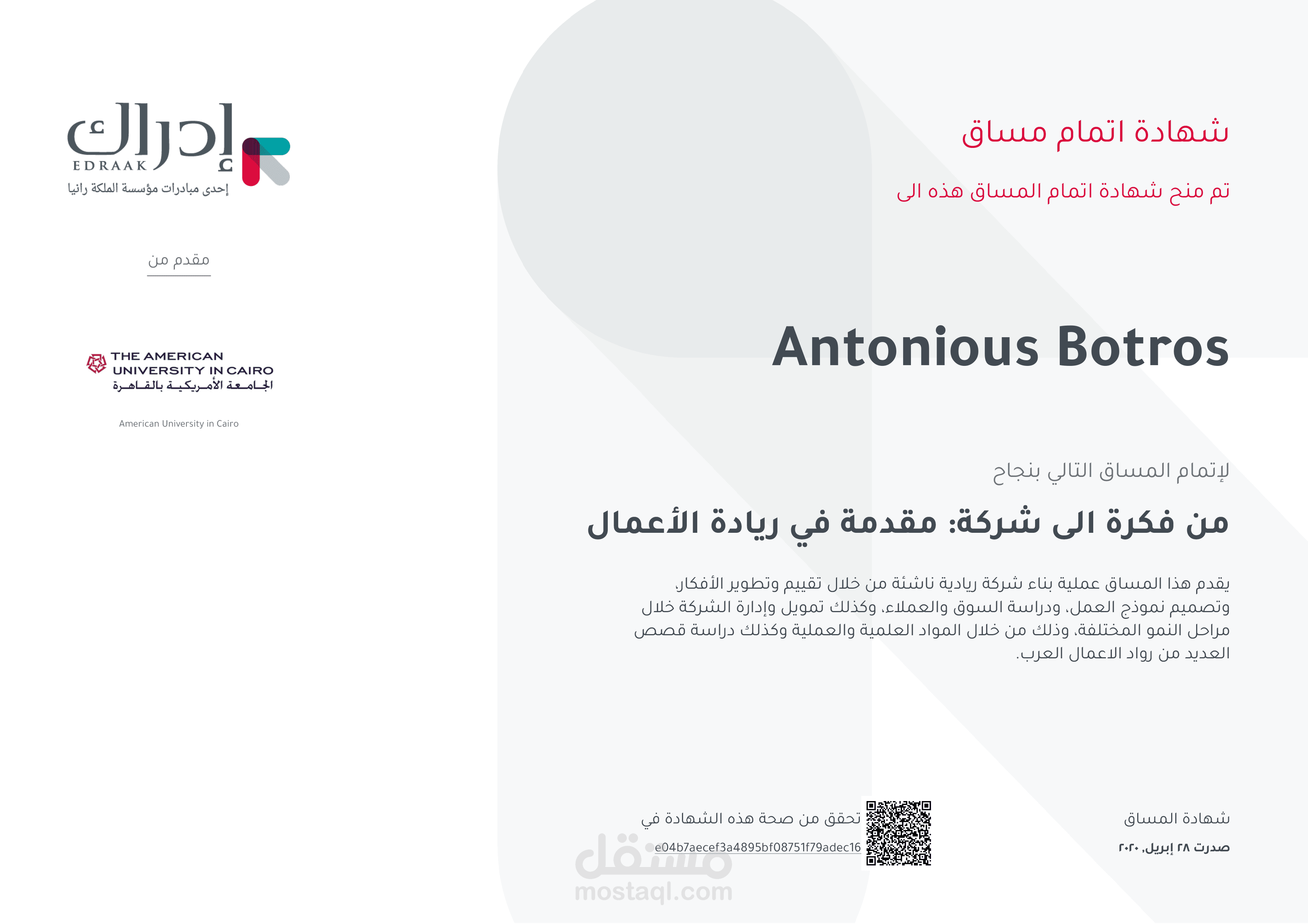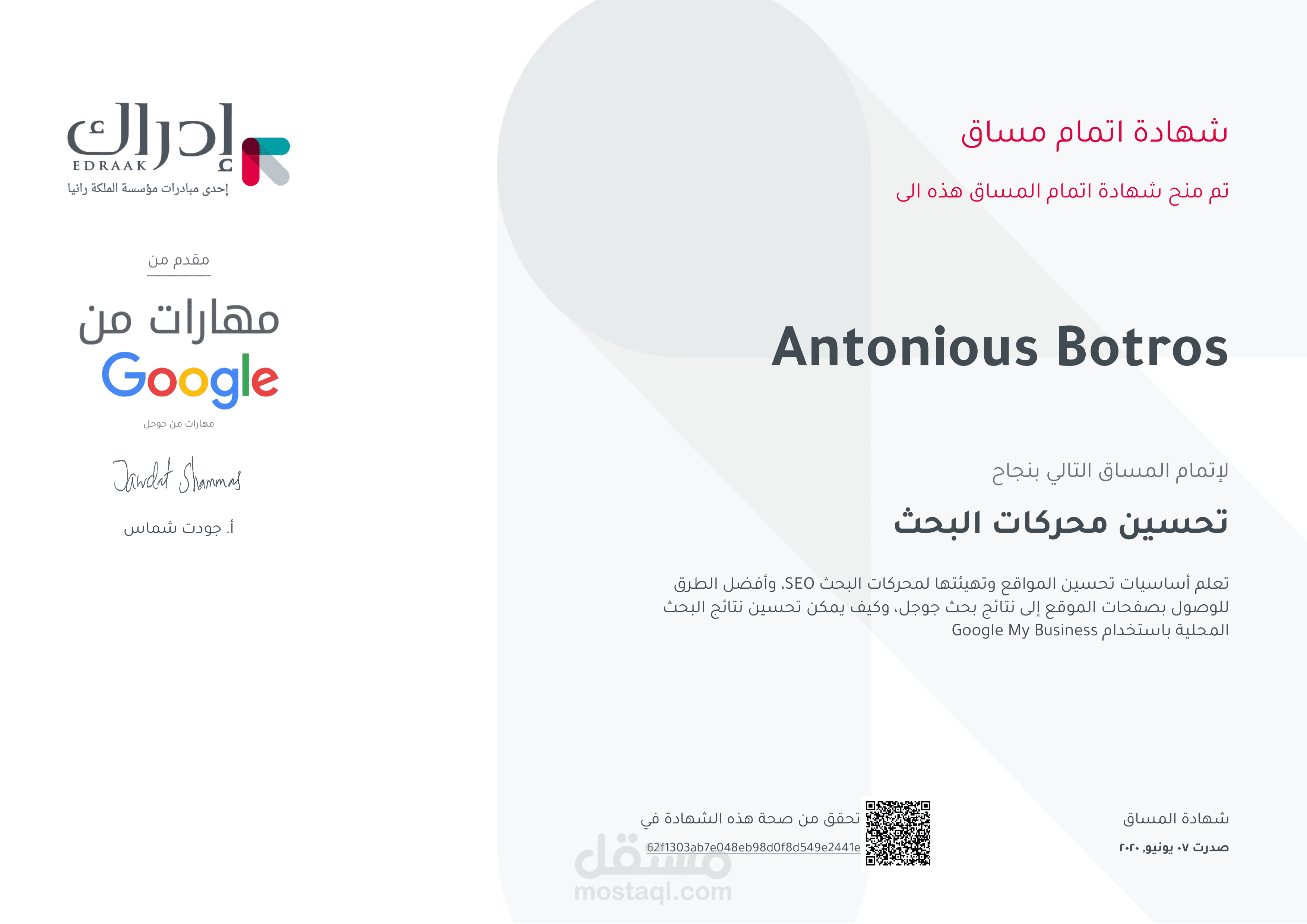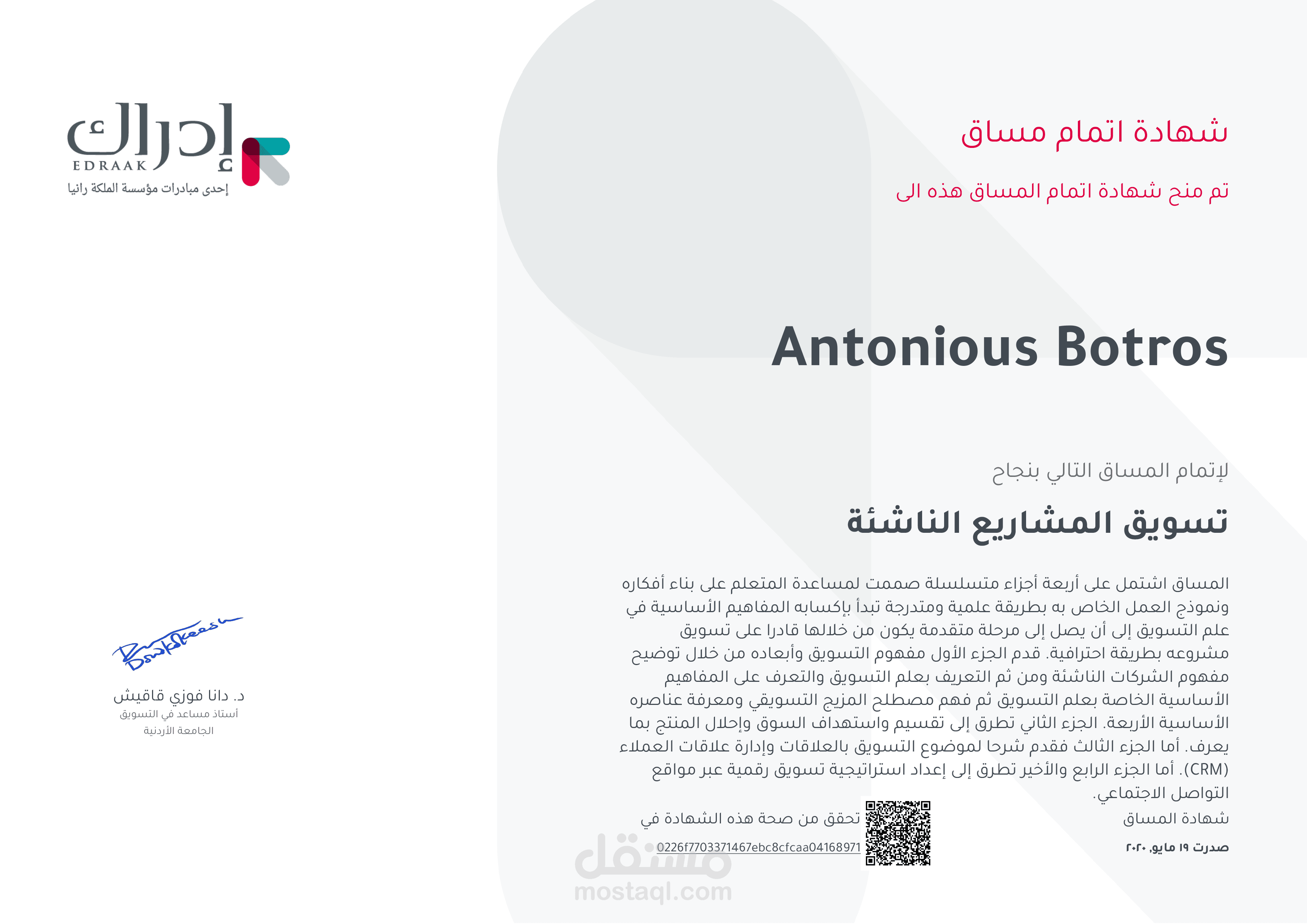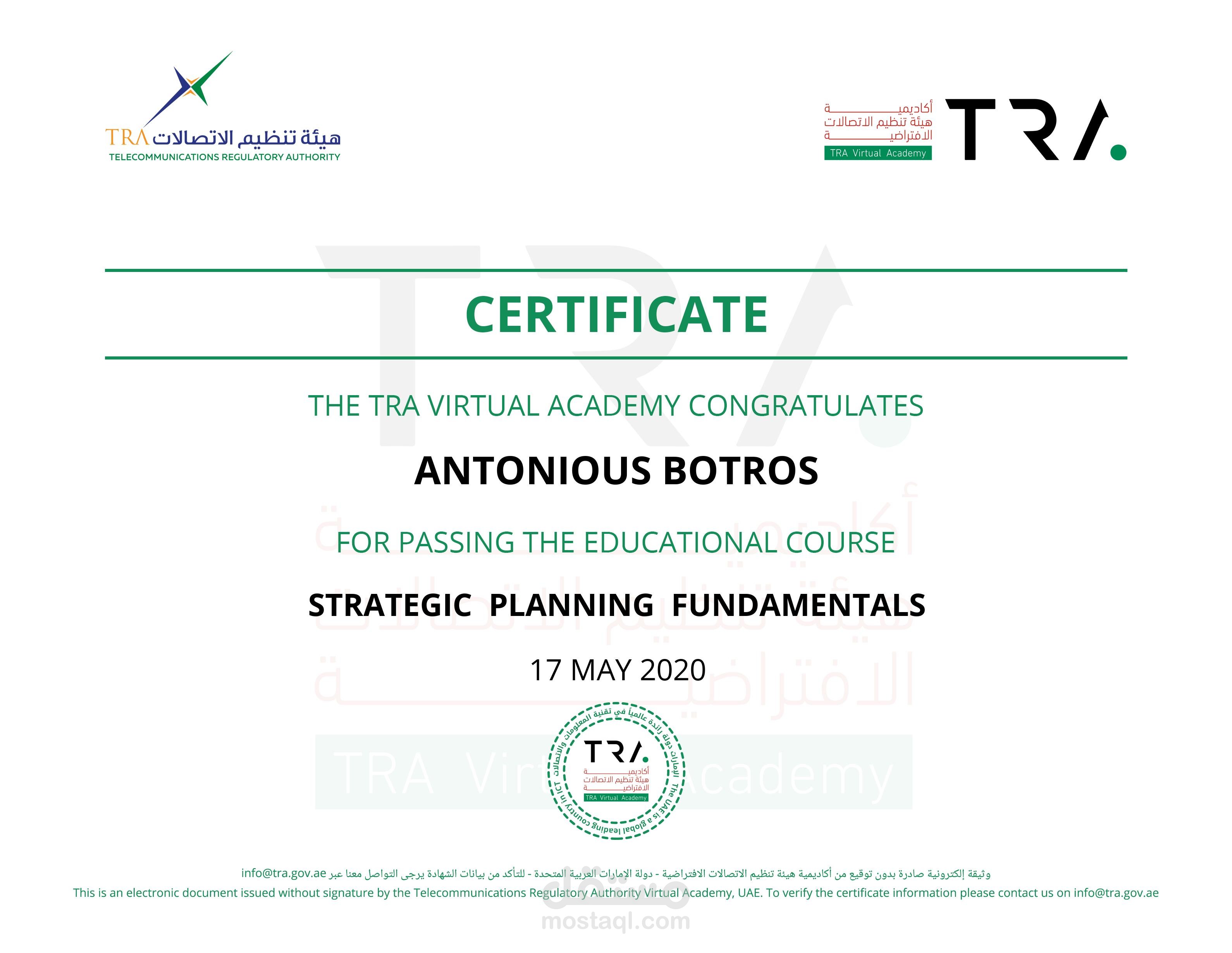 مجموعة من الشهادات التي تم الحصول عليها مؤخرا في مجال الريادة والتخطيط الأستراتيج والتسويق وادارة محركات البحث