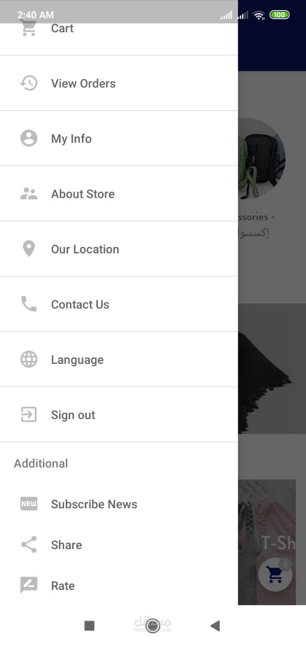 3-قائمة جانبية تحتوى اقسام التطبيق الاساسية (الرئيسية-التصنيفات-السلة-من نحن-تواصل معنا-الطلبات -بياناتى)