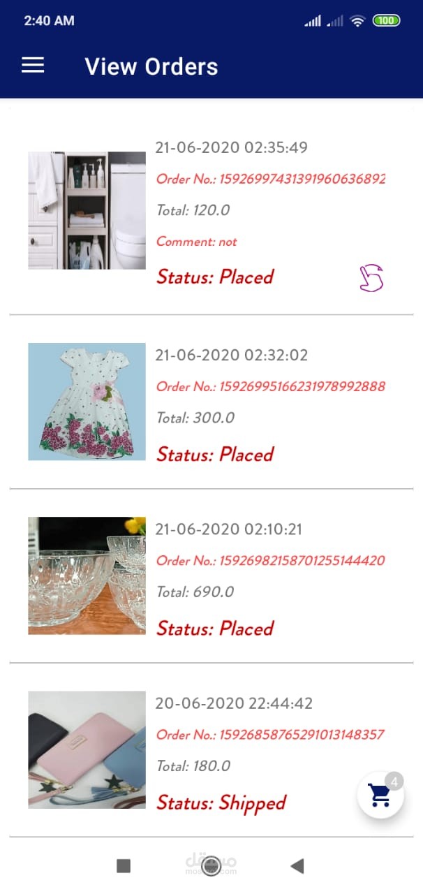 8-متابعة المستخدم لحالة الطلب فى صفحة الطلبات وارسال اشعارات بها (يتم تجهيزه - فى الطريق اليك - تم الاستلام)