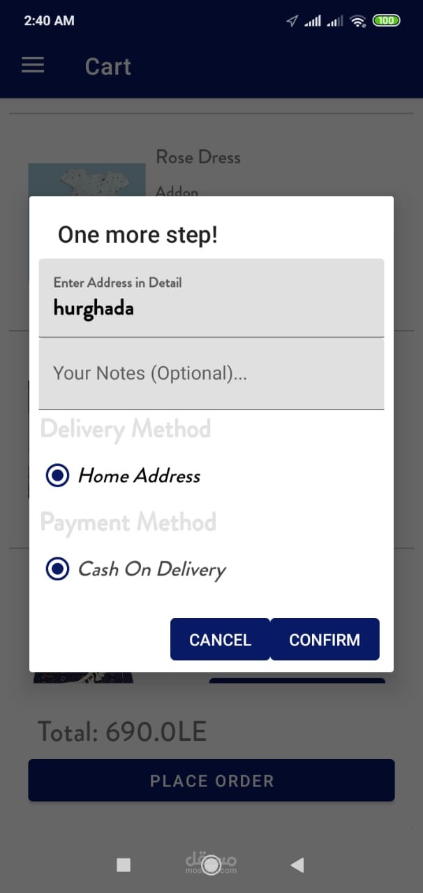 7-خيار الدفع cash on delivery عند الاستلام وامكانية ارسال ملاحظات مع الاوردر وتحديد العنوان كتابا وايضا عن طريق الGPS , + تختيار المدينة ولكل مدينة تكلفة توصيل قابلة للتغير والاضافة