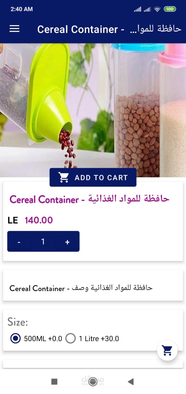 4-صفحة المنتج تحتوى صورة وعنوان ووصف لكل منتج مع امكانية اضافة خيار لاضافة احجام مختلفة للمنتج