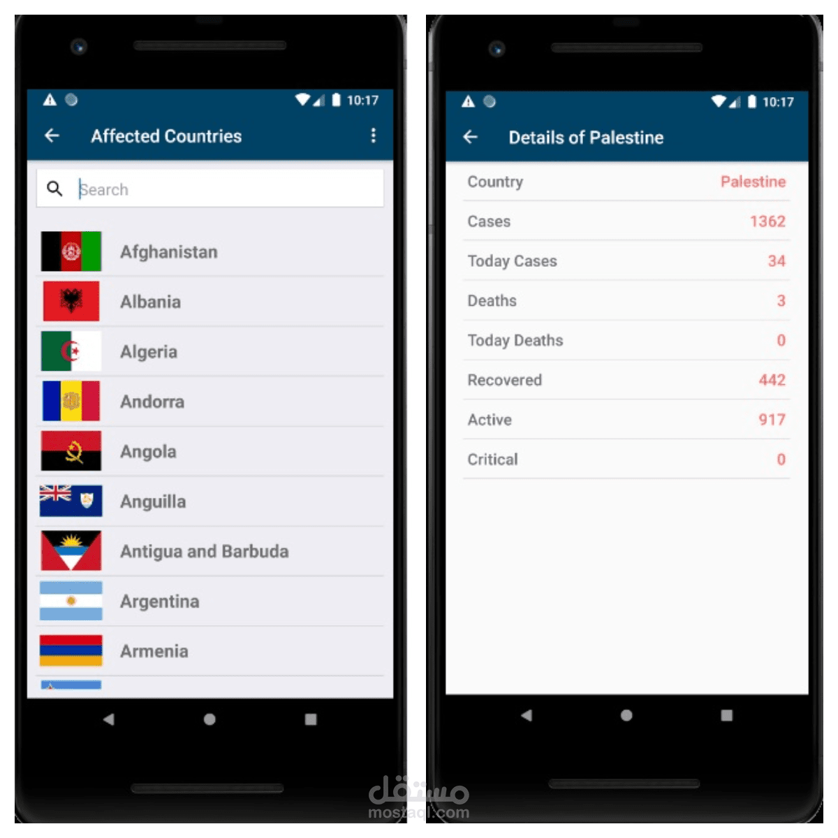 التطبيق عبارة عن عرض لإحصائيات فايروس كورونا بالعالم وهناك واجهة لعرض احصائيات كورونا حسب الدولة المختارة من خلال API, كما أنه يعرض لمحة بسيطة عن كورونا وفيديو من خلال Firebase Database بالإضافة لوجود Chat بالتطبيق تم عمله عن طريق Firebase Realtime Messaging.