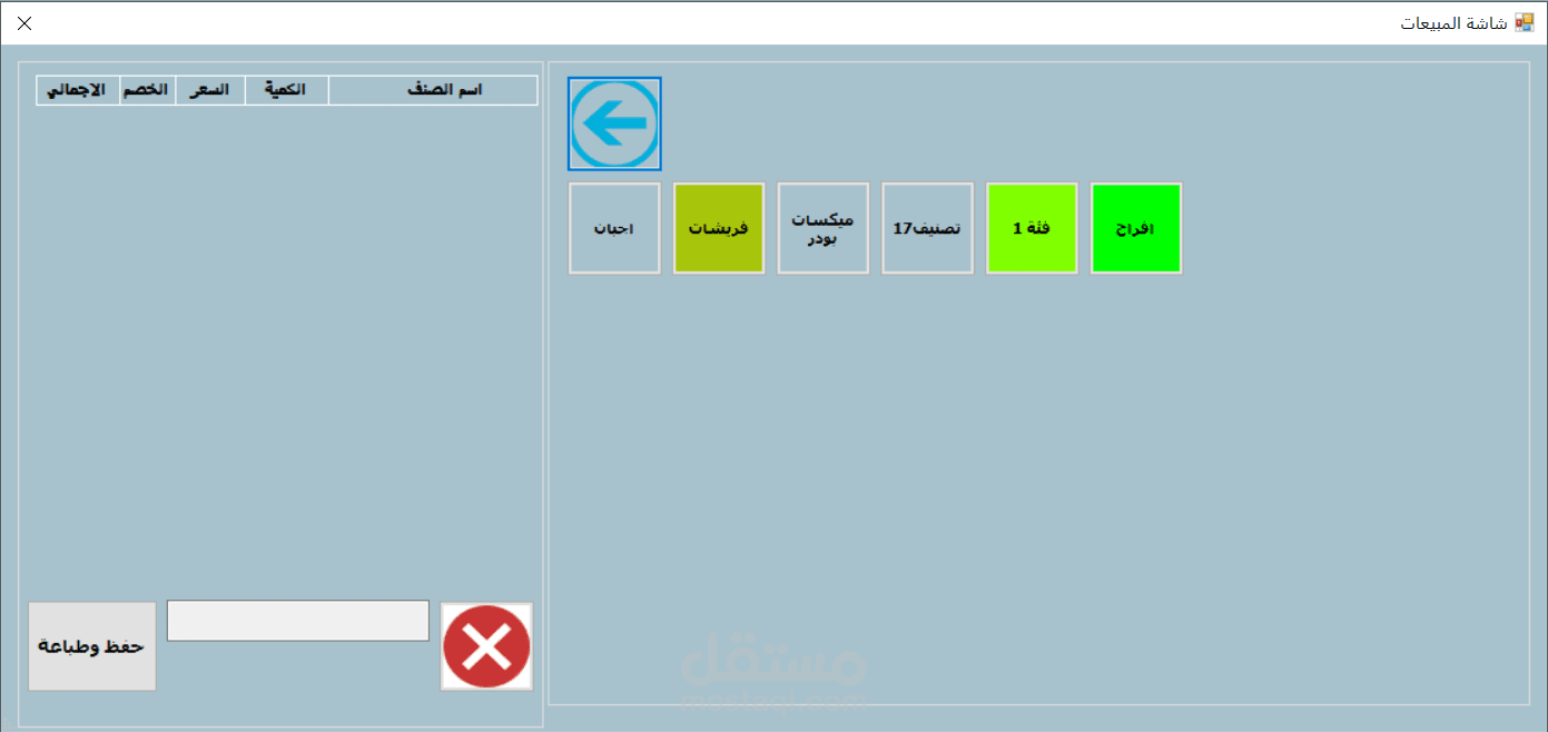 الهدف من البرنامج هو البيع فقط من خلال شاشة تاتش لذلك تم الاهتمام بالسهولة والحجم المناسب مع الشاشه المستخدمة ودقتها حتي يتم العمل باريحية تامة