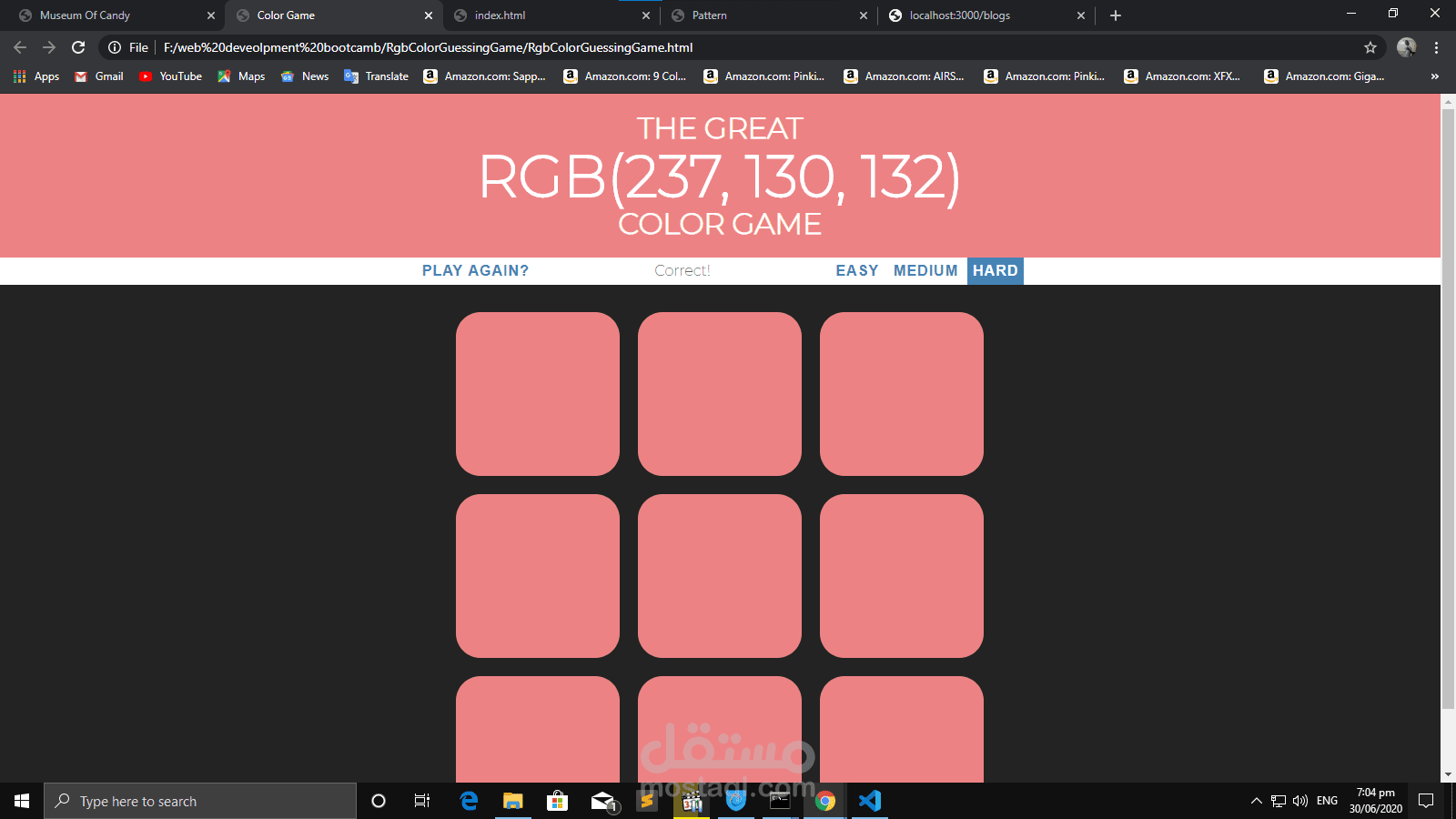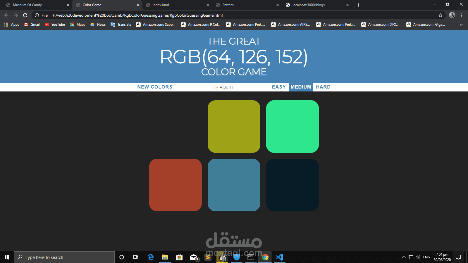 عبارة عن لعبة خلط الوان باستخدام الكمبيوتر مصممة ب (javascript , html , css) تعرض لك رقم لون خليط بين الاحمر والاخضر والازرق وانت تخمن اللون الصحيح من الالوان التحت لو اخترت اللون صح تظهر لك عبارة correct ! وتتحول جميع الالوان لللون الصحيح اما اذا اخترت اللون غلط تظهر لك عبارة try again ويختفي اللون الخطأ بأنميشن fade ويمكن ضغط زر play again لعرض لون جديد وبها عدة مستويات Easy , Medium, Hard