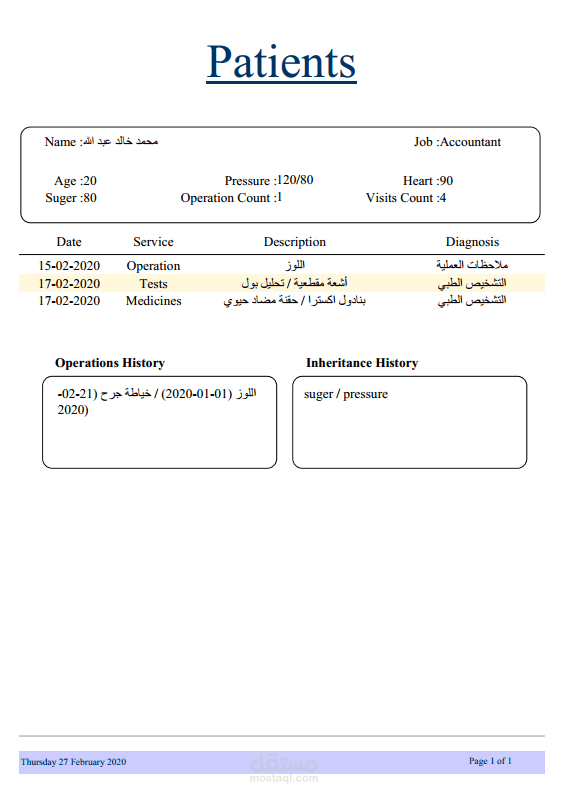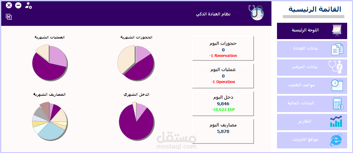 البرنامج جاهز ومتاح وهو نظام للعيادات الخاصة ، متكامل فيه خصائص كثيرة يمكن اختيار أي منها وجميعها مترابطة كسجلات وحركات (أي حركة مالية أو زيارة او عملية ) مع التقارير ومتوفر باللغتين العربية والانجليزية .. يمكن التعديل عليه حسب احتياج العميل ..