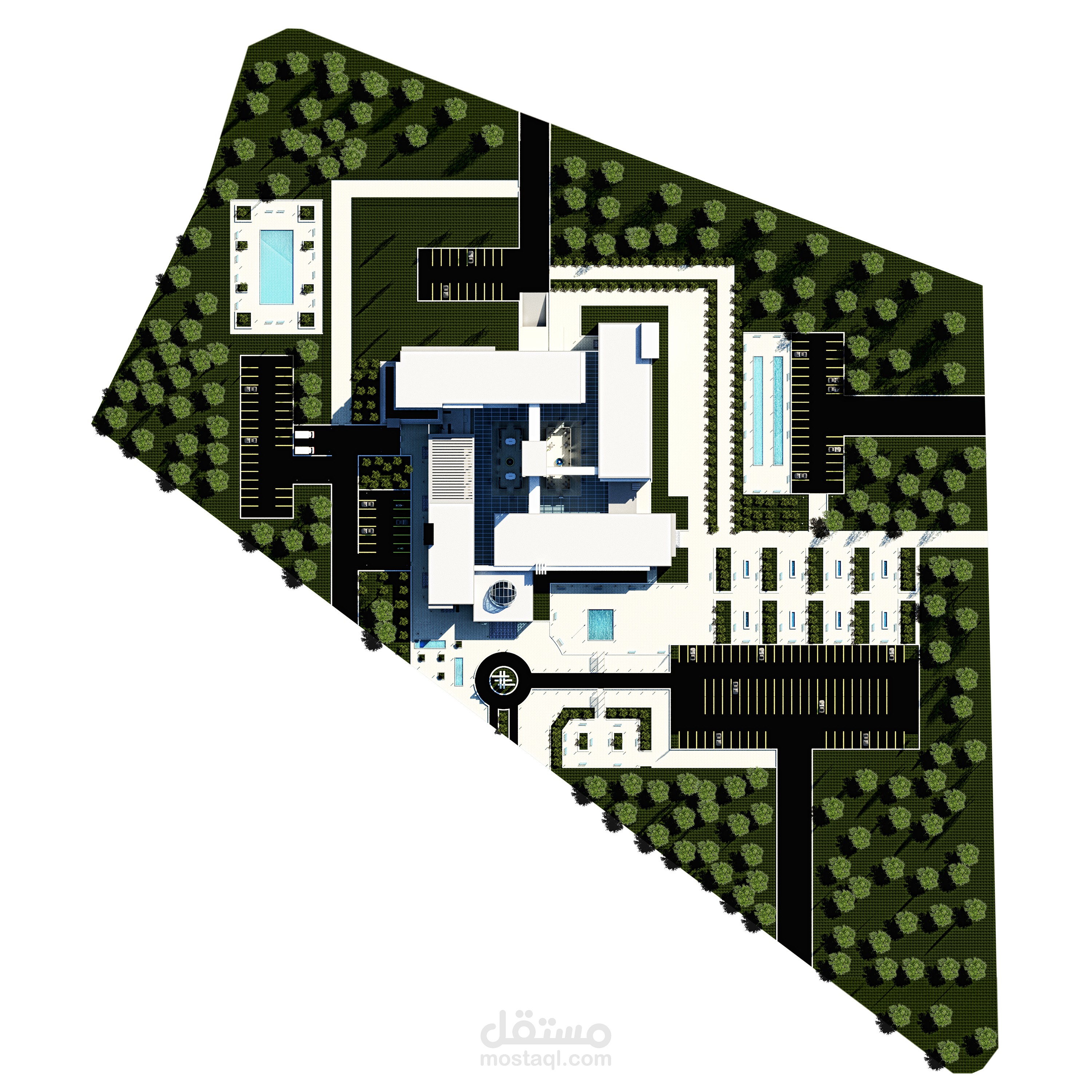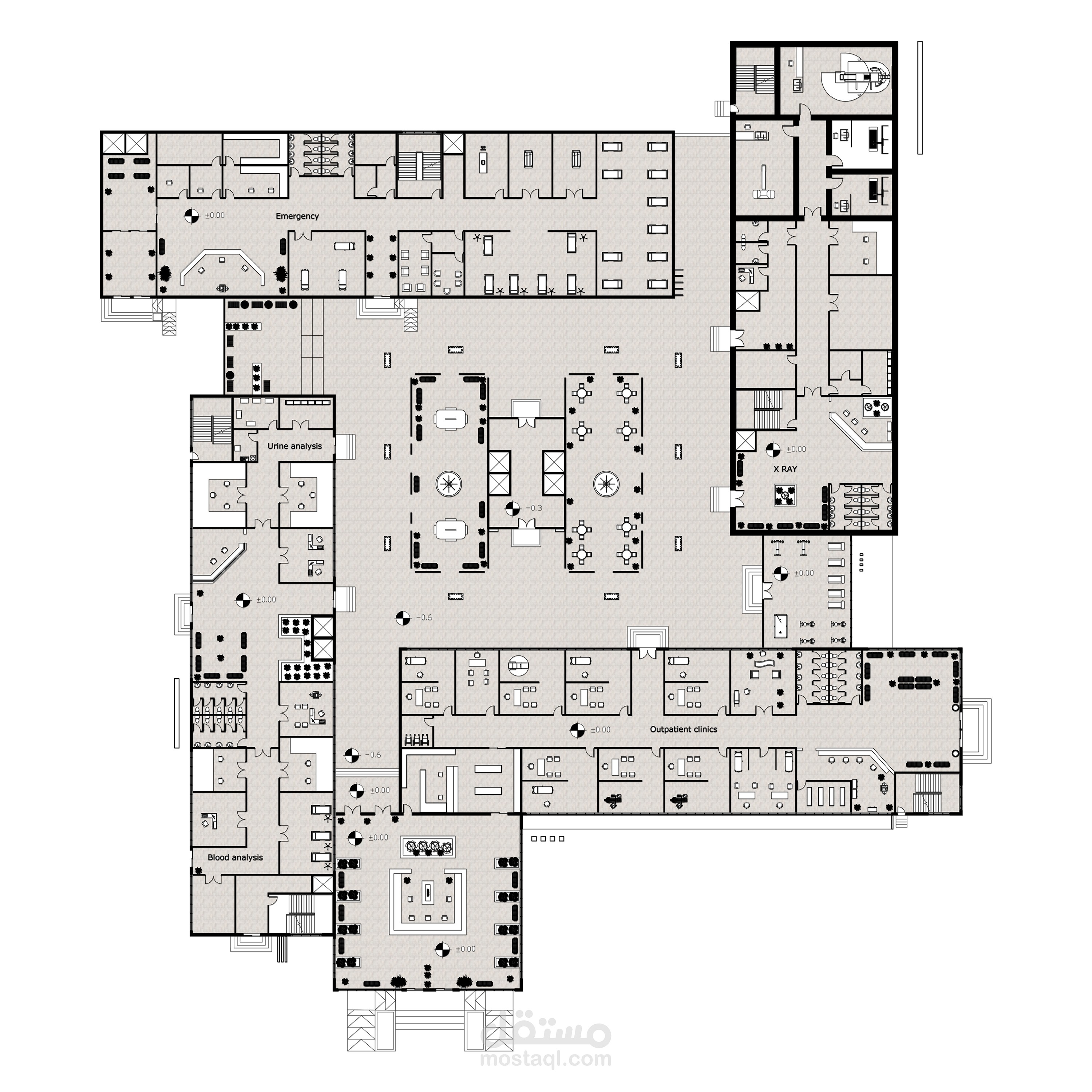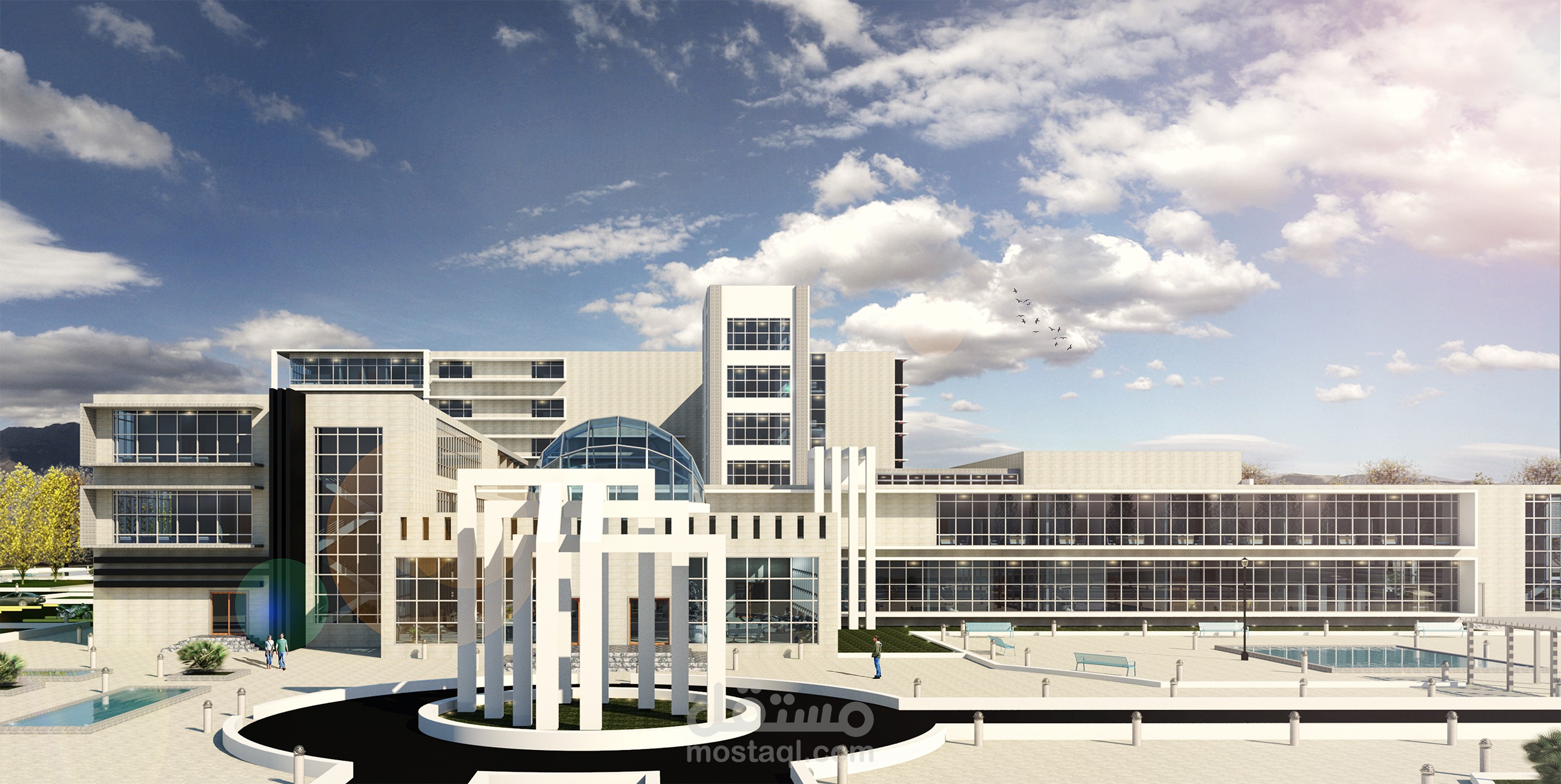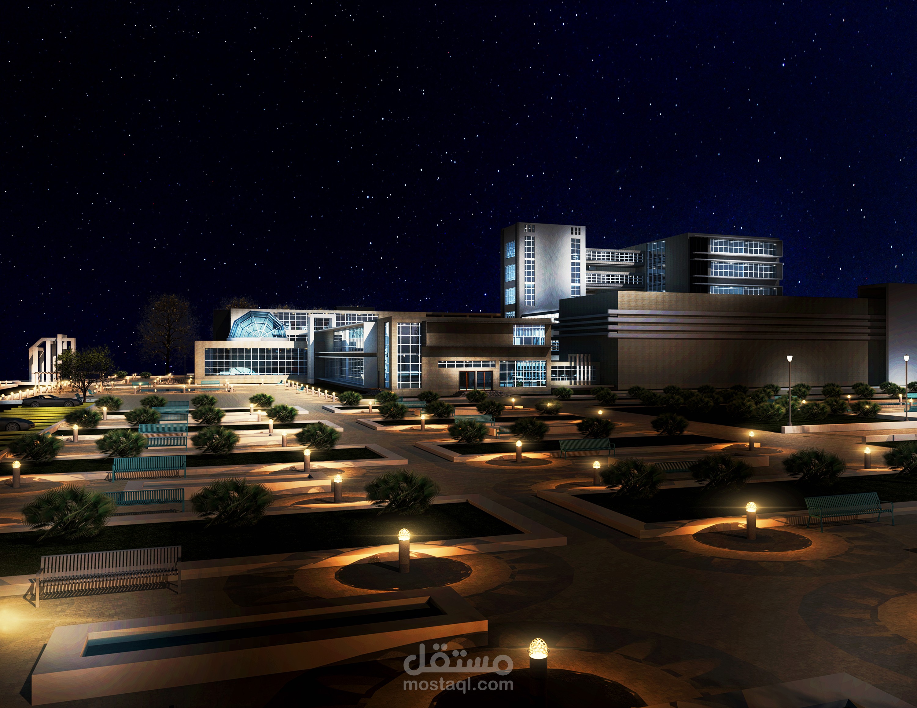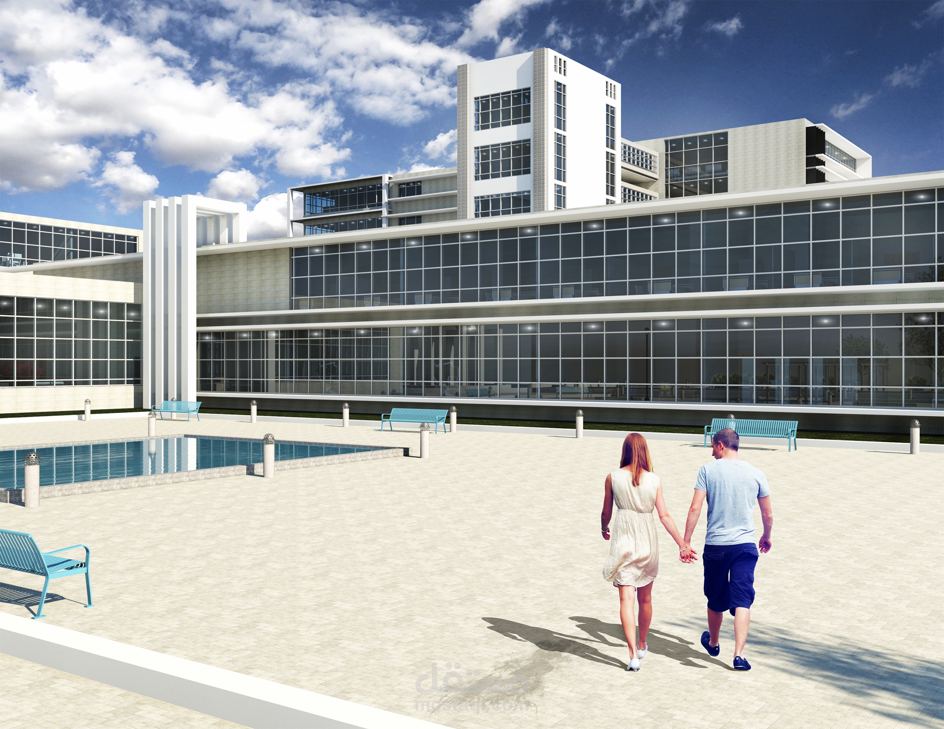 تصميم المستشفى من اربع مباني مرتبطه مع بعضها بشكل عامودي تم الفصل بينهم بما يتم بكل مبنى من فعاليات متشابهه