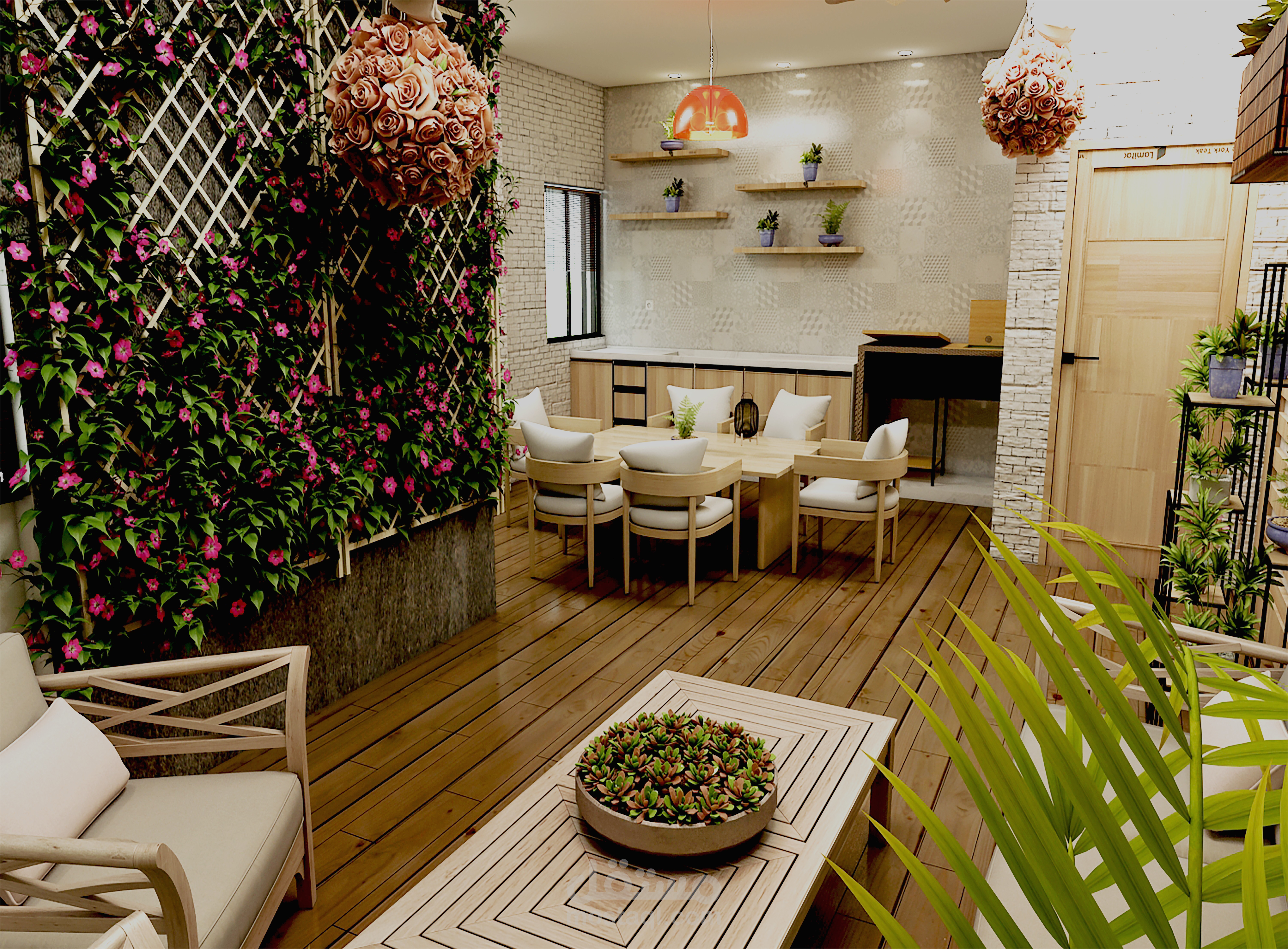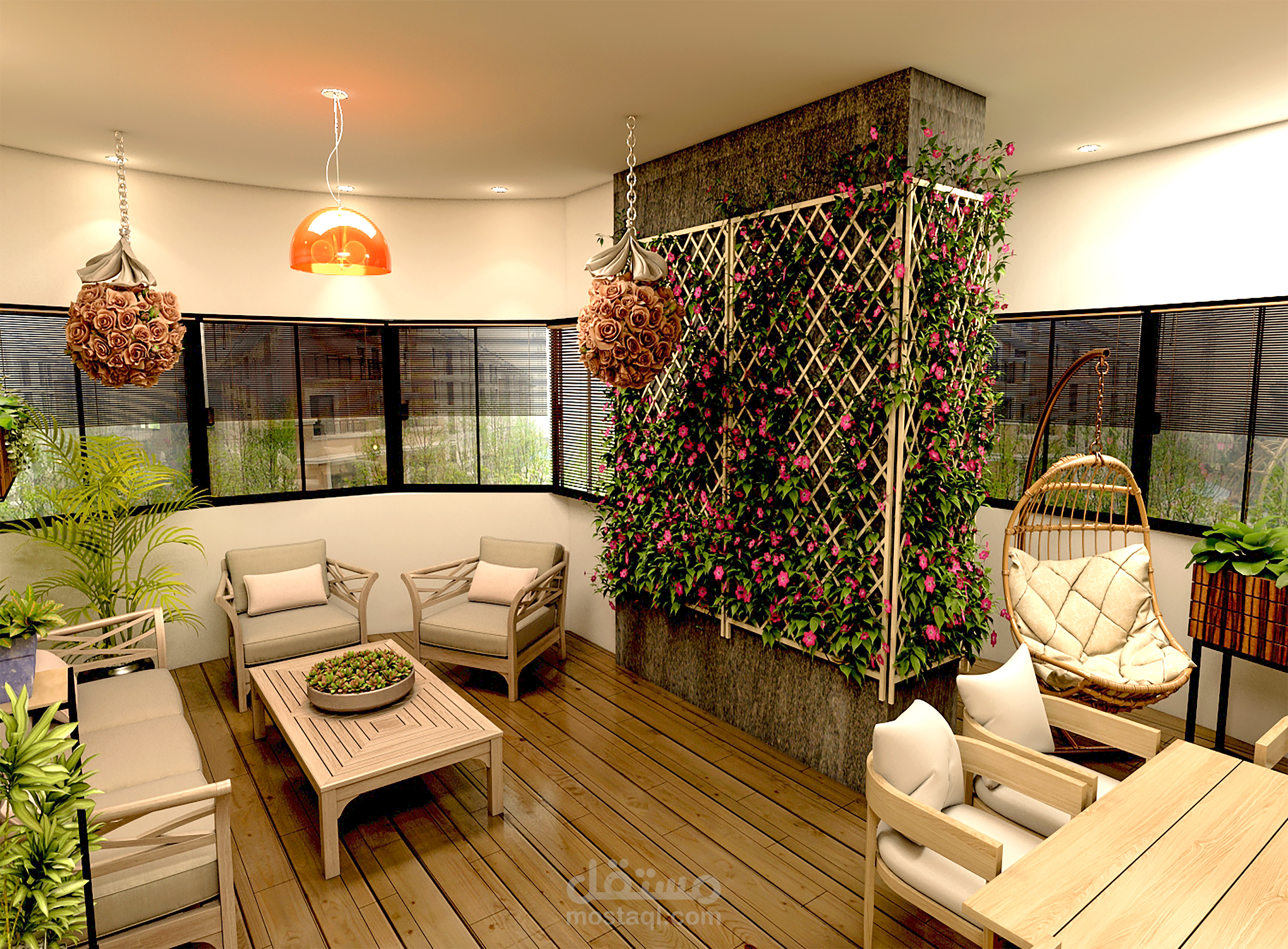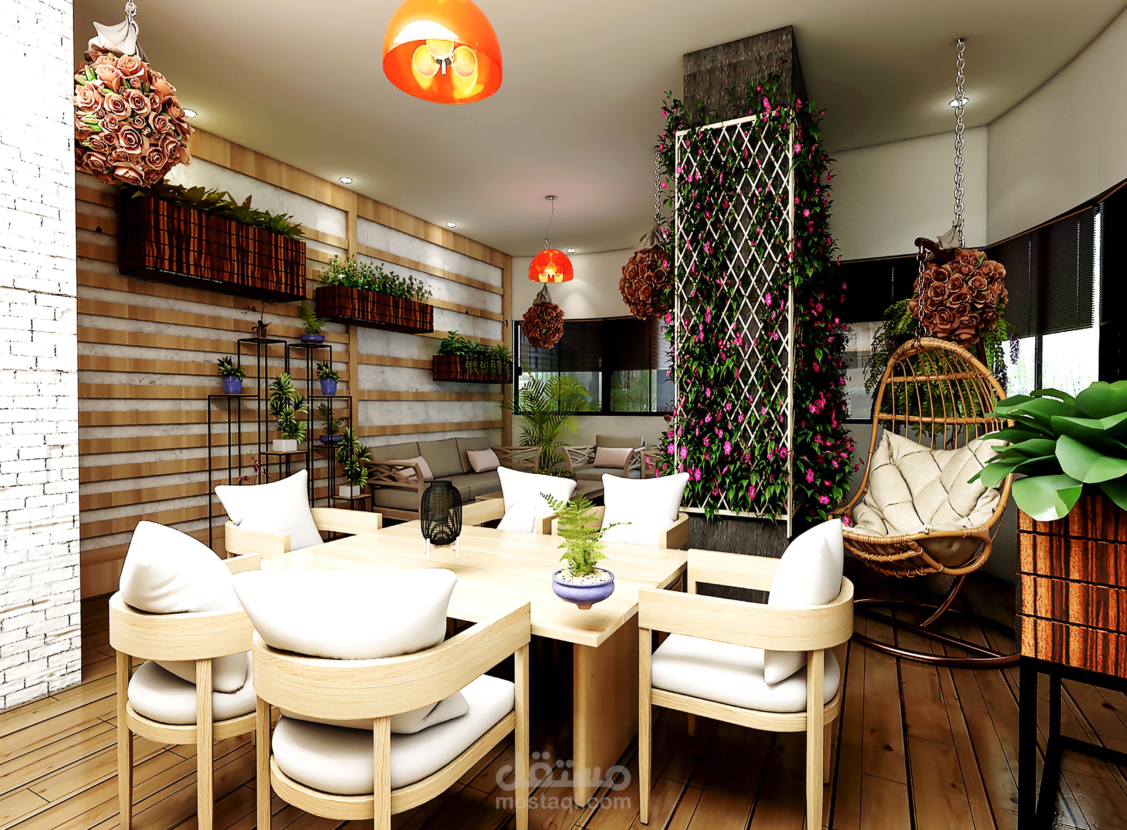 تراس حيث الذوق الرفع والألوان المتناسقة والمناسبة والاضاءة المناسبة .