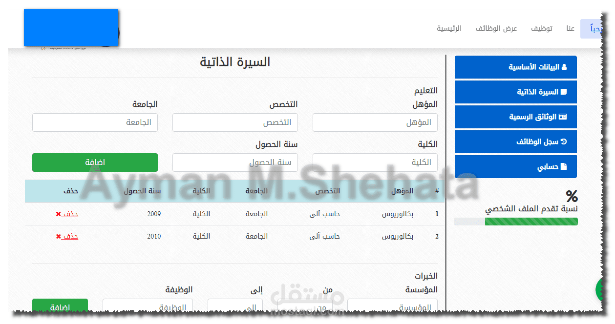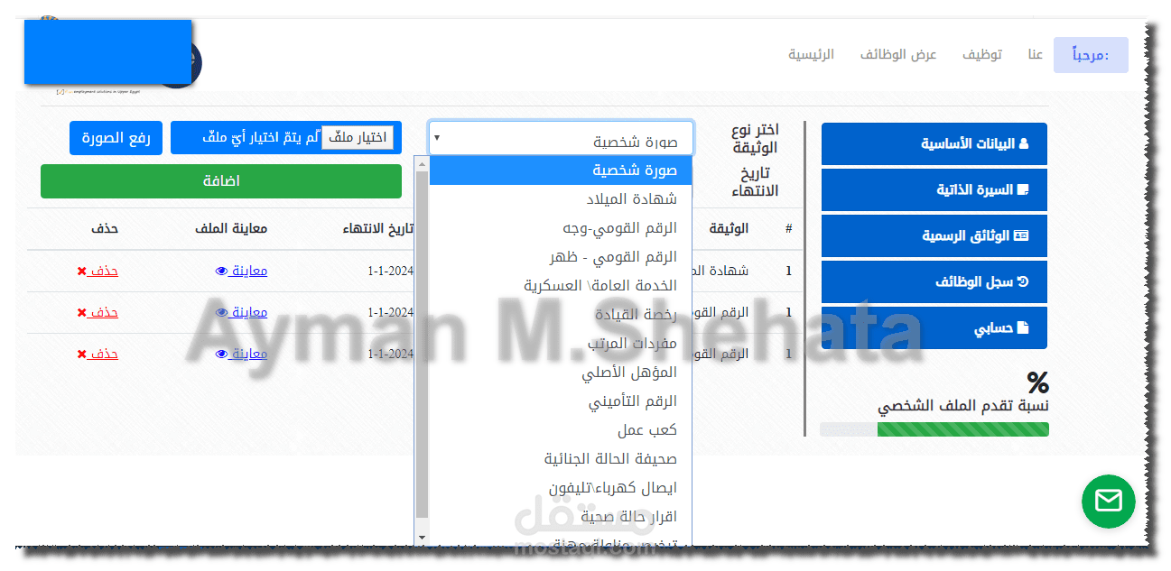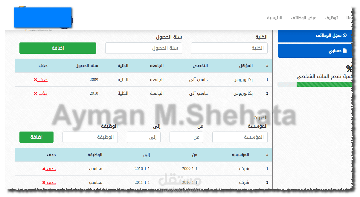 موقع وسيط بين الشركات والمتقدمين للوظائف ، يمكن للشركات طرح الوظائف المطلوبة ، والمستخدمين يتقدموا لشغل هذه الوظائف ، يتم فرز الطلبات حسب الخبرات والشهادات العلمية ، ويوجد لايف شات بالموقع لاجراء المقابلة الشخصية (فيديو) ، الموقع مخصص في مصر يقوم باستخراج البيانات من الرقم القومي كتاريخ الميلاد والسن ومحافة الميلاد