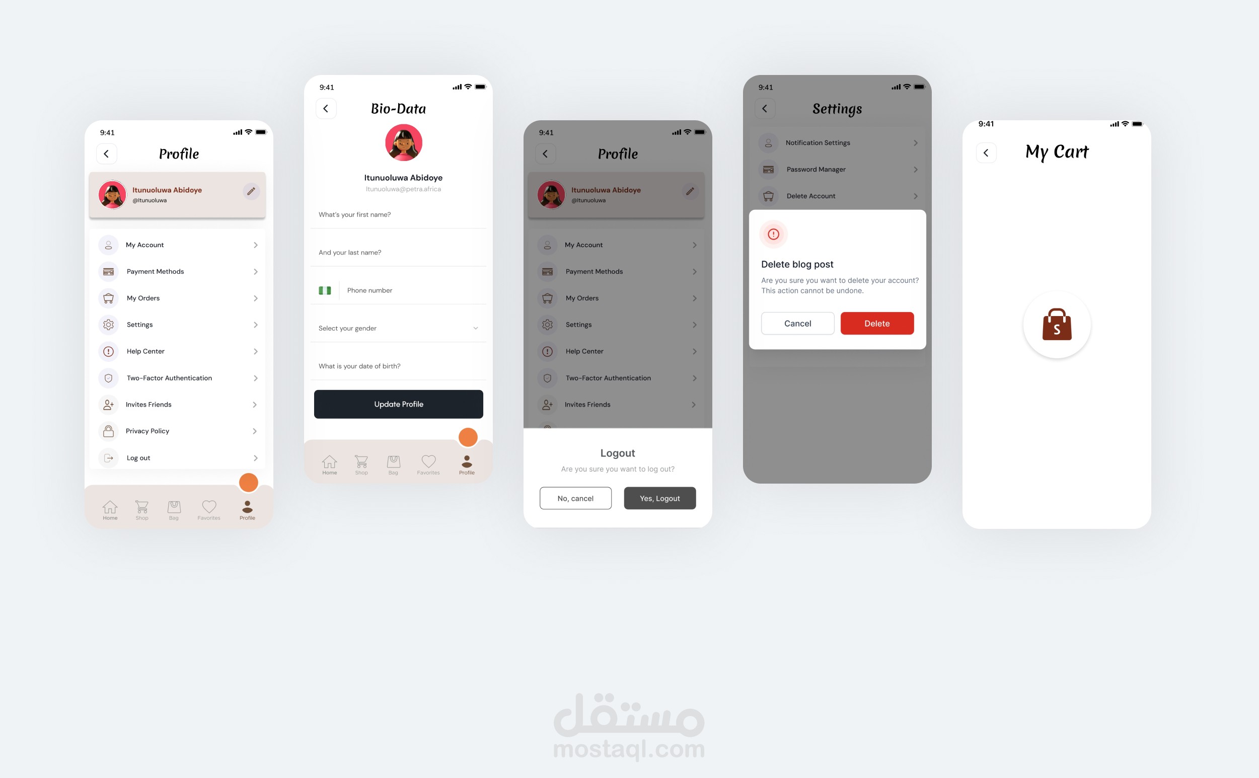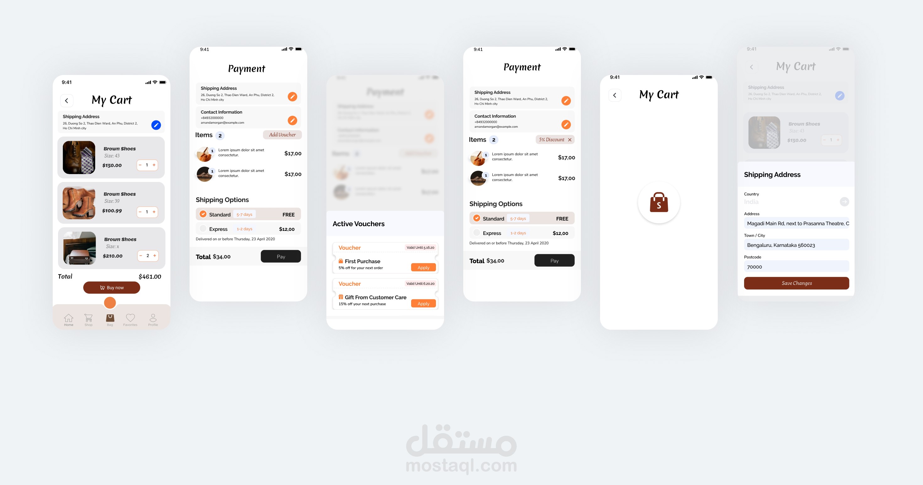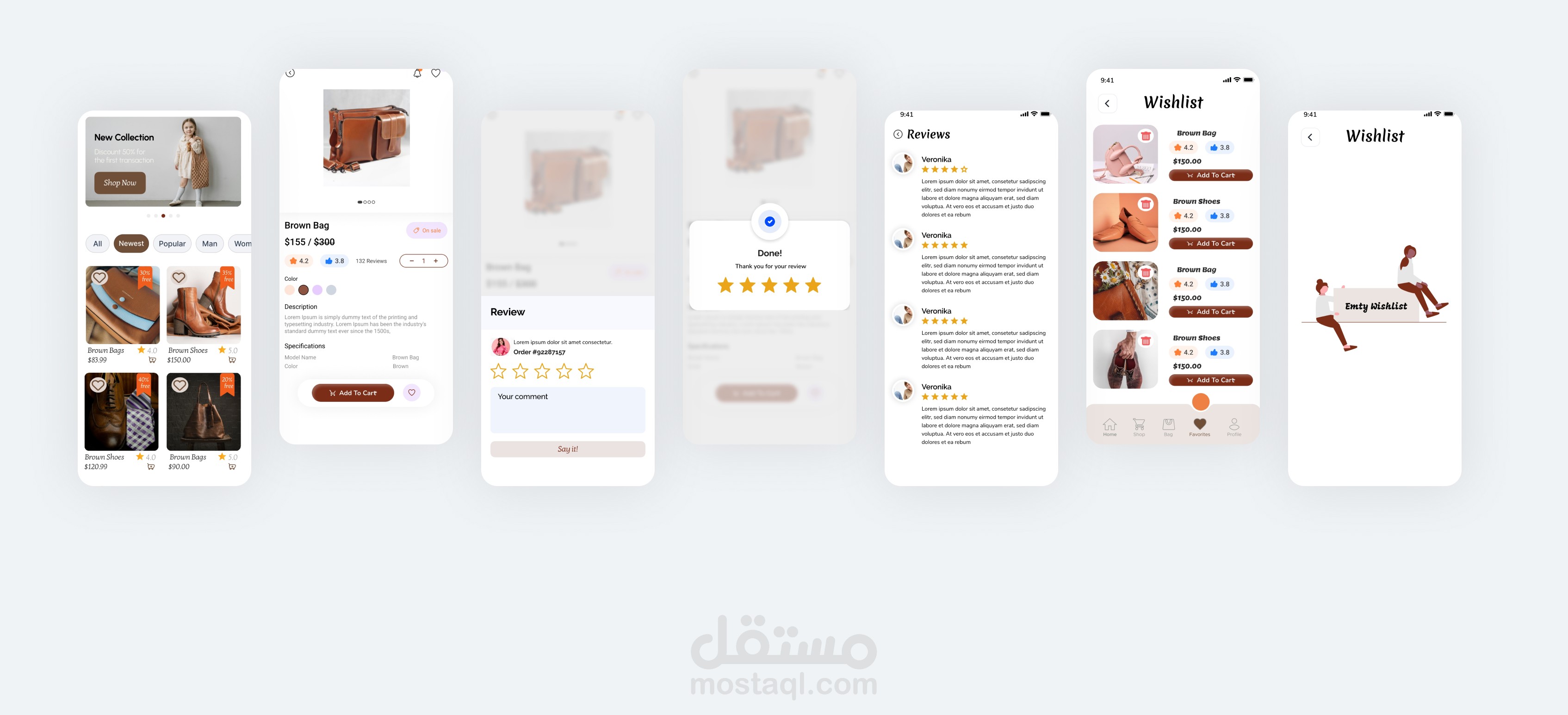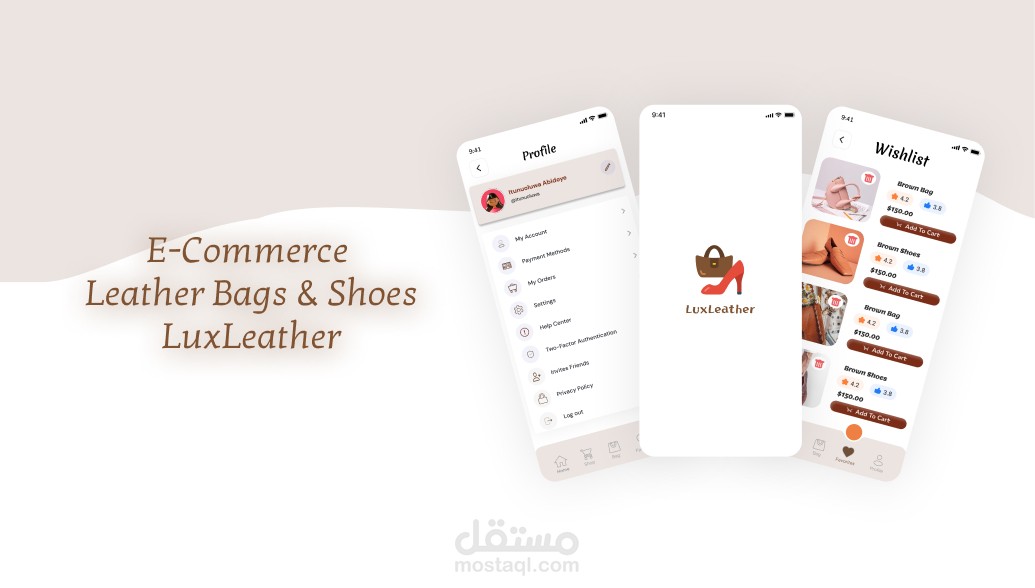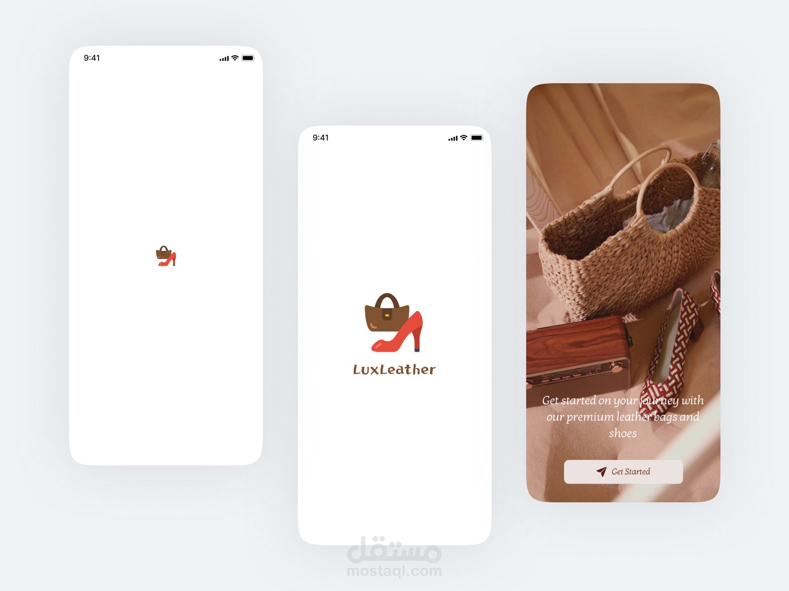 The Leather Bags and Shoes mobile app UI is designed with key features including: