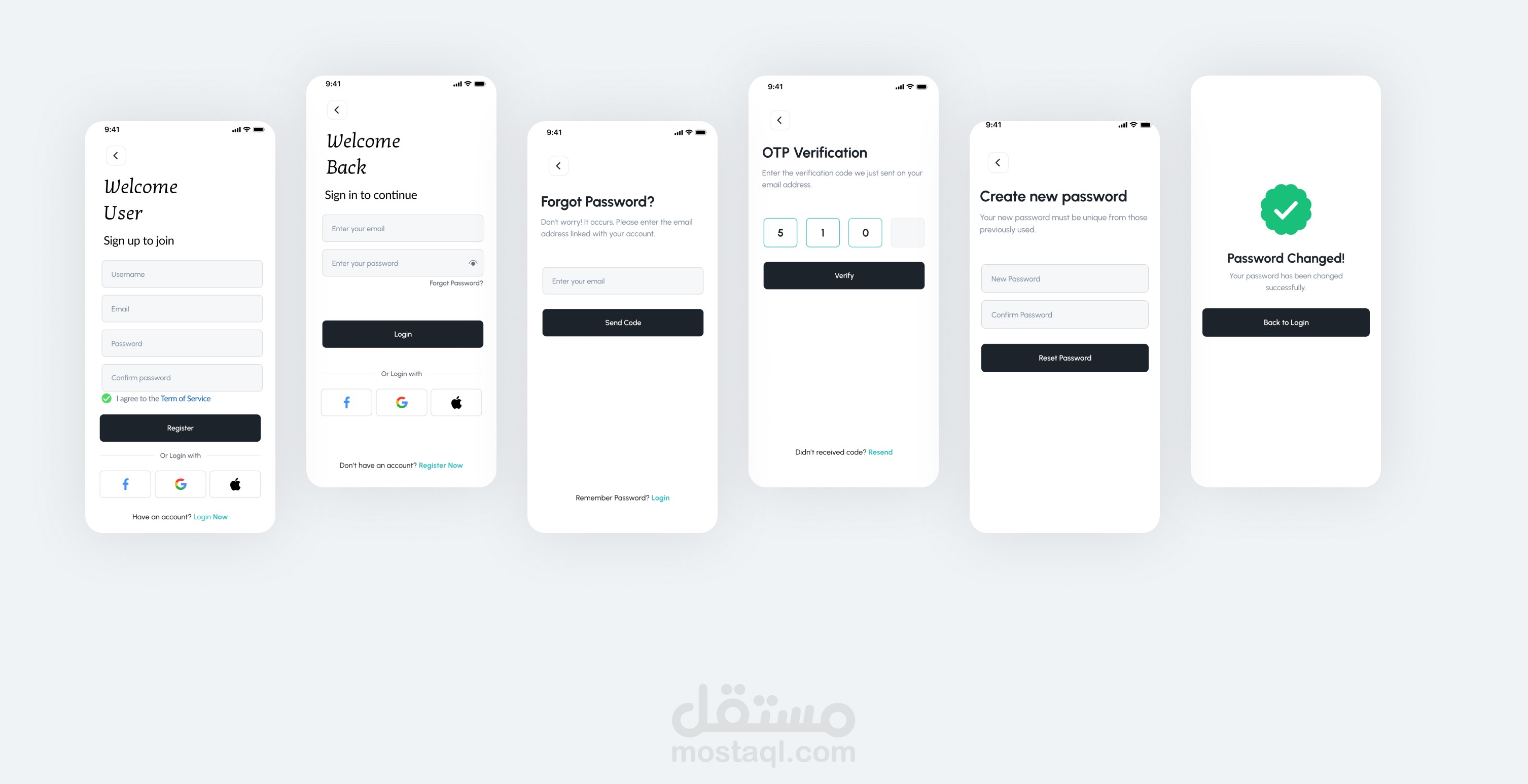 Login/Registration: Clean and simple interfaces for users to securely sign in or create an account, with options for social login and password recovery.