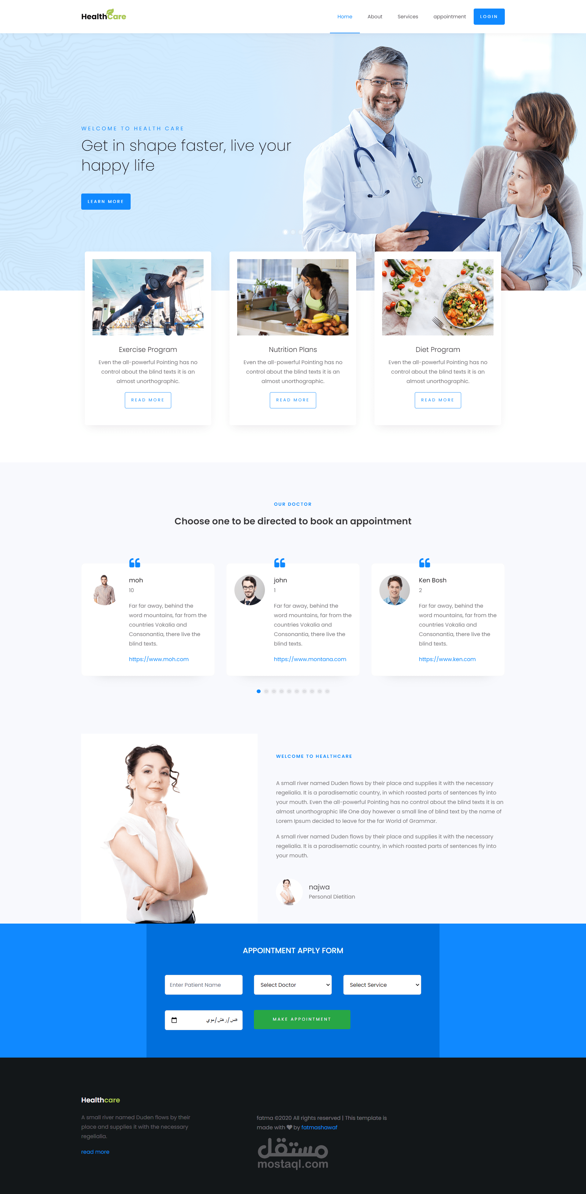 تطبيق ويب + موقع يمكن المريض من الحجز من خارج العيادة ويتم تأكيد حجزه داخل العيادة ويعرض الحجوزات عند كل دكتور وعددها وامكانية طباعة تقرير خاص بالمرضى واضافة خطة للمرضى الفترة المحددة لهم