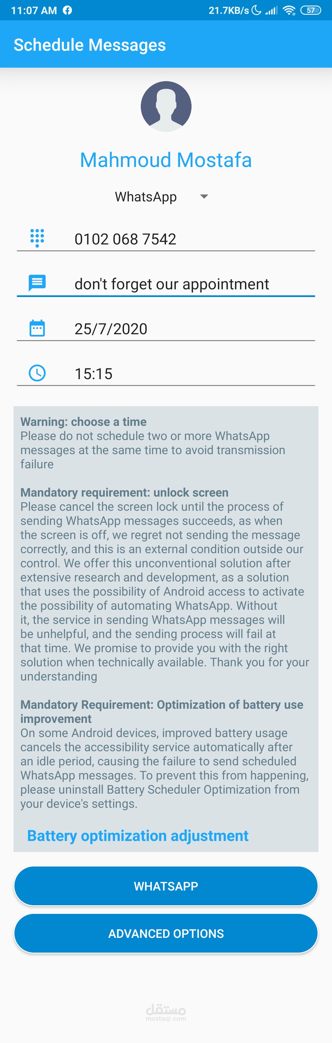 على سبيل المثال: جدولة رسائل Whats-app باستخدام برنامج جدولة Whats-app لتذكير عائلتك باللقاءات المهمة والأعمال الروتينية.