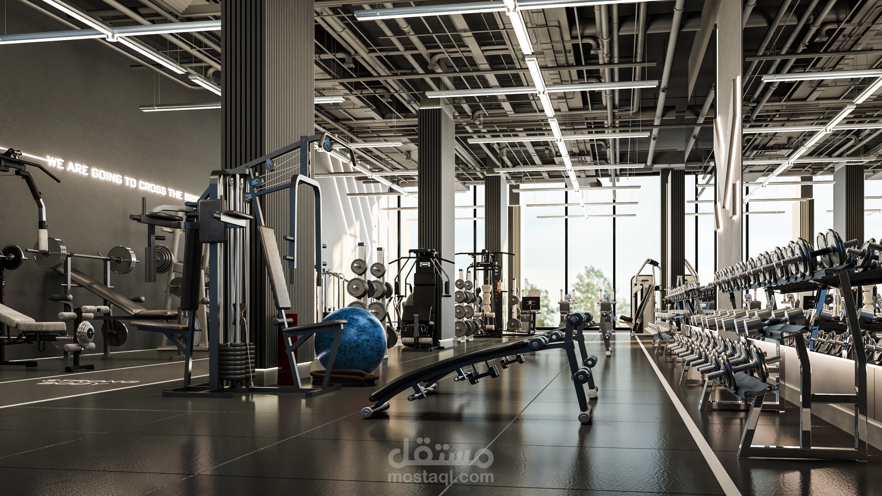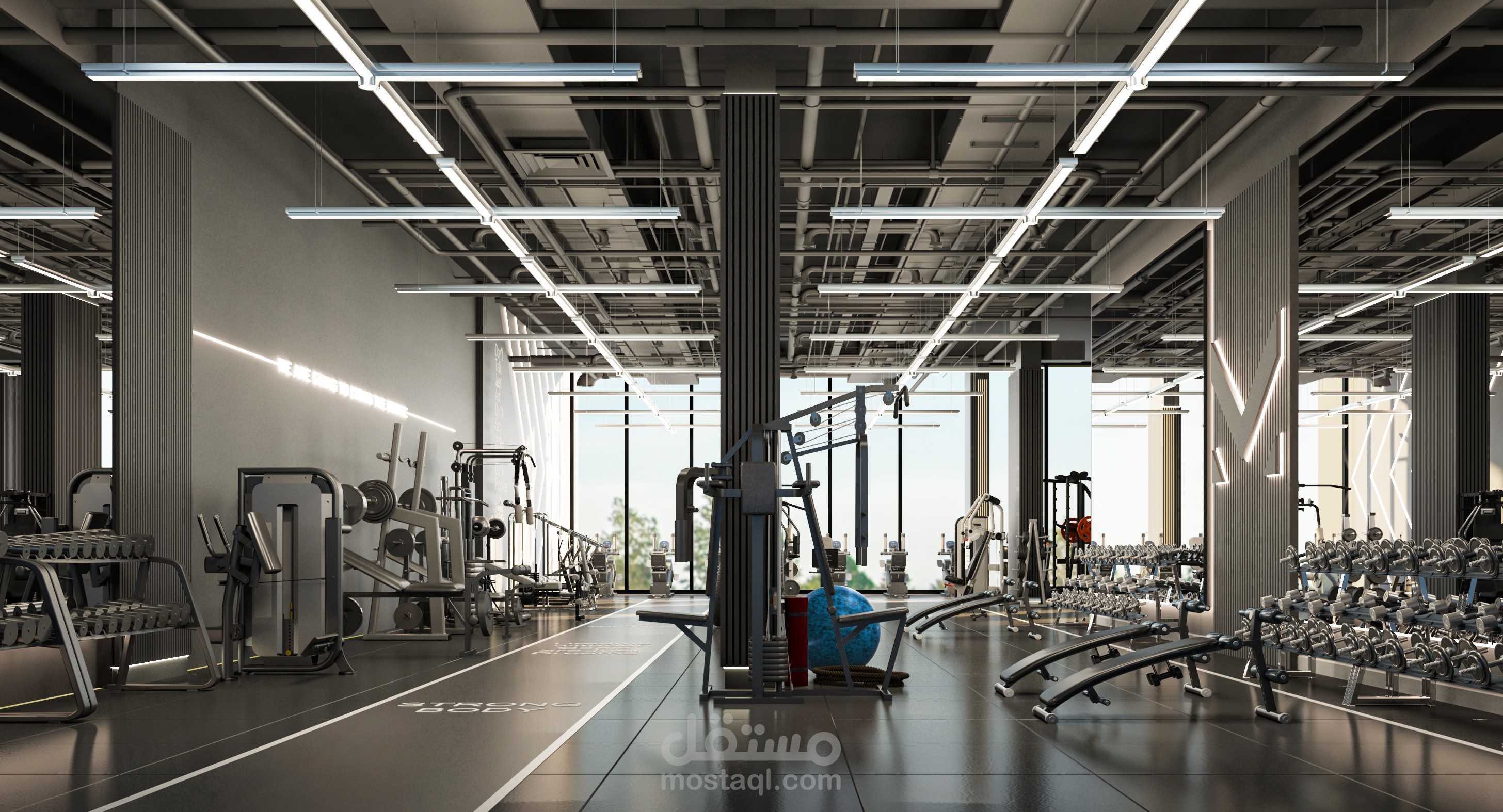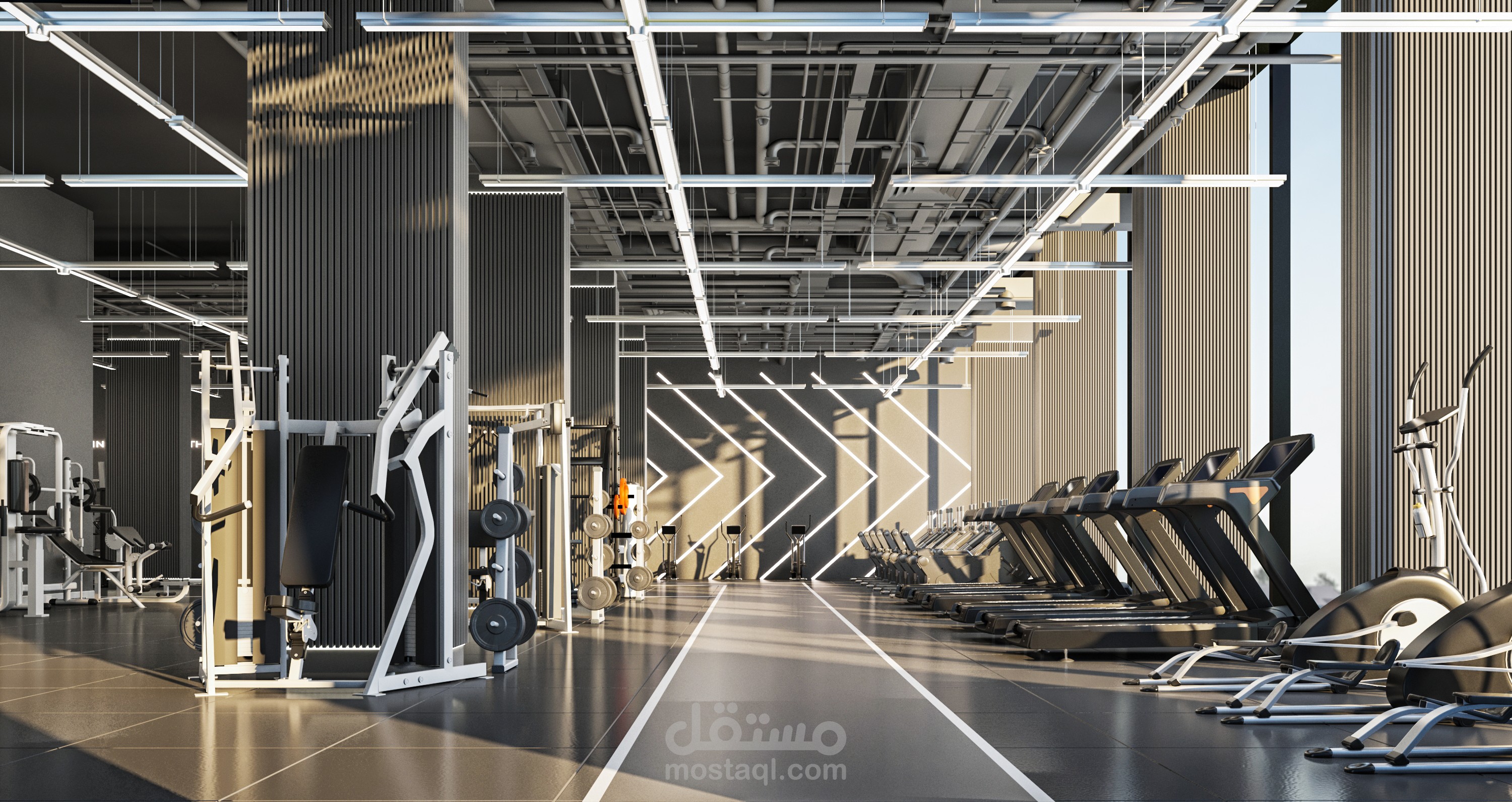 تصميم نادي رياضي على الاسلوب الصناعي (Industrial style ) في فندق مزارين , مدينة العالمين بمساحة 180 متر مربع.
