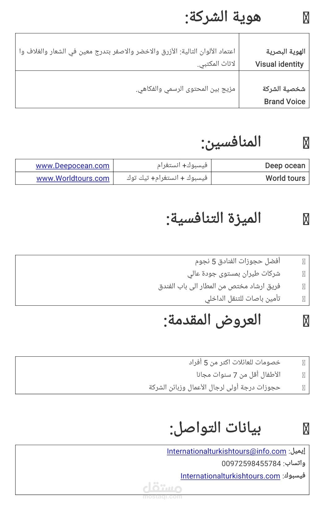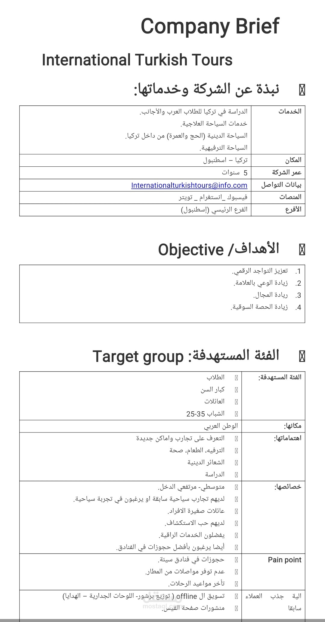 البريف الخاص بشركة سياحية تعمل في تركيا ركز البريف على تجميع المعلومات الاساسية حول الشركة واهدافها وفئتها المستهدفة ومنافسينها وغيرها المعلومات حيث سيتم استخدام هذه المعلومات في الحملات التسويقية بشكل تفصيلي.