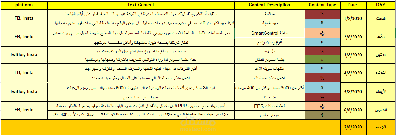 تم اعداد خطة محتوى منصات تواصل اجتماعي لمدة اسبوع لشركة بشير السكسك وشركاه