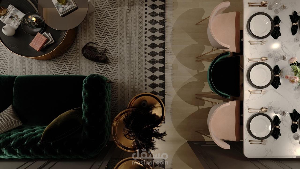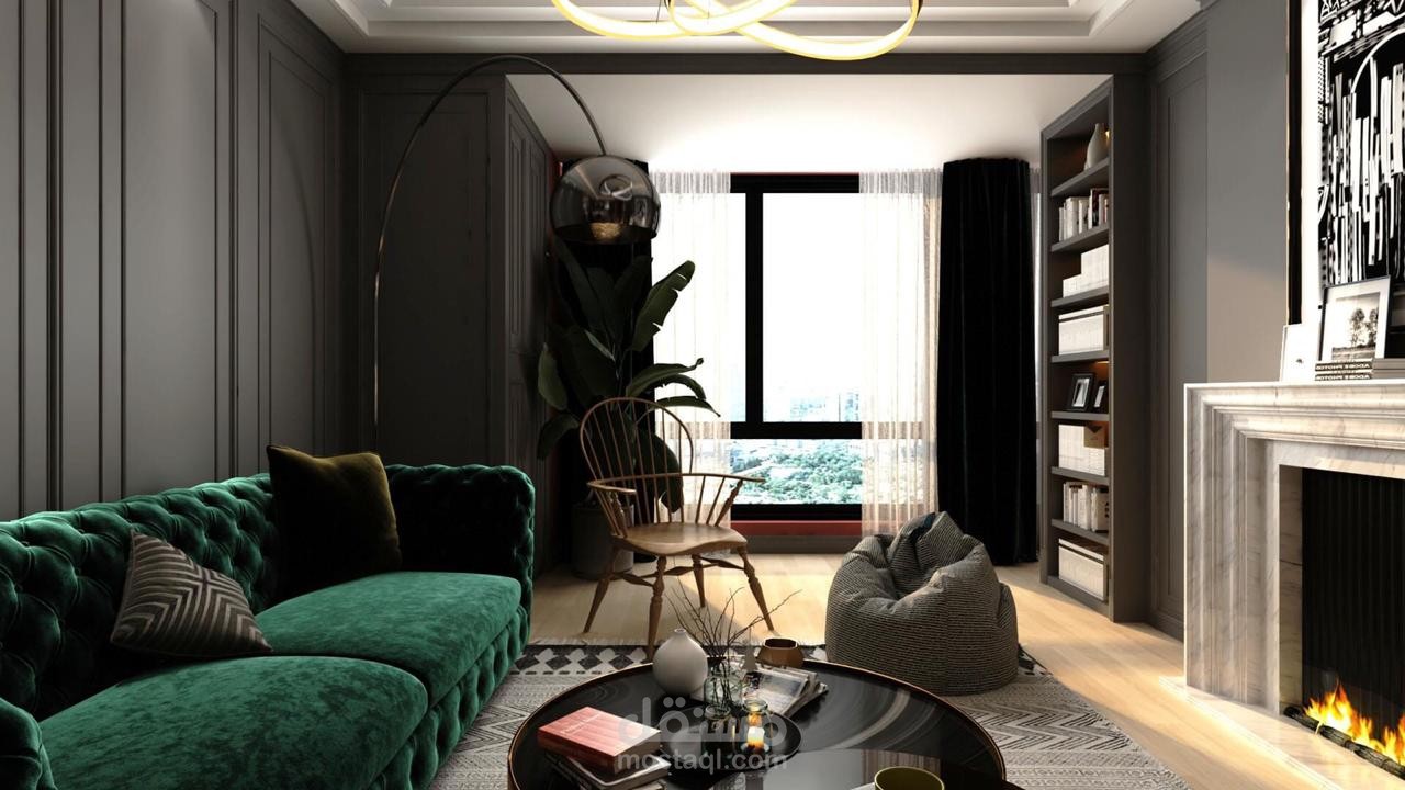 شقة ستوديو صغيره بطراز نيو كلاسيك مكونه من ريسبشن وغرفة نوم ومطبخ وحمام صغيران