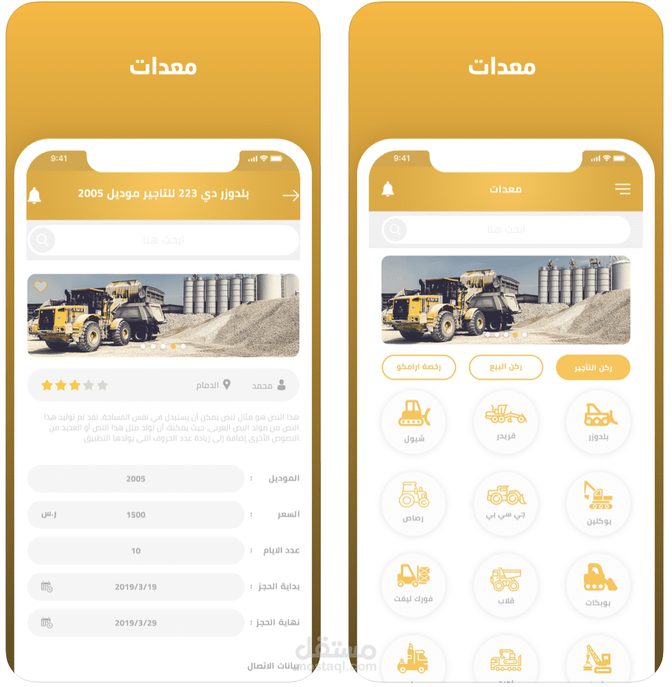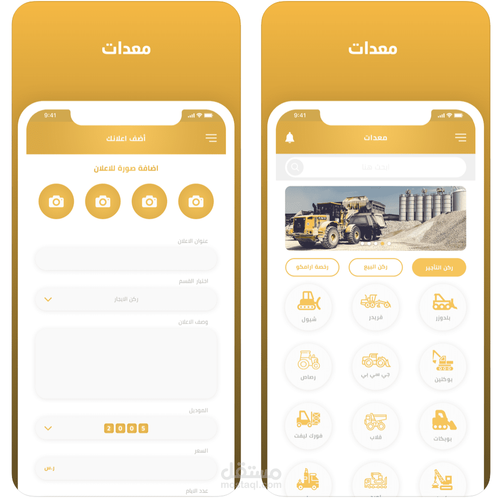 تطبيق معدات يتيح لكم الفرصة لتاجير وبيع وشراء المعدات الثقيلة بجميع أنواعها كما انه يوجد معدات بمواصفات ارامكو السعودية وشركة سابك وكذالك نقل وتوصيل المعدات الثقيلة لجميع مناطق المملكة العربية السعودية. الرابط للاندرويد : https://play.google.com/s...