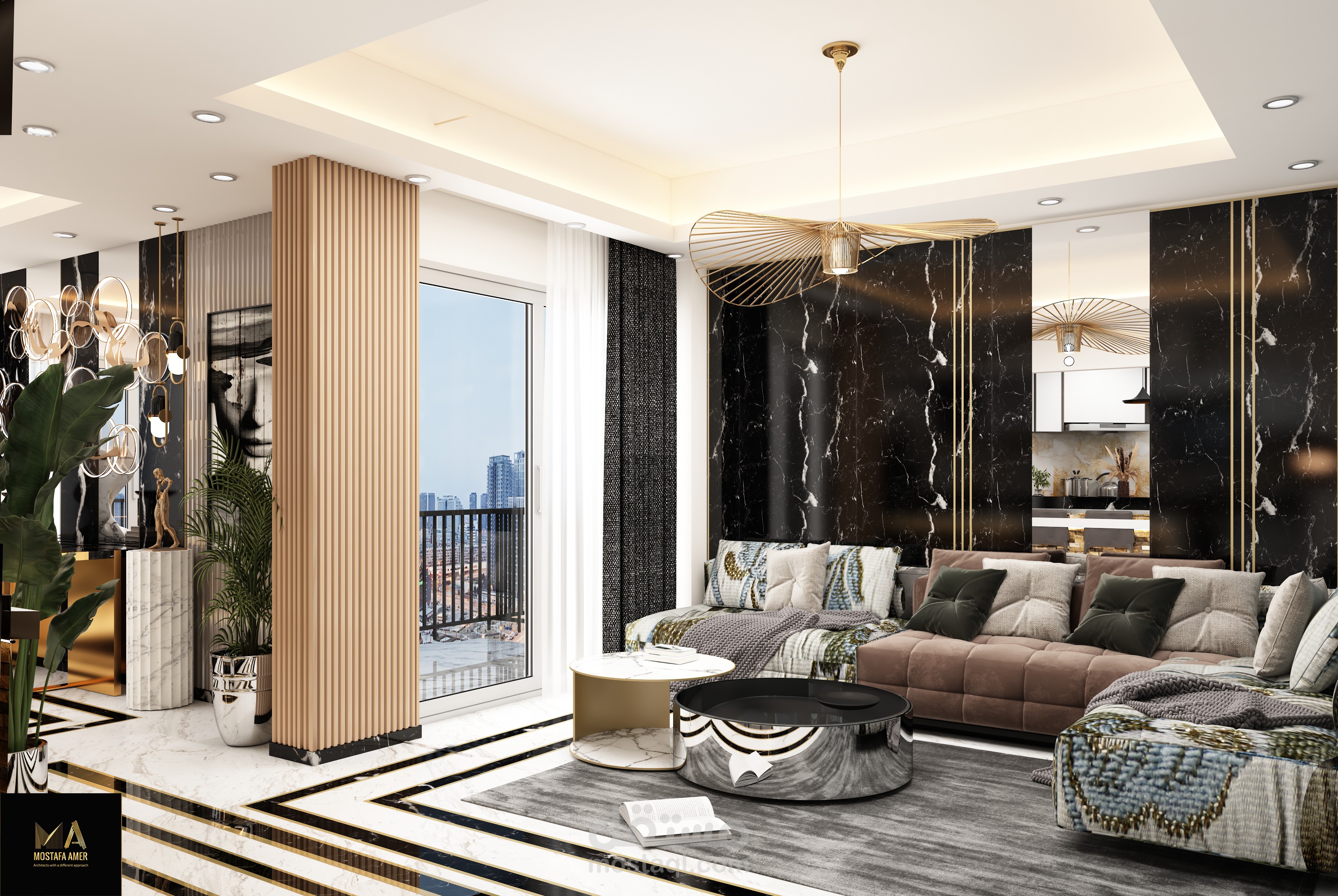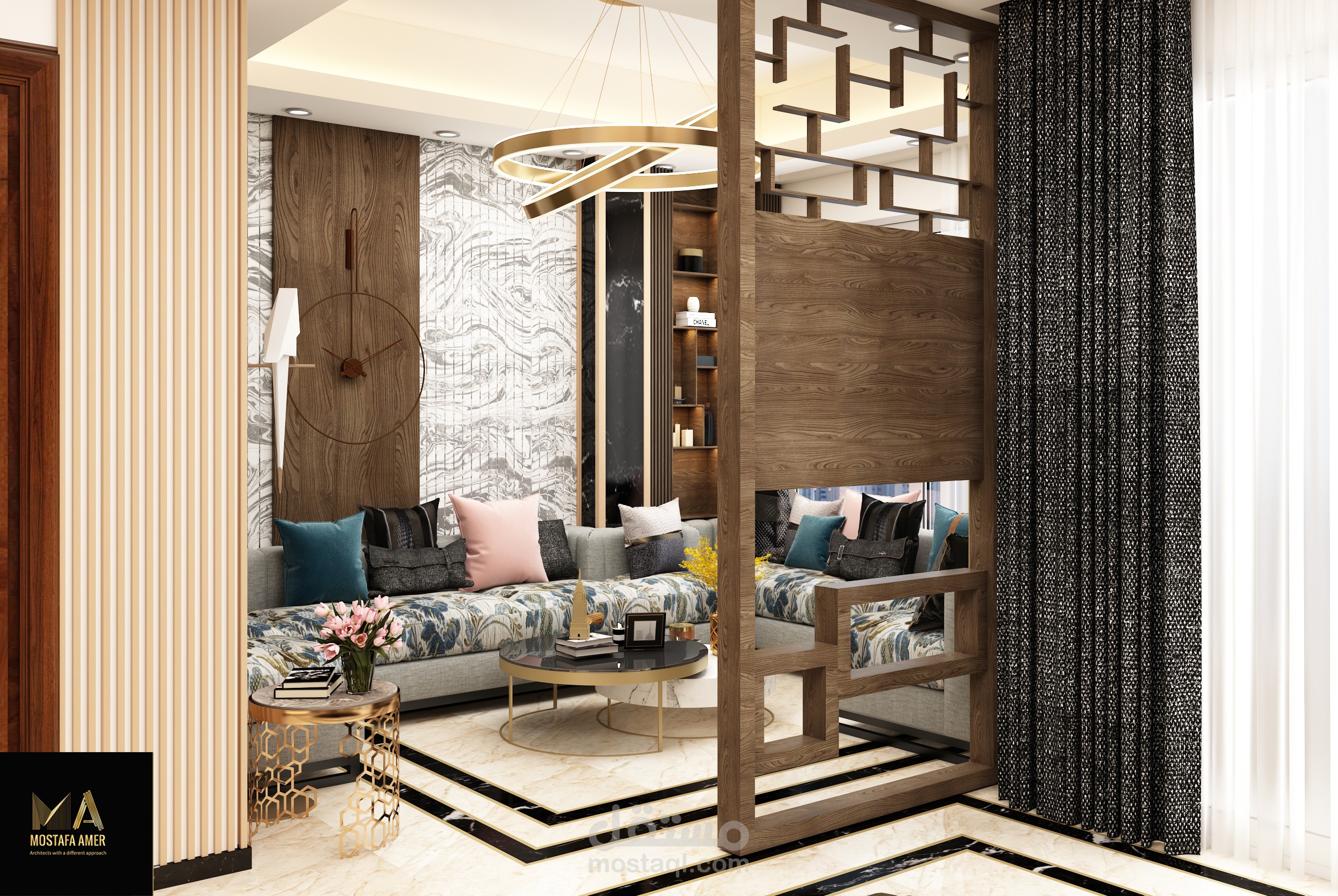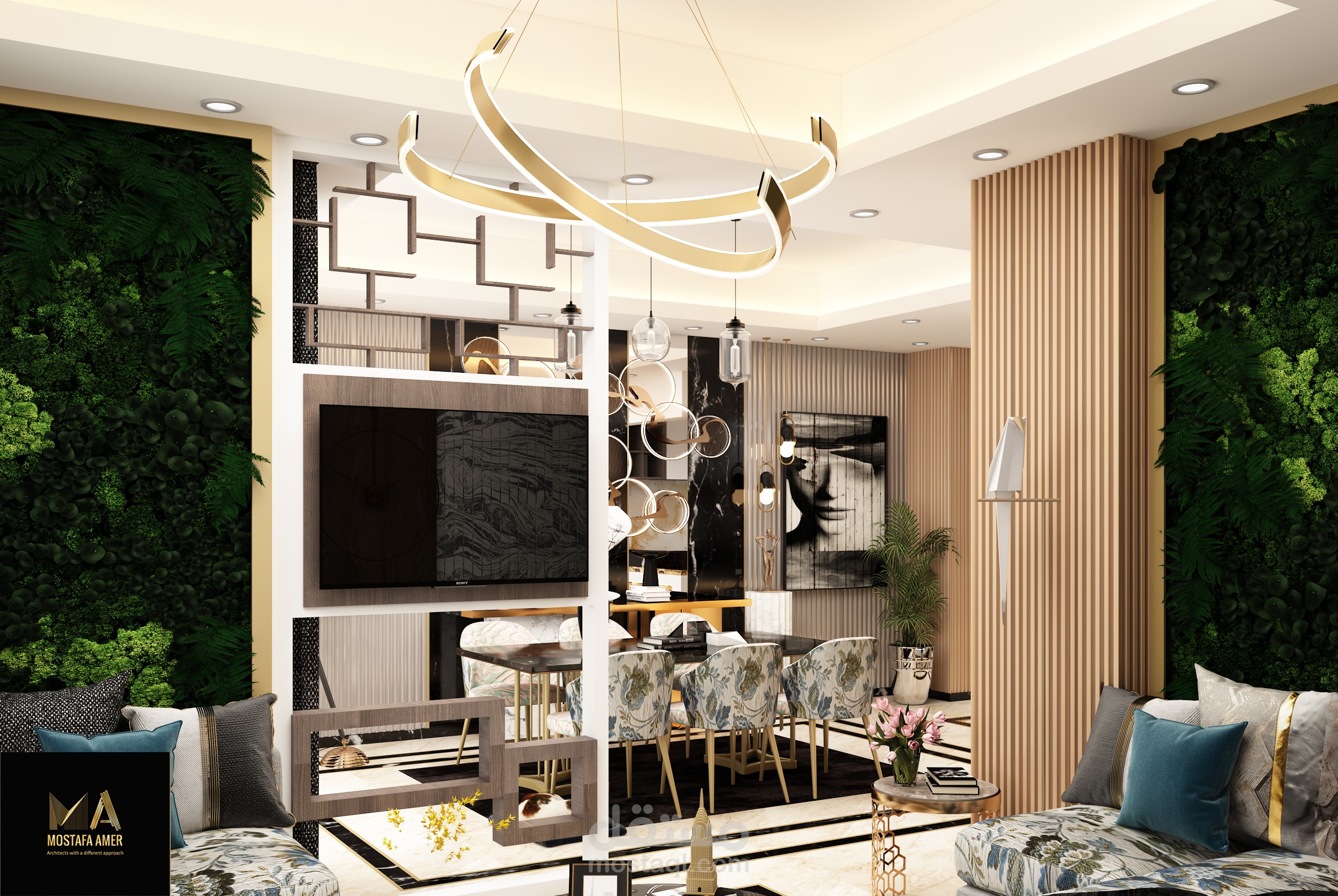 صاله معيشه مقسمه الى 3 قطع صالون وليفنج وسفره وبها مطبخ امريكان