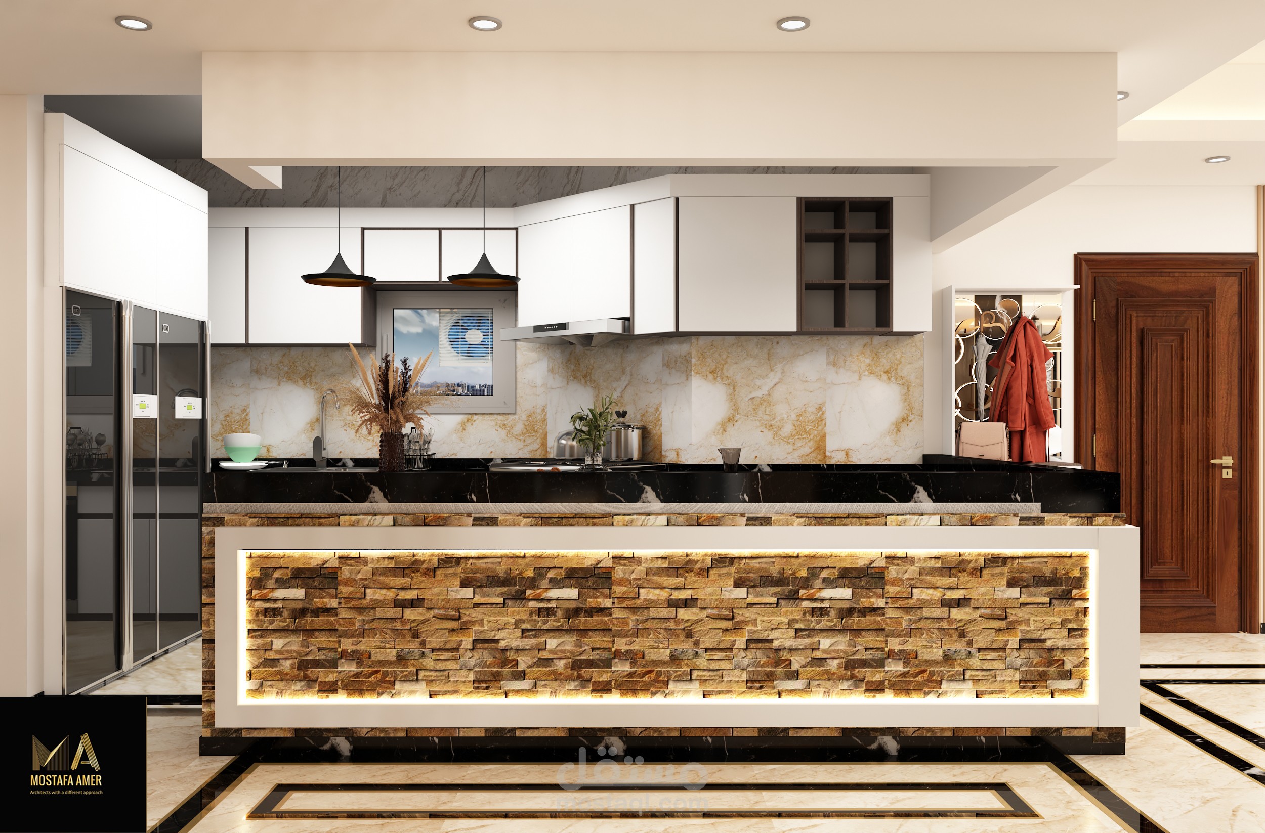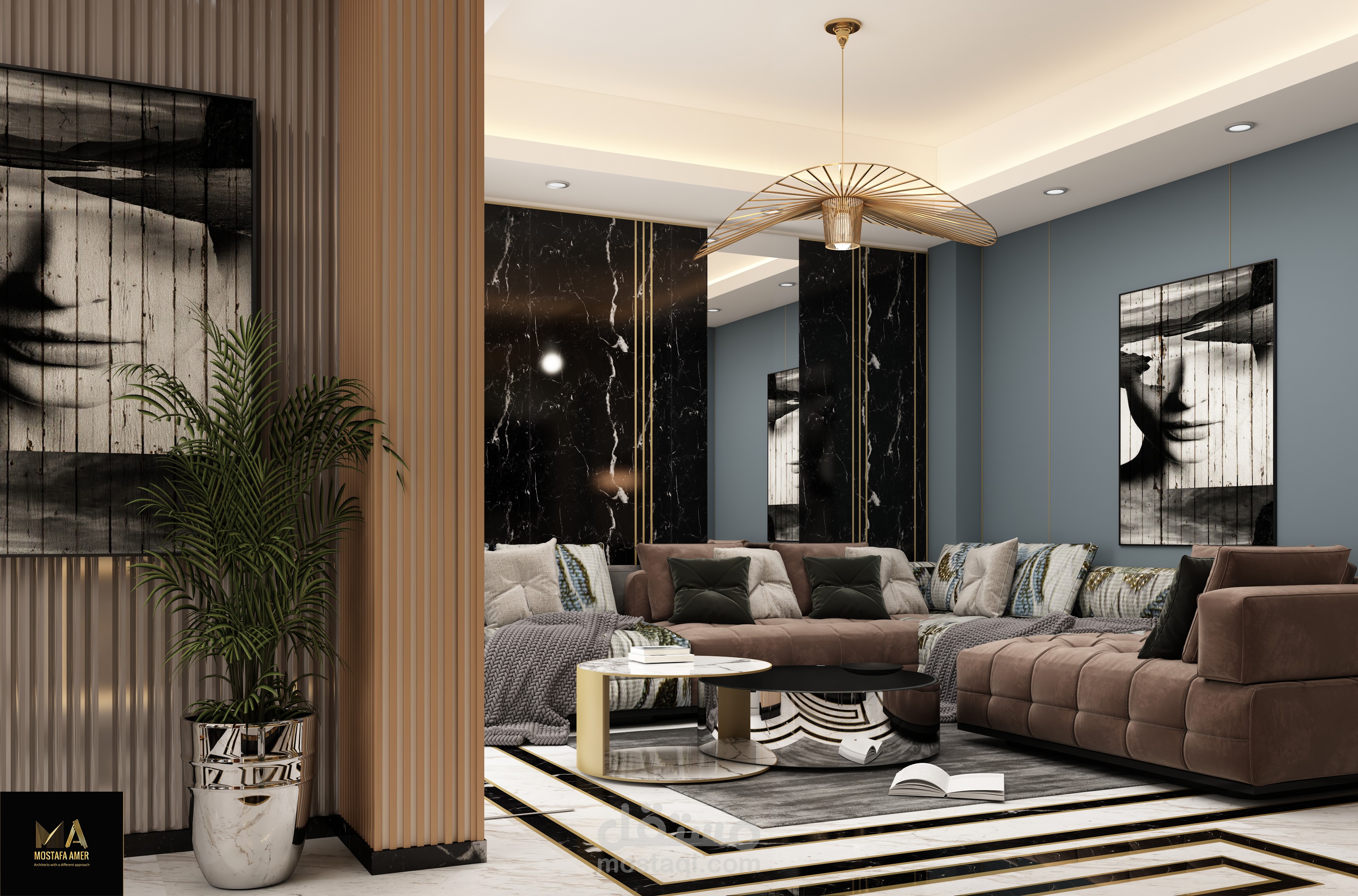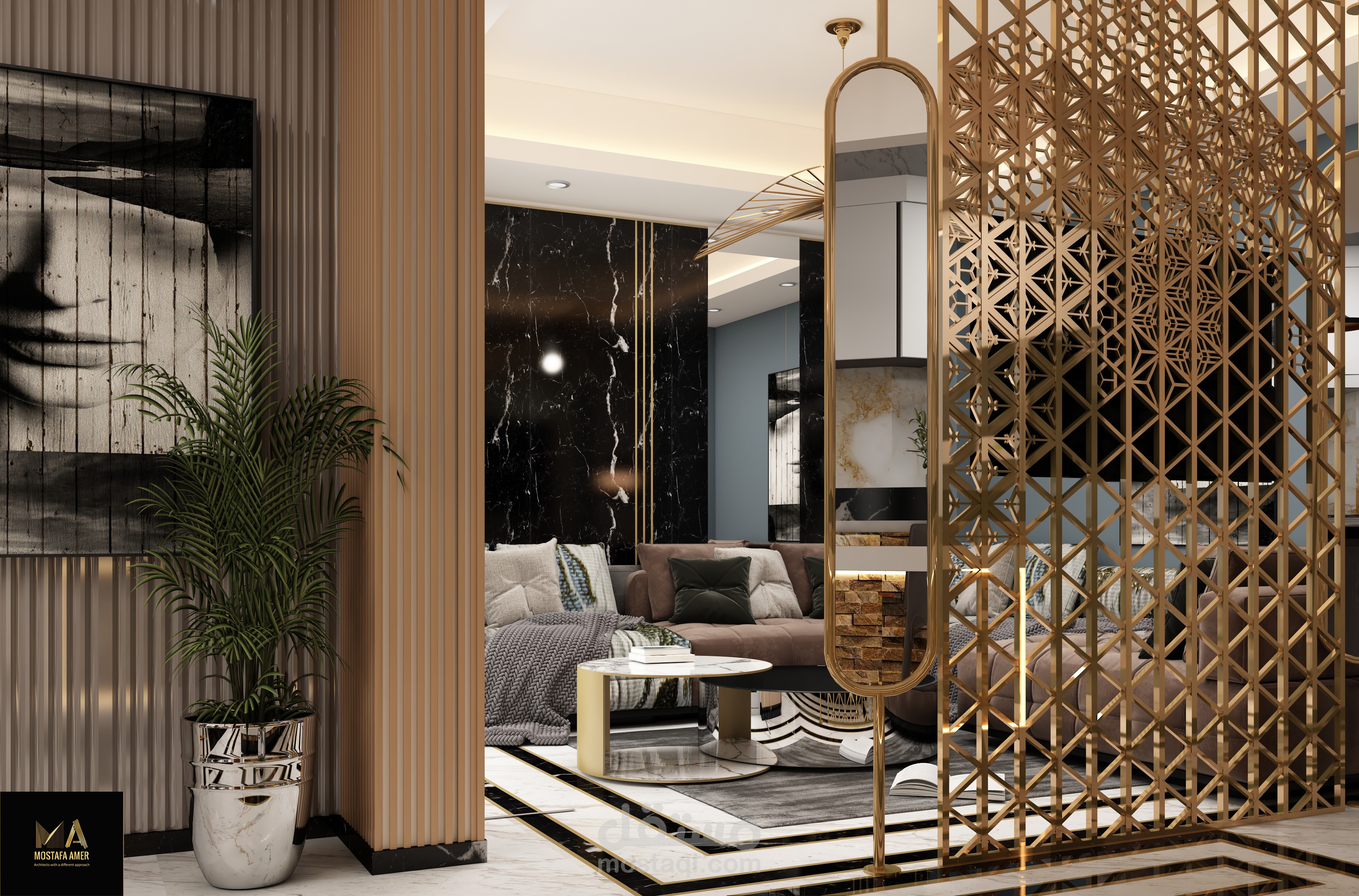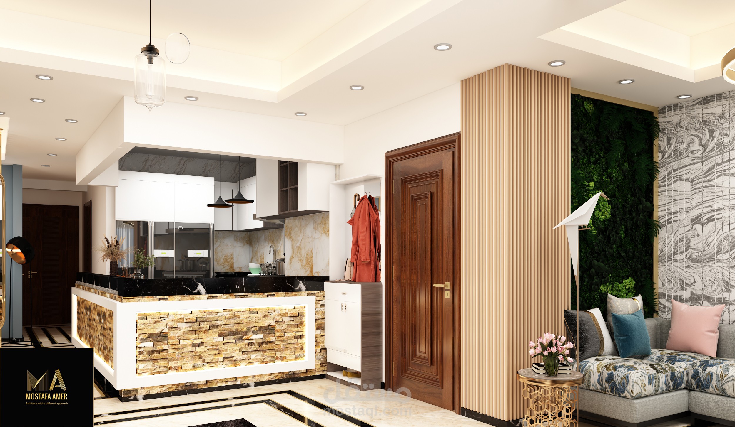صاله معيشه مقسمه الى 3 قطع صالون وليفنج وسفره وبها مطبخ امريكان