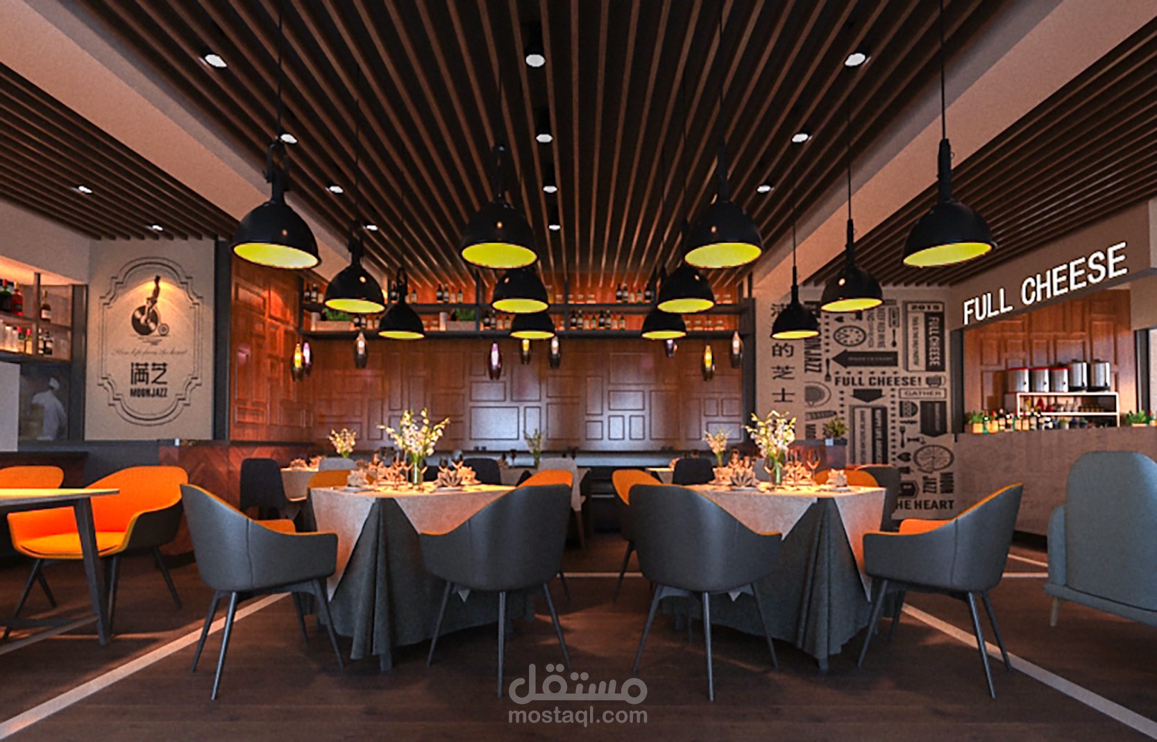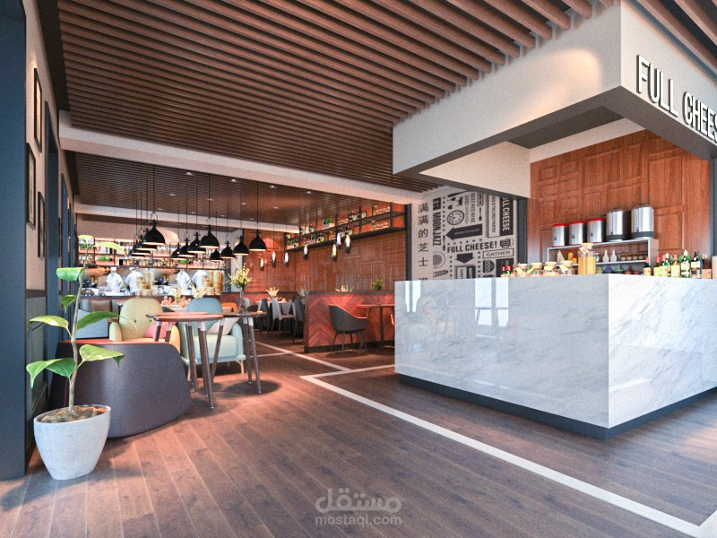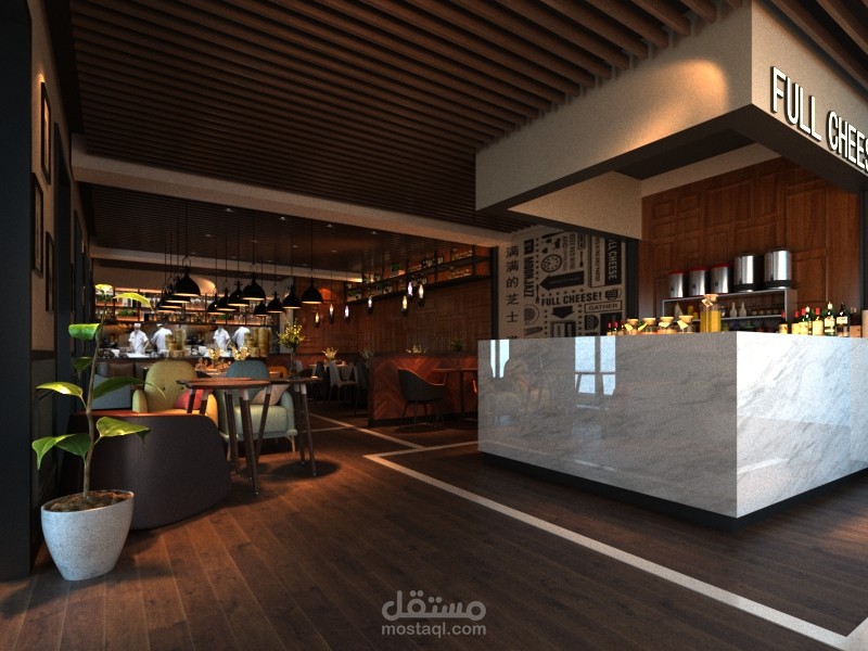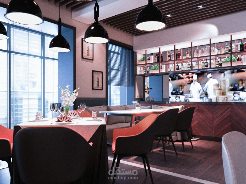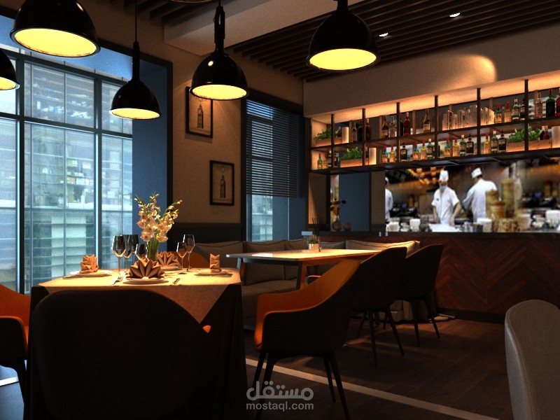 هذا العمل كان لصالح احد العملاء من كندا ضمن طاقم كونتور ستديو وكان العمل عبارة عن اعادة هيكلية وتصميم لواجهة مطعم بالاضافة الى تصميم داخلي كامل للمطعم حيث عملت مع العميل على دراسة الاحتياجات المطلوبة وكمية استيعاب المكان ودراسة الاضاءات وغيرها من المطاليب بعد ذلك انطلقت على العمل على المسقط الرئيسي والتوزيع الاساسي للفراغات ومن ثم عملت على التفاصيل والسلامة للمطعم ضمن الكود المطلوب واخيرا جمعت كل هذه التفاصيل وغيرها ضمن تصميم مودرن يلبى احتياجات المكان والعميل ضمن خطة تنفيذ مقسمة على مراحل مختلفة.