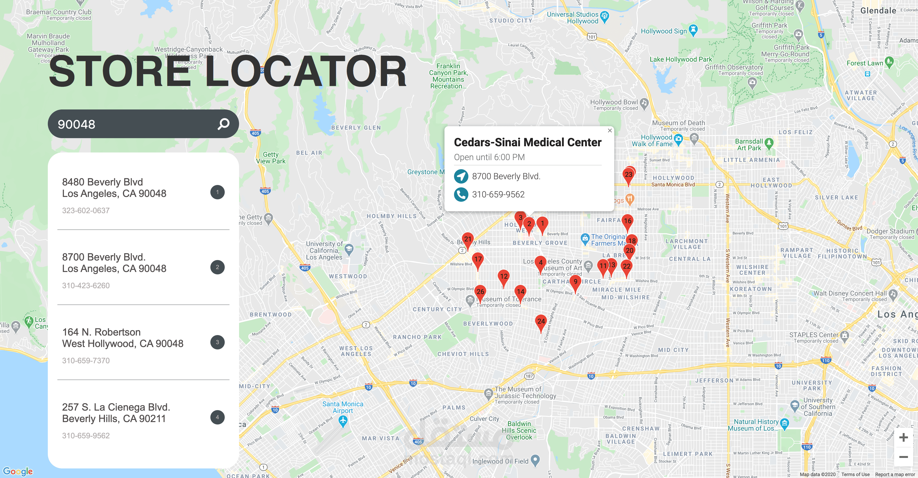 Store Locator app that let you browse & find available stores via location or zip code using Google Maps API