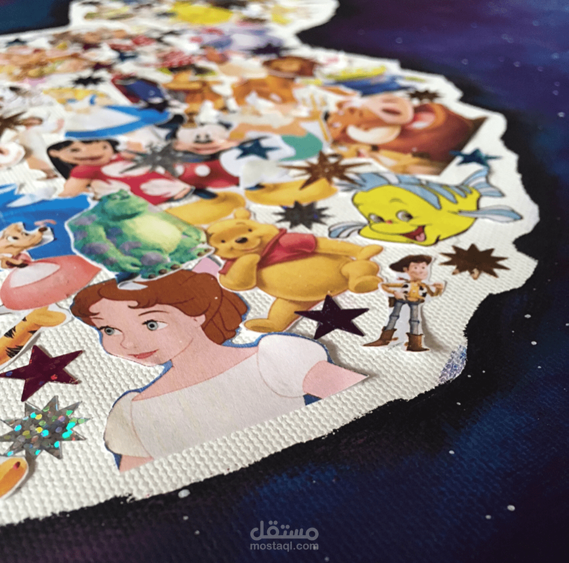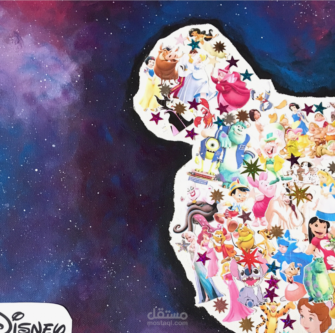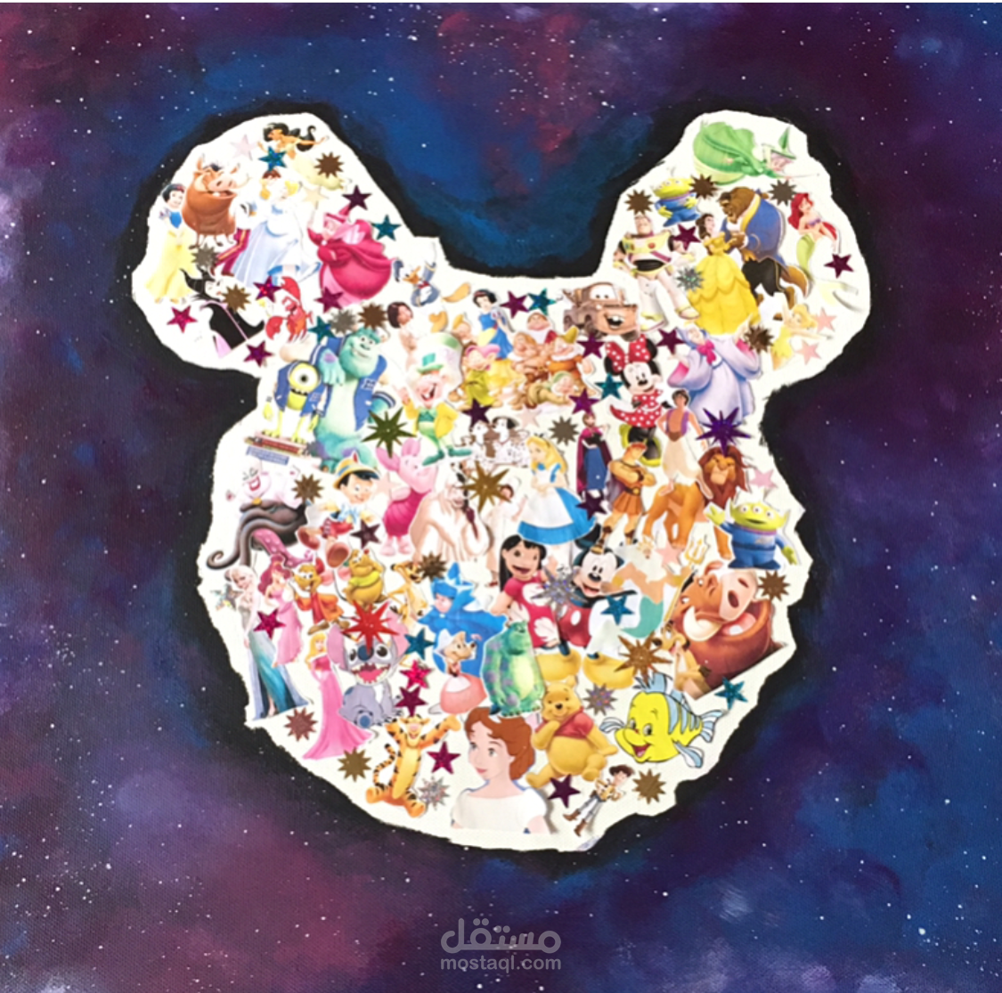 لوحة كولاج بالوان الاكريلك، مستوحى من ديزني والفضاء.