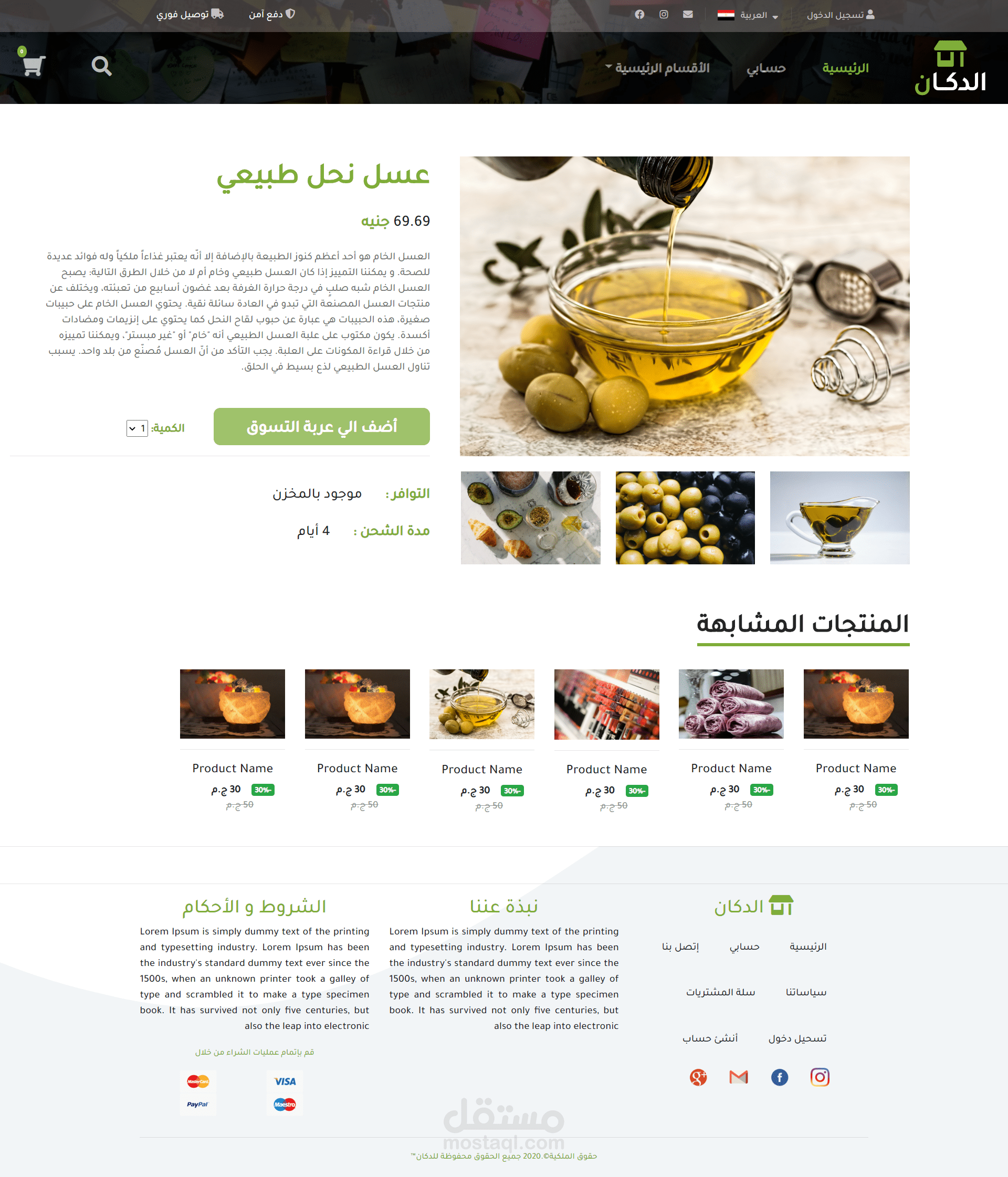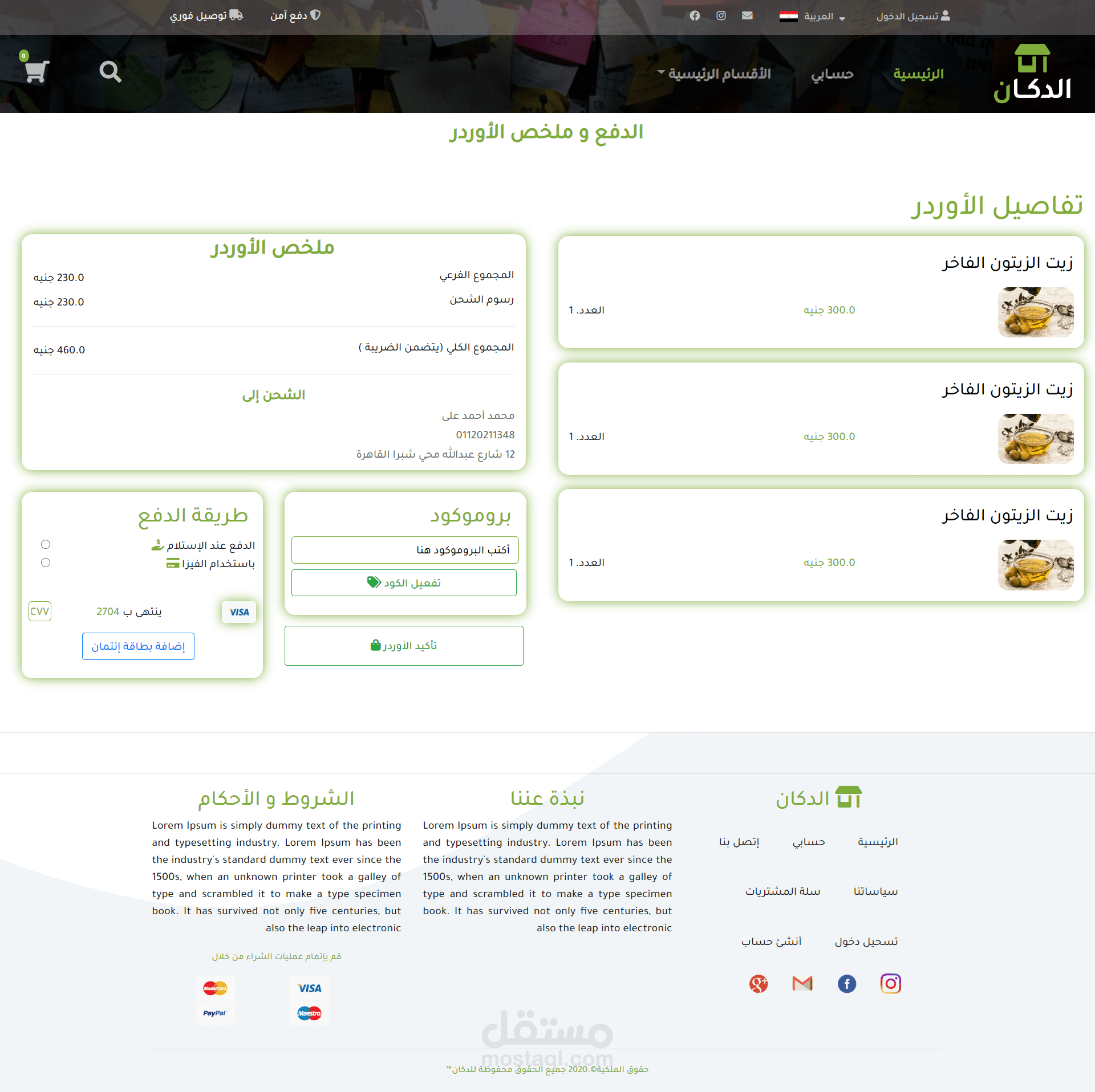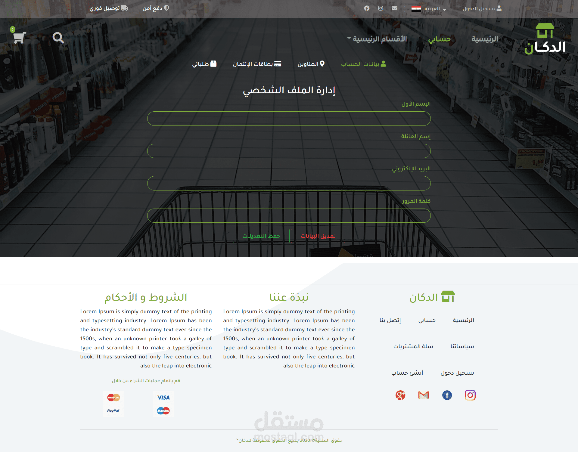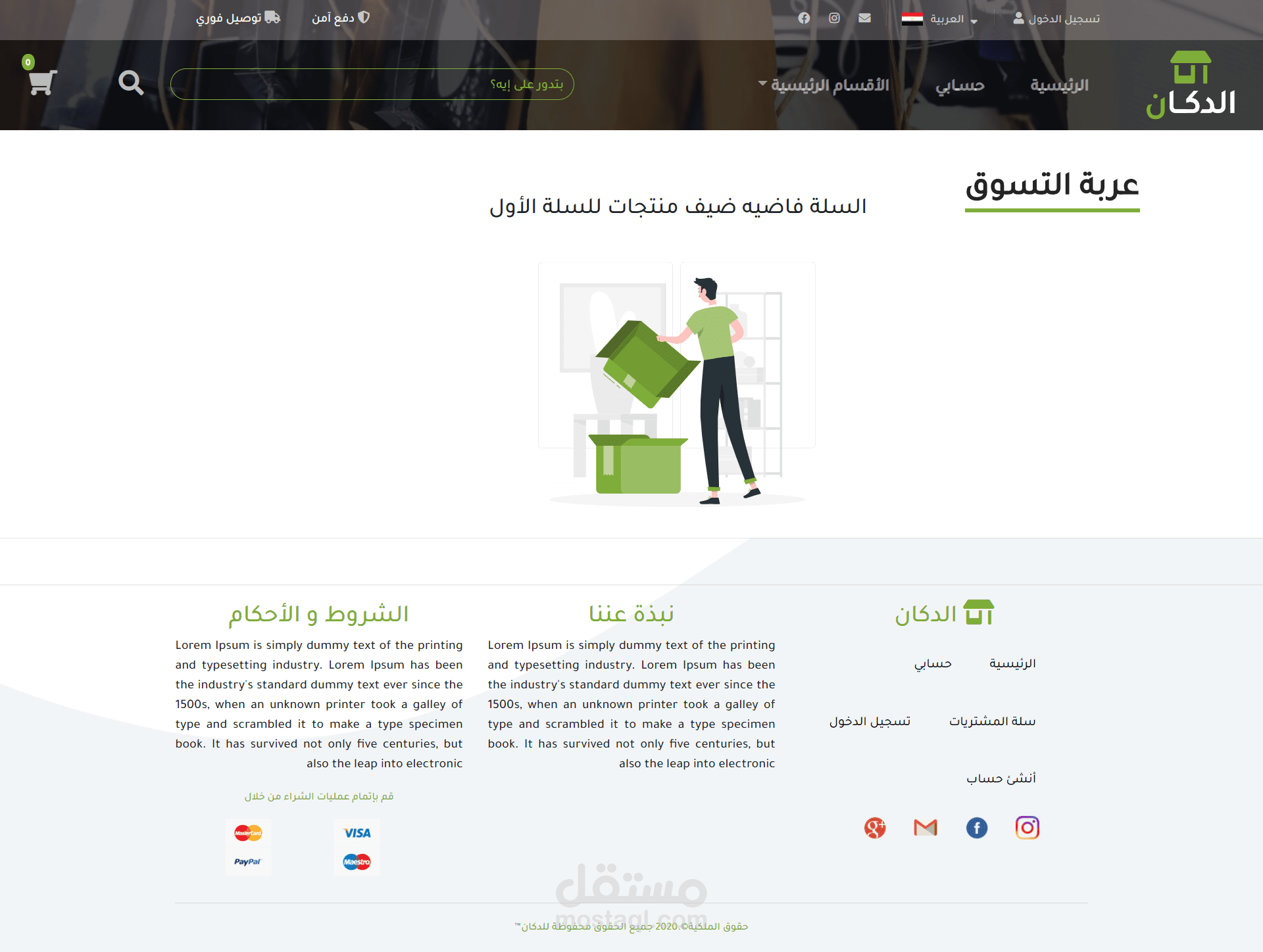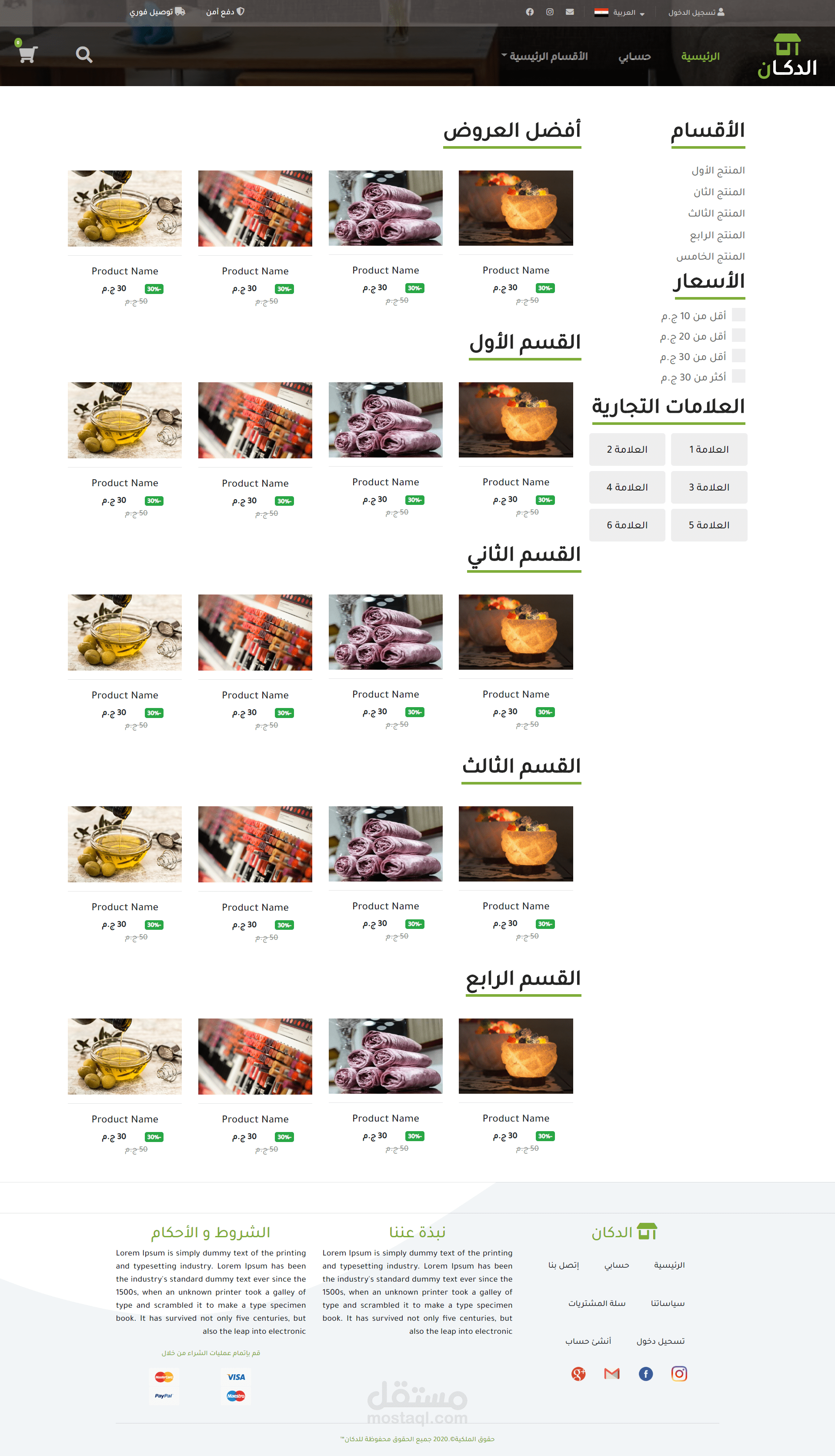 متجر إلكتروني كامل و متوافق مع الهواتف وشاشات الكمبيوتر مع تصميم كامل خاص ومع امكانية إضافة عدد لا نهائي من الأقسام الرئيسية و الأقسام الفرعية و المنتجات بداخل كل قسم. و إمكانية إضافة بروموكود وتحديد نسبة الخصم و مده الخصم و عدد مرات الإستخدام و أمكانيه التواصل مع العميل عبر قسم الدعم الفني الخاص بالرسائل الإلكترونية لكل عميل