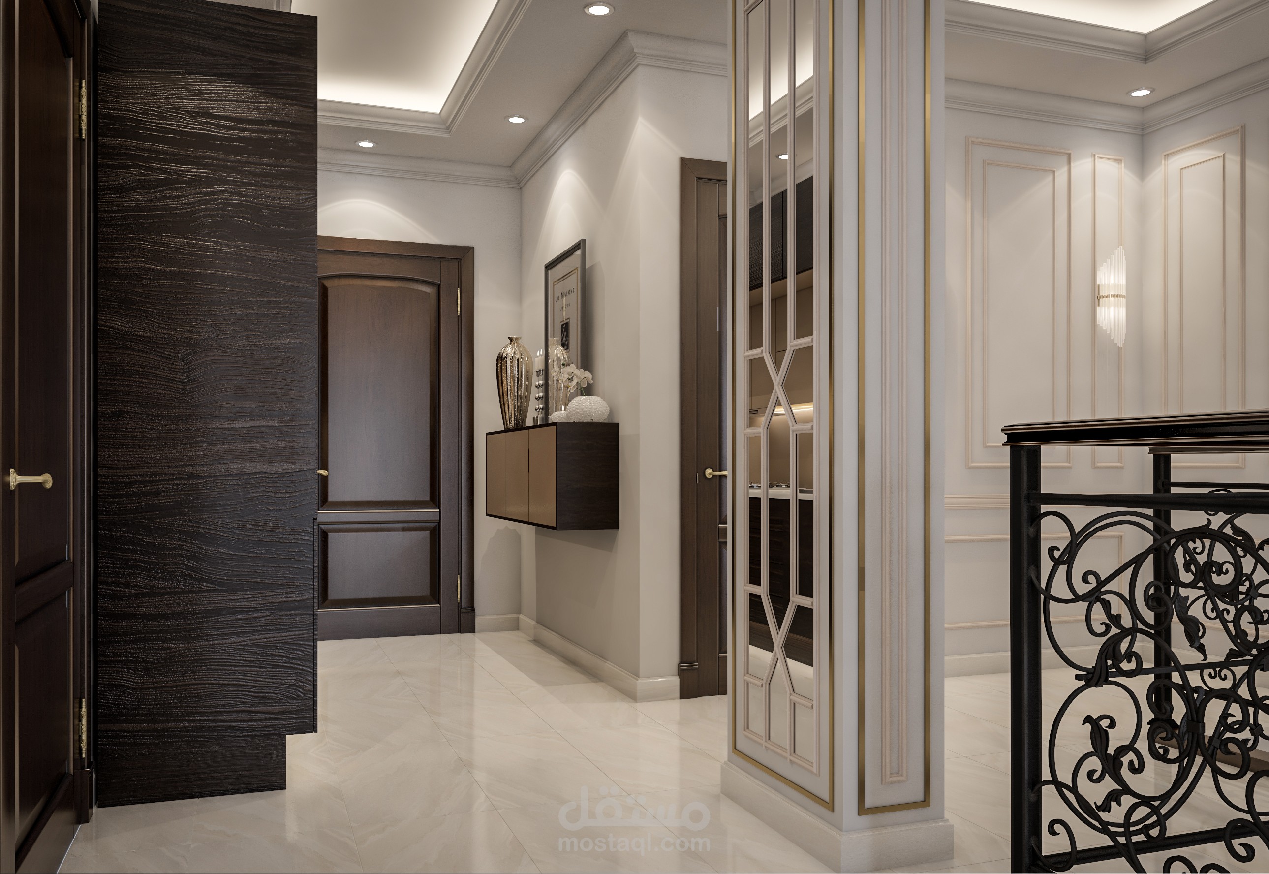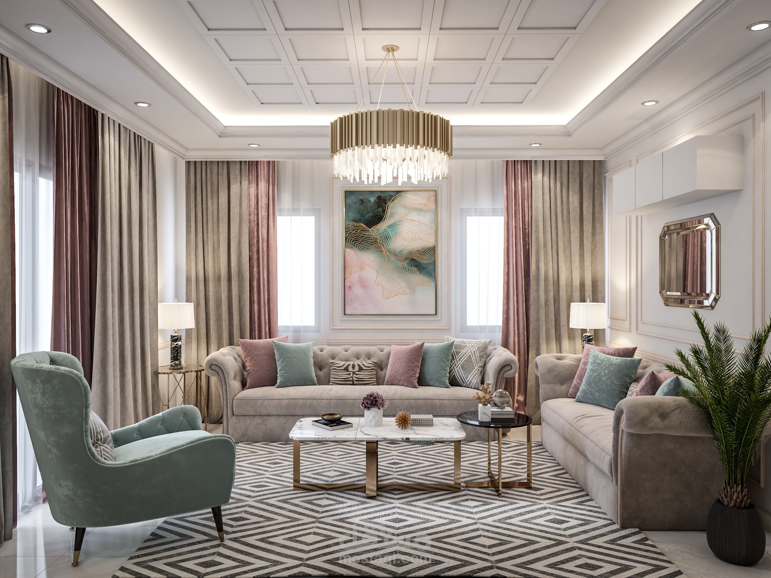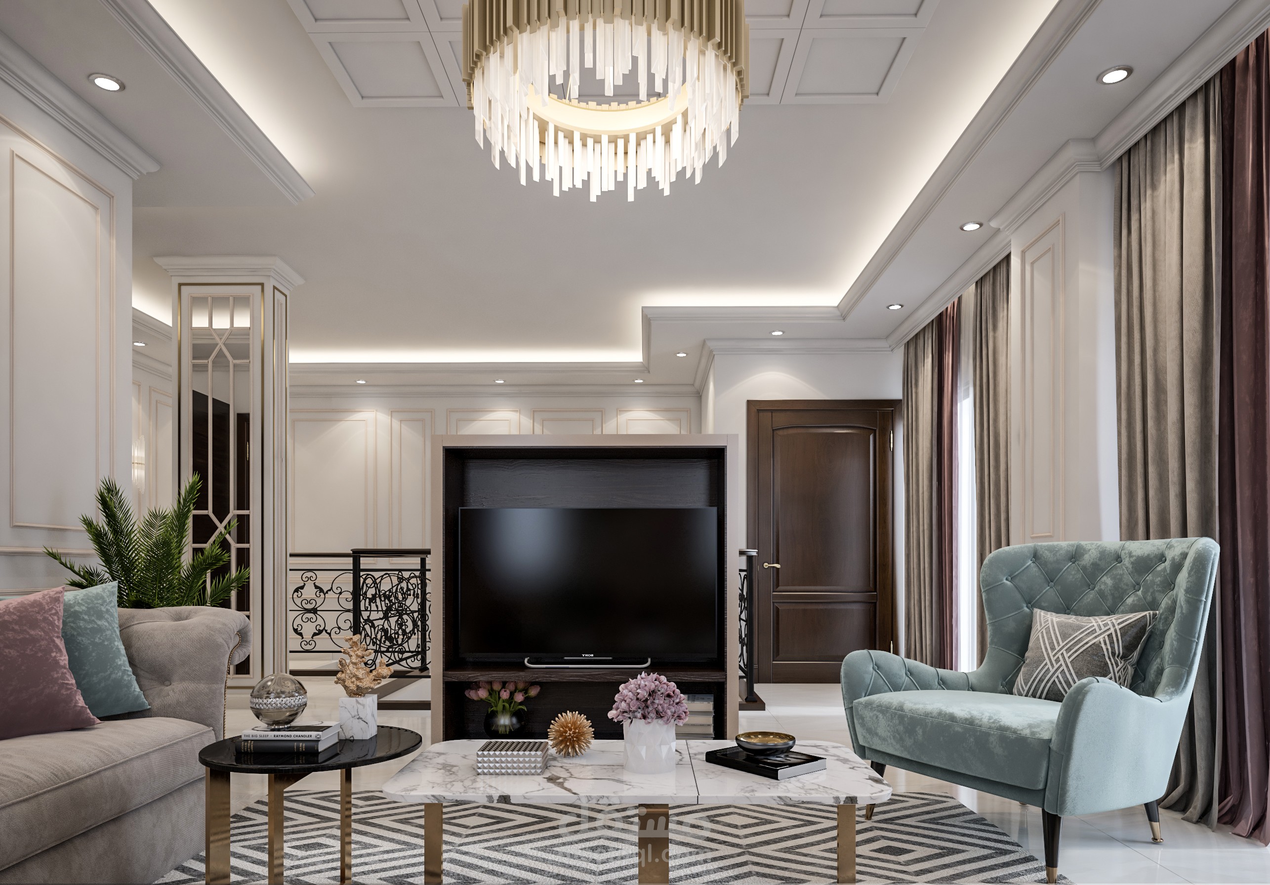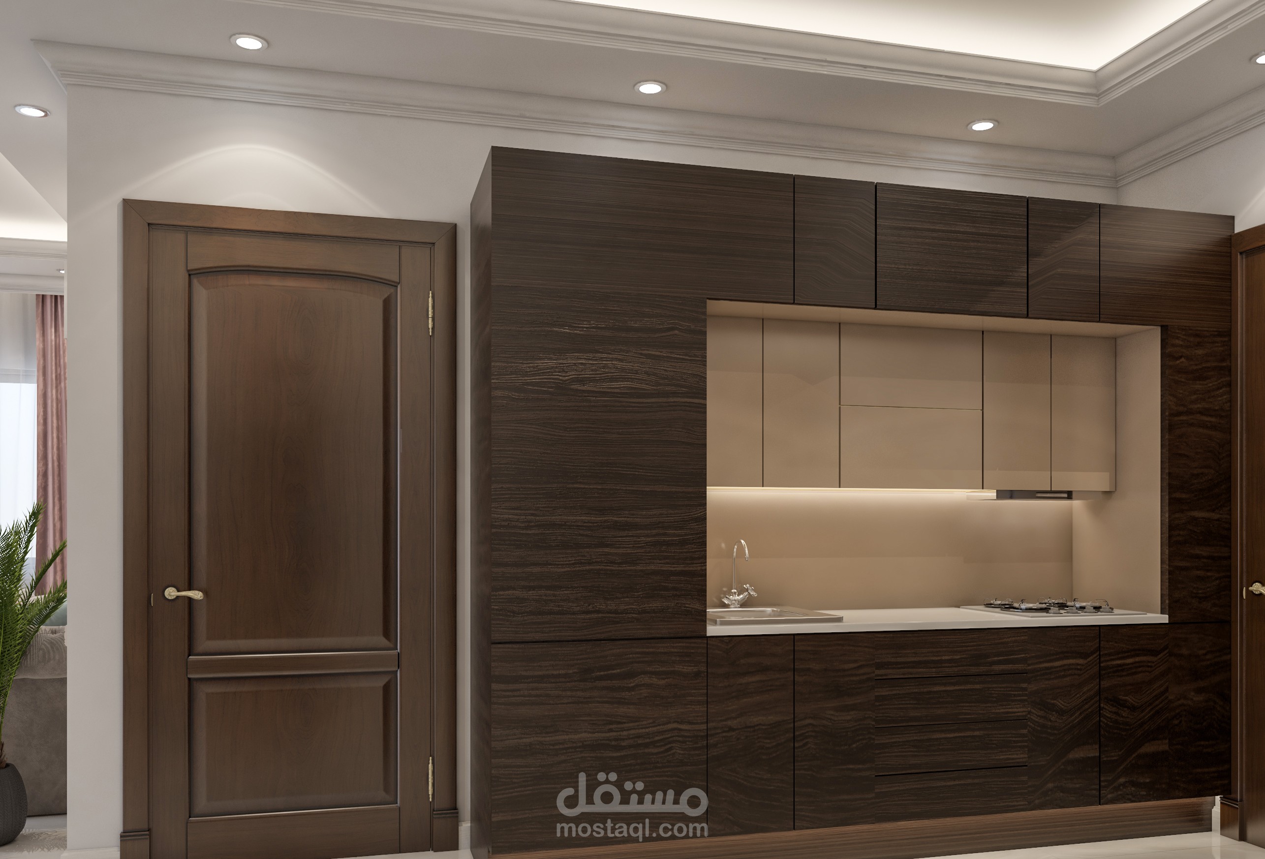 تصميم أنيق لمعيشة ملحق بها مطبخ مفتوح