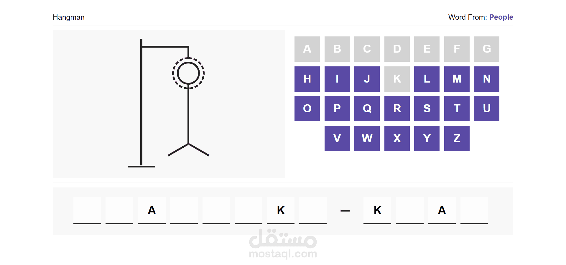 لعبة hangman تحتوي على اربع مجموعات الاكل,الدول,المشاهير, افلام ,يمكنك مشاهدة الفيديو التوضيحي من رابط المشروع