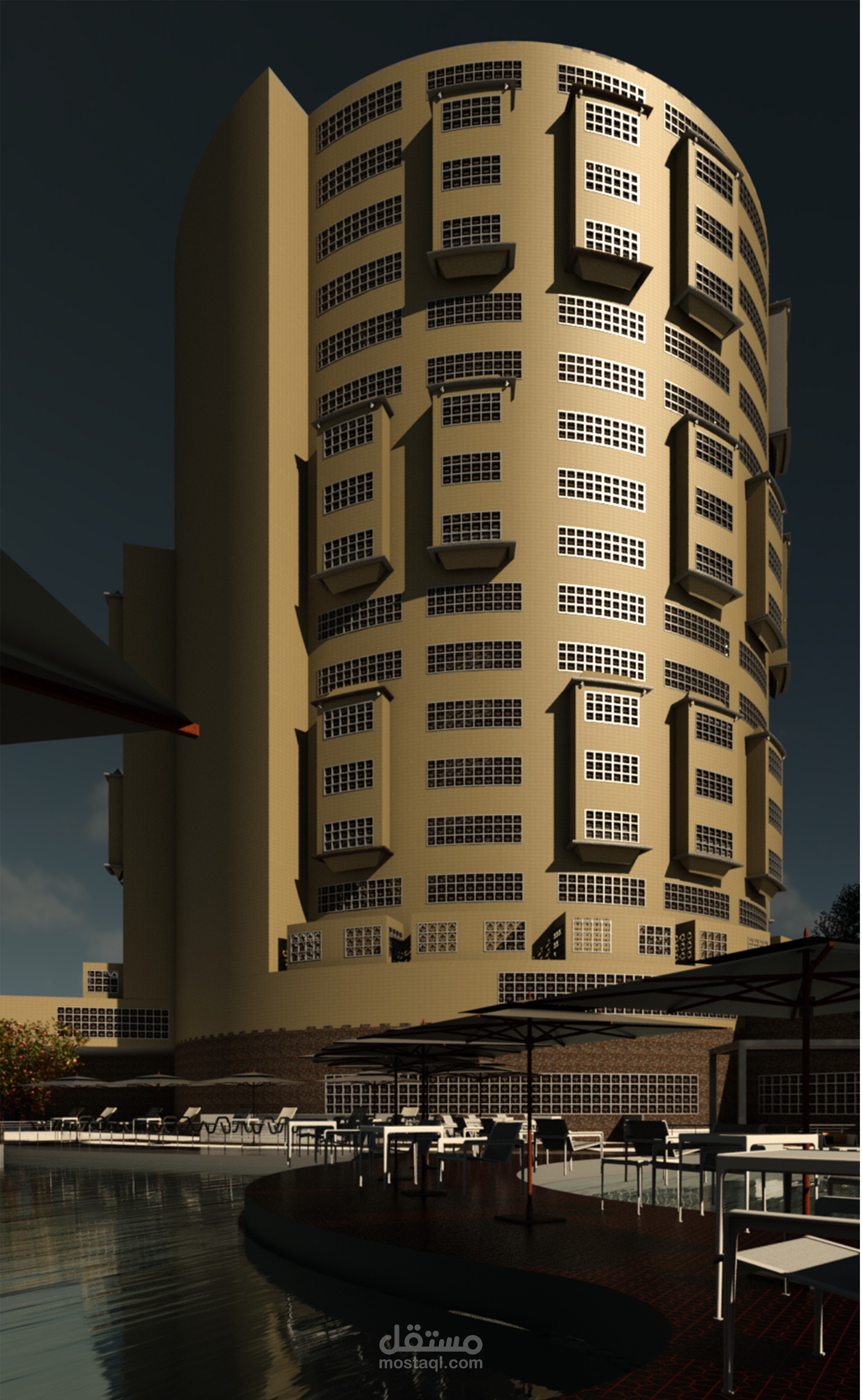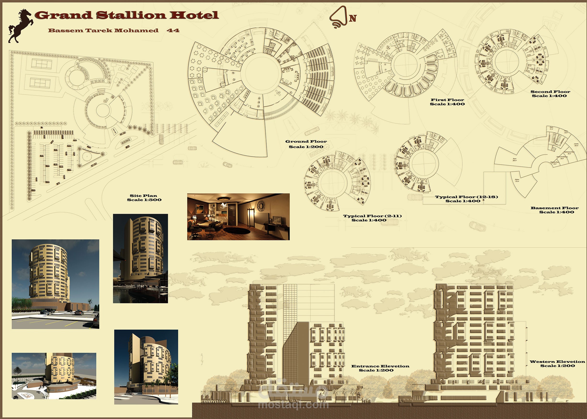 مشروع فندق خمس نجوم في مدينة برج العرب بمصر قمت بالتصميم مستخدماً الطابع الإسلامي مع وجود كل ما يميز فنادق الخمس نجوم .