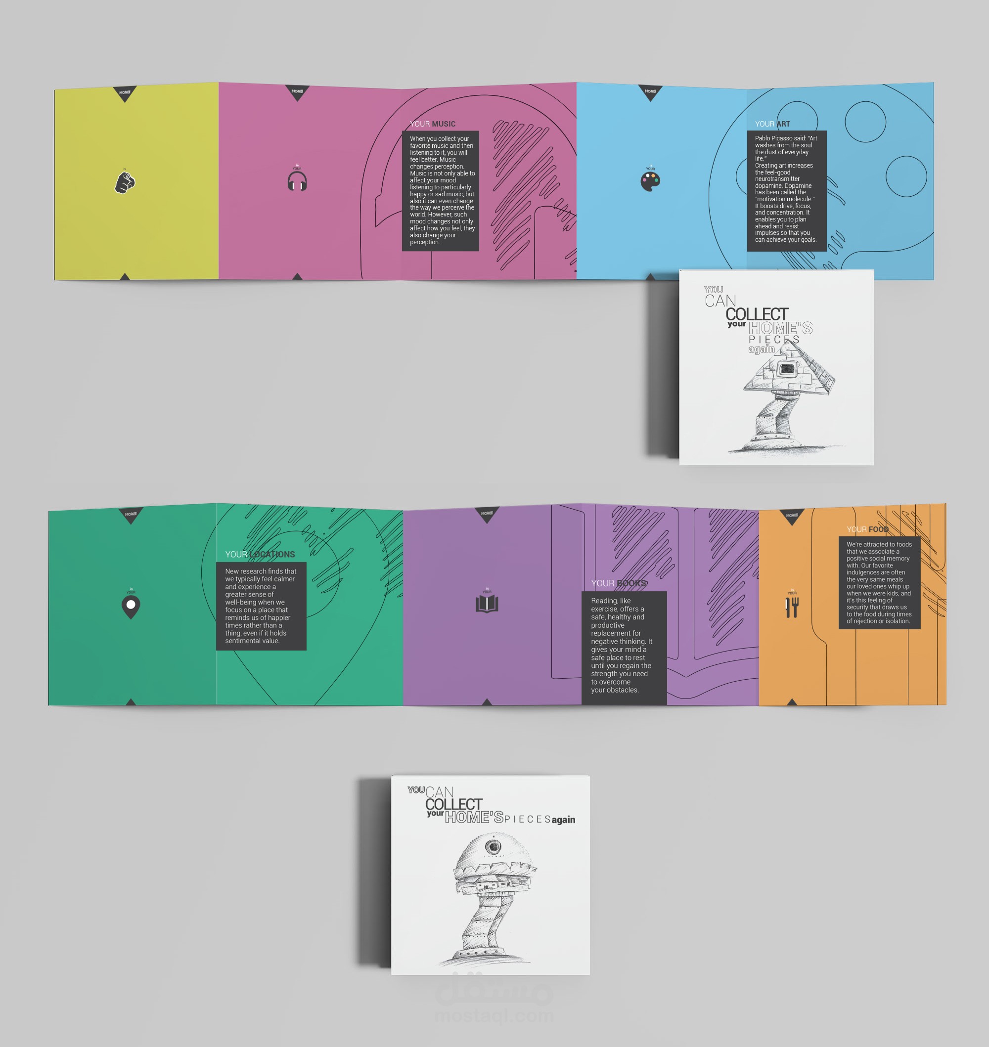 When somebody loses his home and he went far from his place, physically he has nothing from his home except his memories in his head. We can use here our memories, habits, interests, and the main basic things which make us happy, such as our favorite music, art, location, books, and eating. The mediums are brochures, posters flyers, and websites.