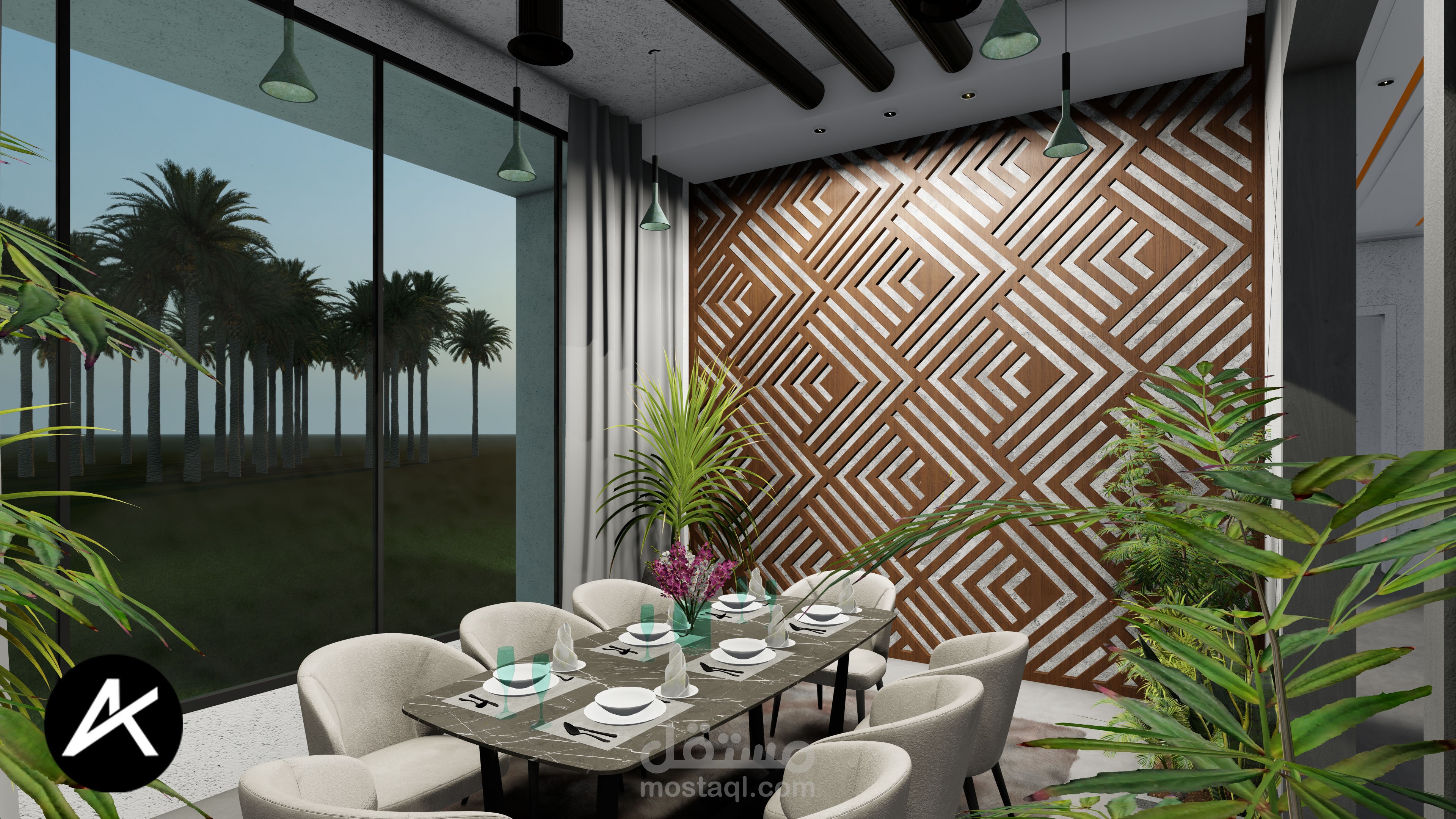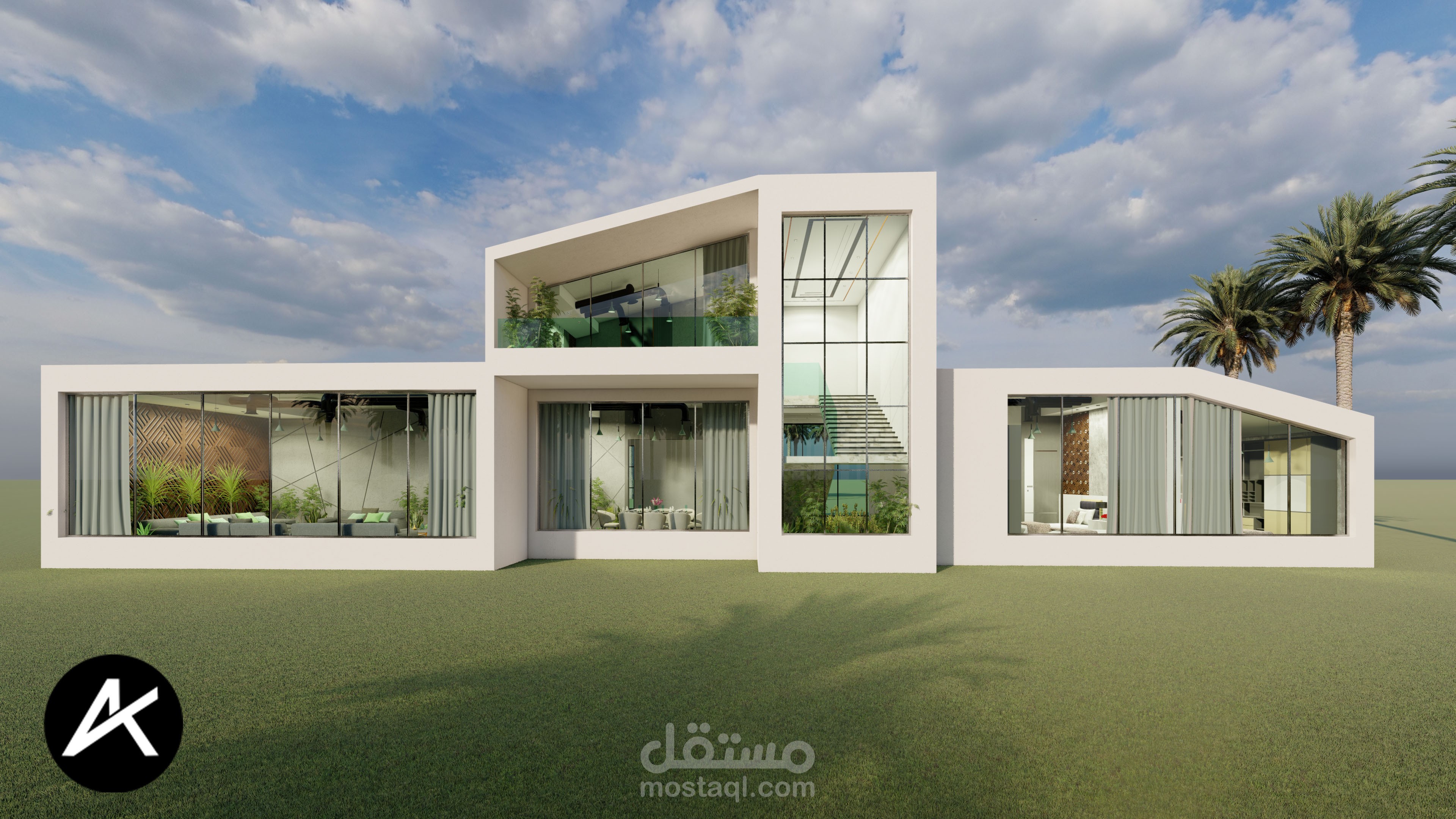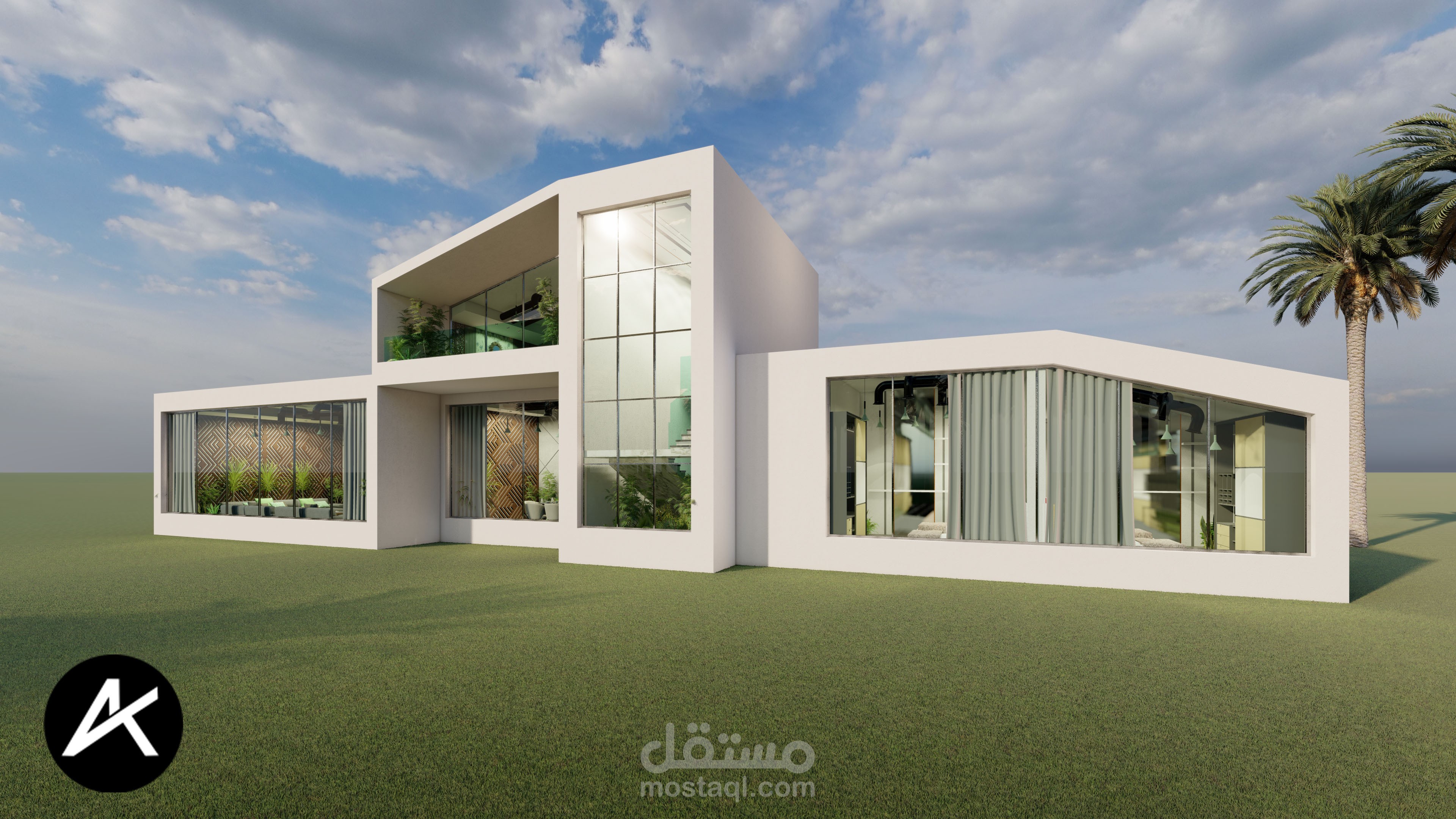 تصميمي لبيت ريفي مطل على مزرعة نخيل في السعودية