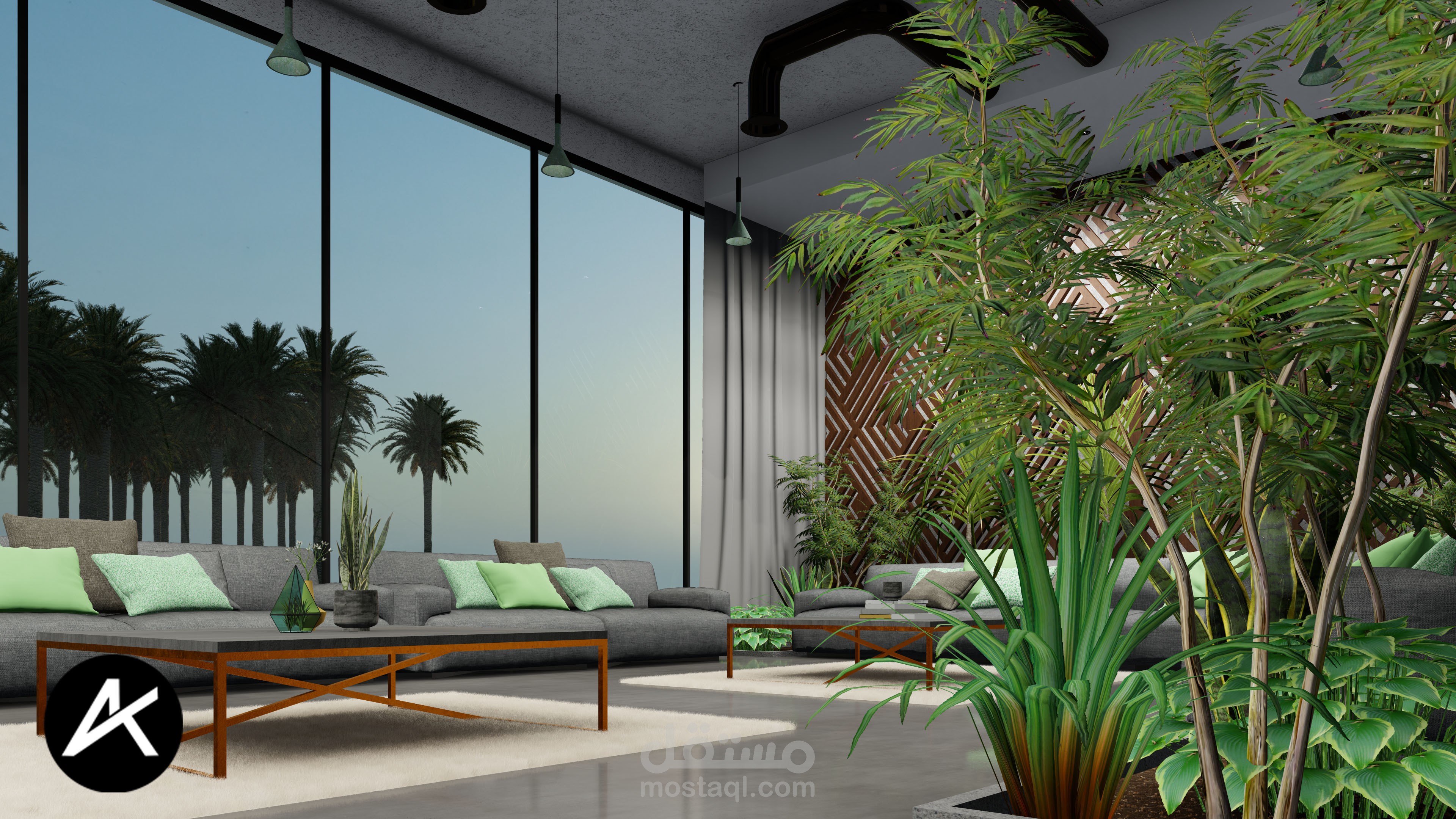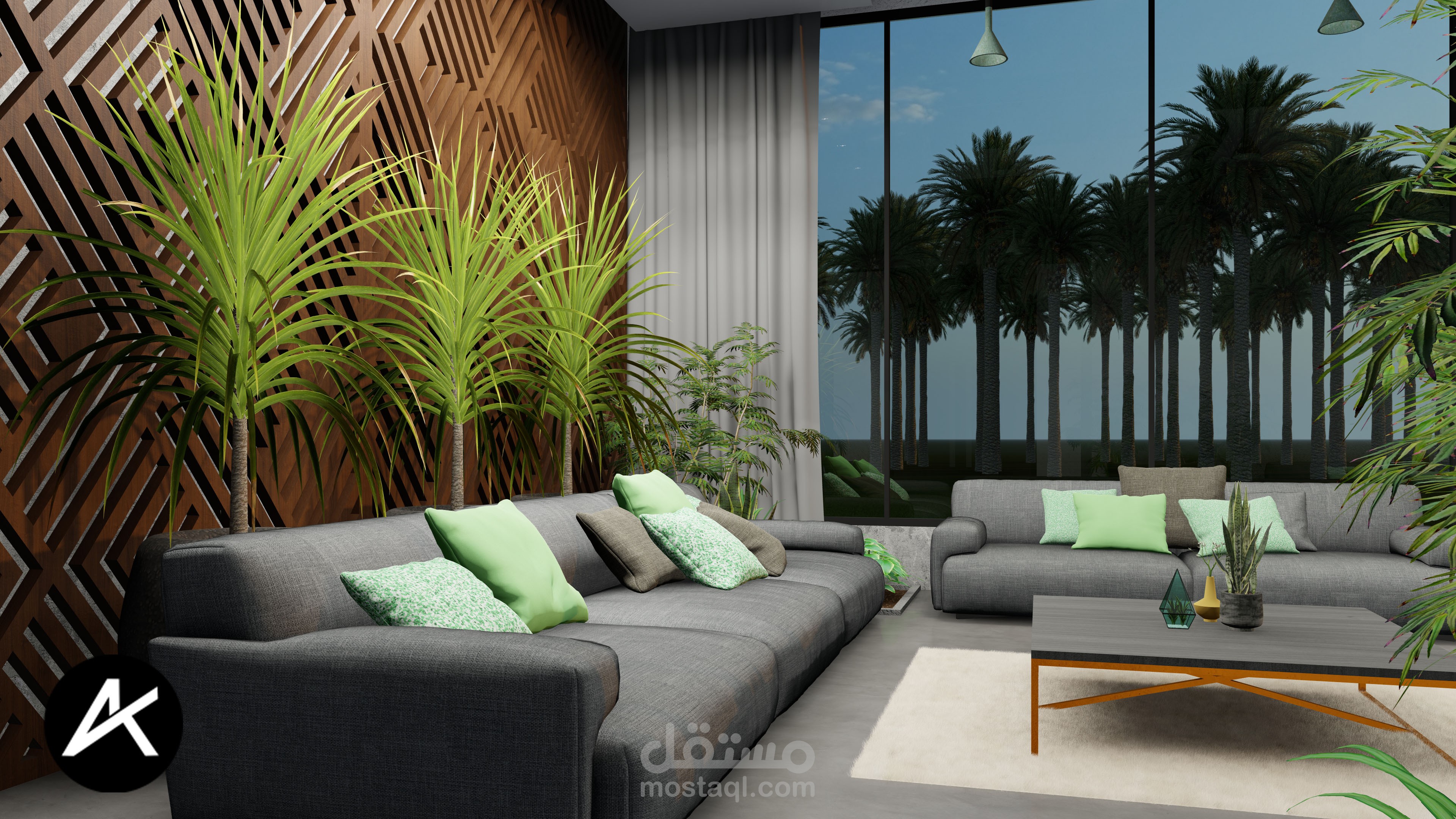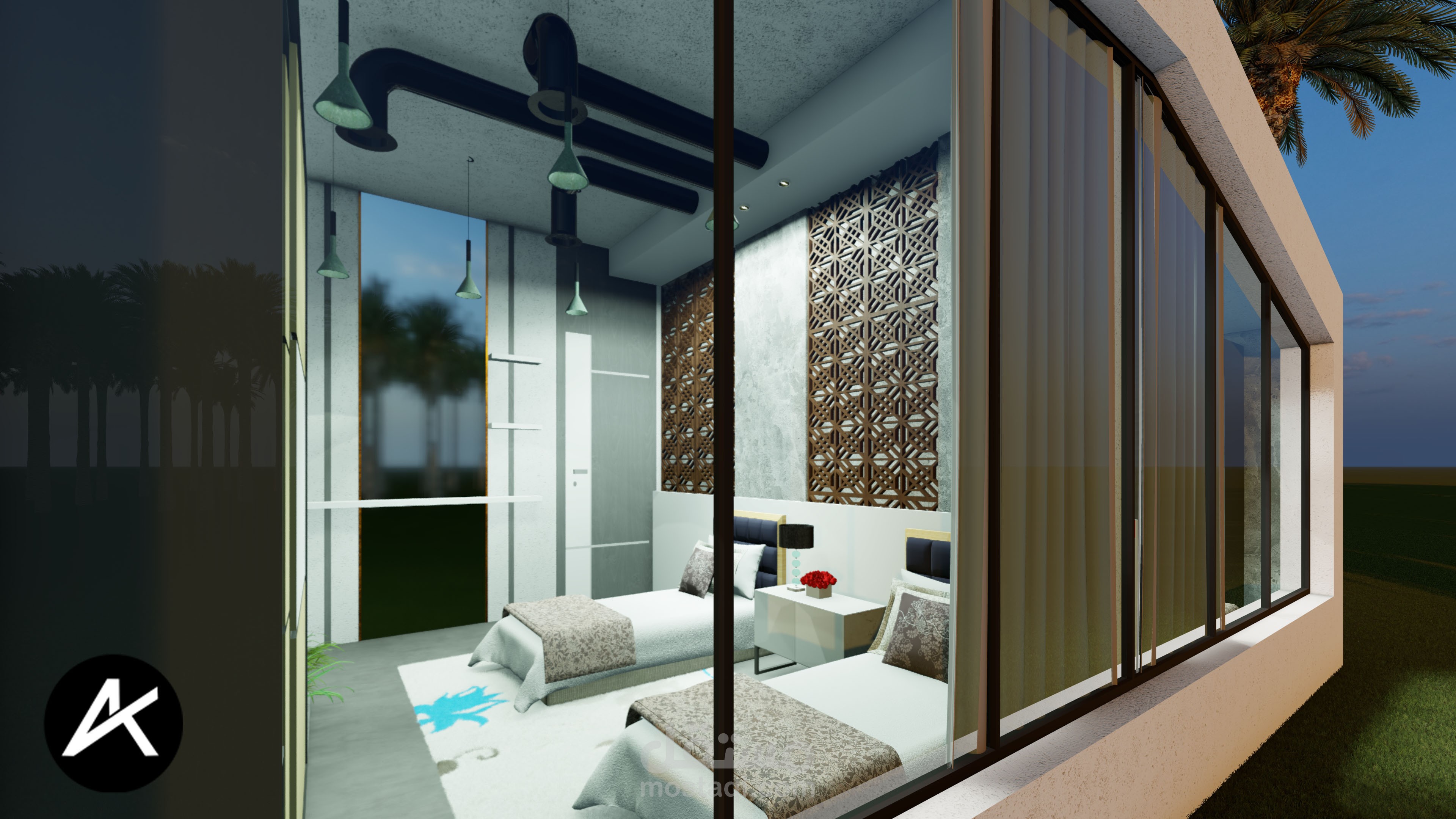 تصميمي لبيت ريفي مطل على مزرعة نخيل في السعودية