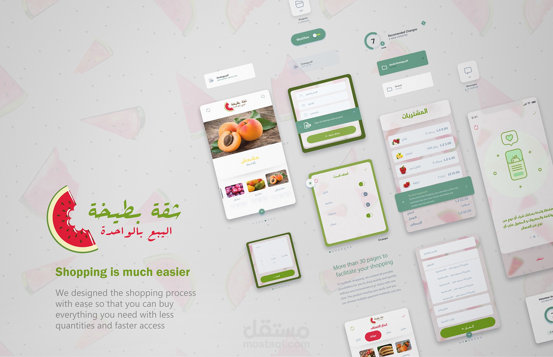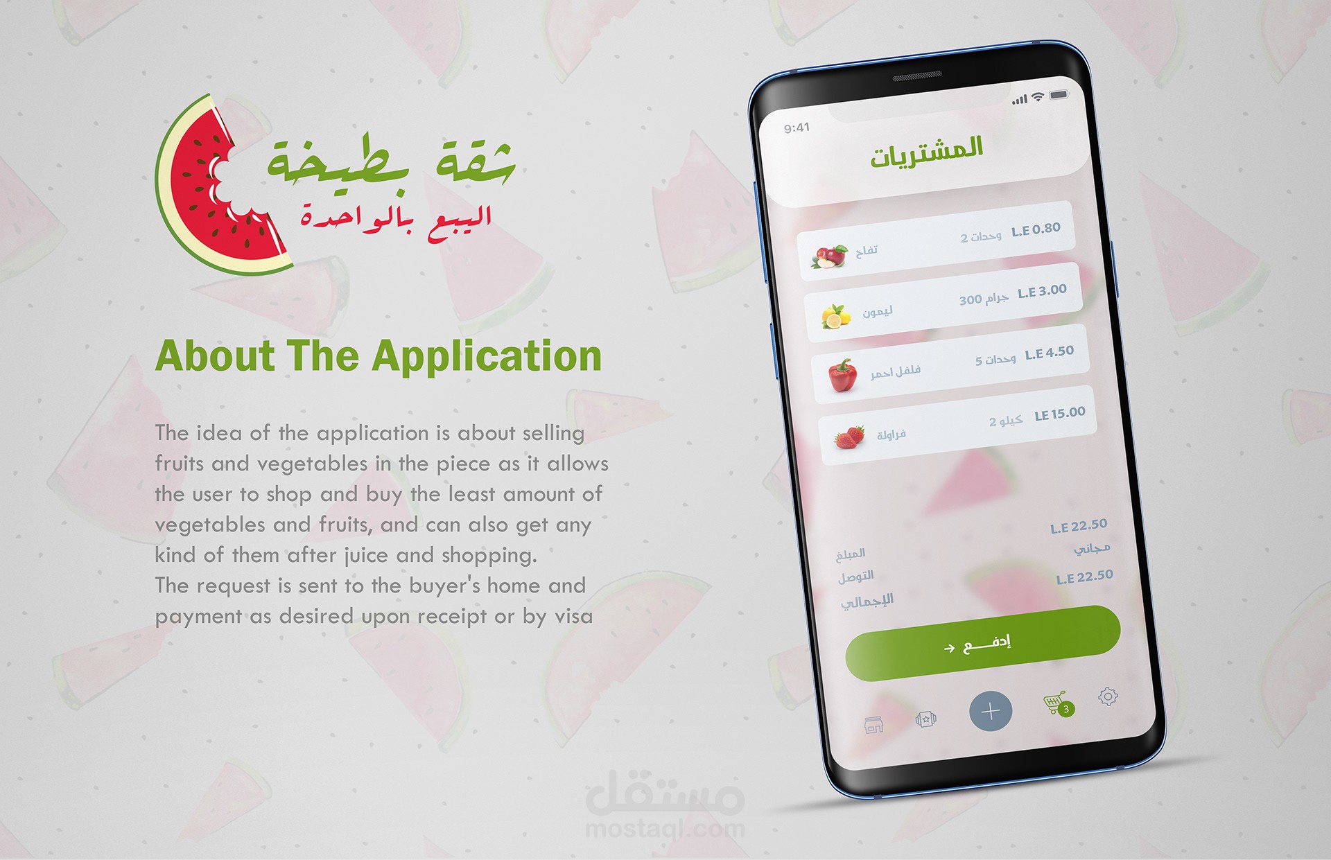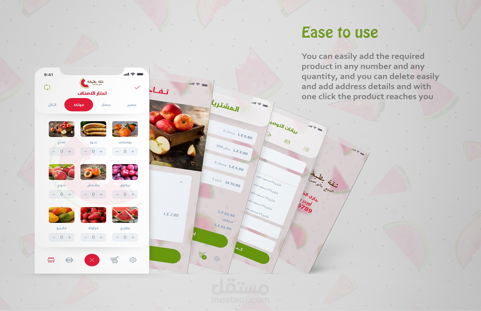ui - ux design for Shopping application for vegetables and fruits by selling as a piece a new idea that is not present in Egypt