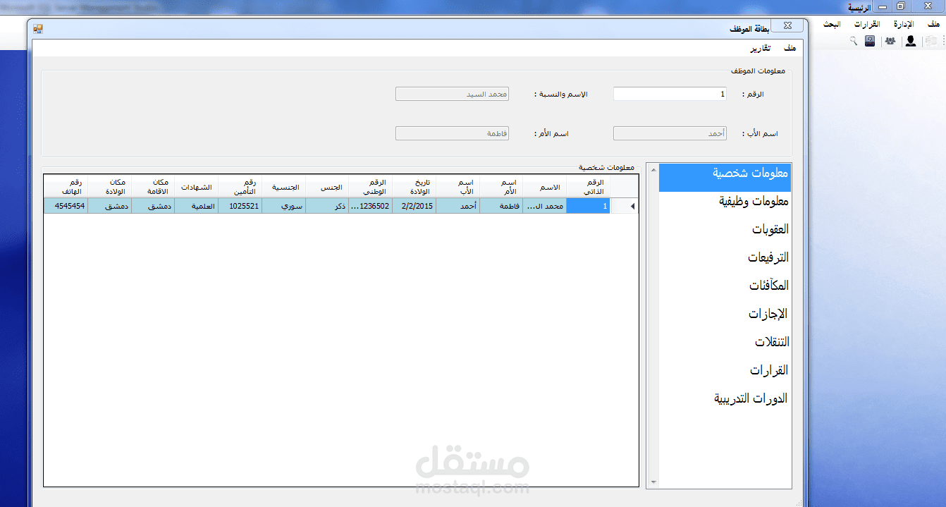 برنامج يقوم بأتمتة كاملة لكاافة المعلومات المتعلقة بالموظفين (ذاتية الموظف - اجازات - مكافآت - عقوبات -حسومات-الدرجات الوظيفية....) والأقسام بالإضافة لتحويل المعلومات الورقية إلى نسخ الكترونية وارشفتها وايضا أمكانيات البحث المتاحة عن طريق اى كلمة مفتاحية متعلقة بالموظف وإمكانية تخريج التقارير المتعددة وغيرها من الخدمات الاخرى