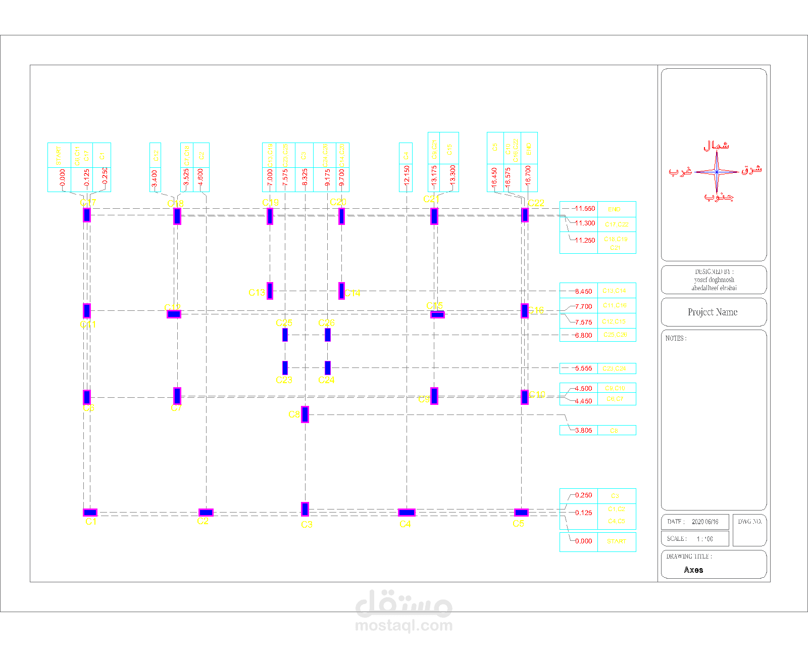 مخطط انشائي لمنزل مساحته 218 متر مربع يشمل جميع اللوحات الانشائية اللازمة بداية بالشبلونة (المحاورAxes) انتهاءً بمخططات السقف اللازمة للتنفيذ .