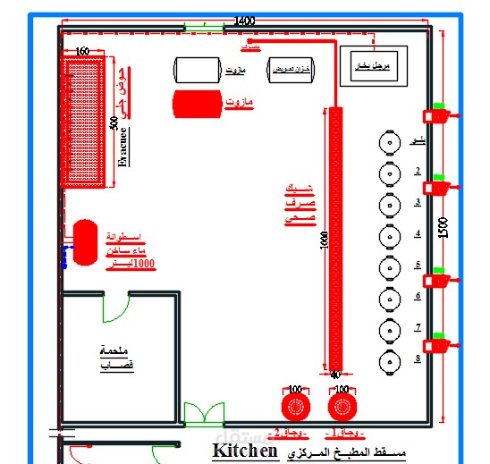يحتوي المطبخ الخاص بالمطاعم المنوعة على عدة أقسام : القسم الساخن ويضم الافران وغريلات الشوي وطناجر القلي والبرادات الكبيرة , والقسم البارد ويضم طاولات التحضير والبرادات المختلفة القياسات وقسم الحلويات وقسم التحضير واستراحة العمال والخدمات والمشالح