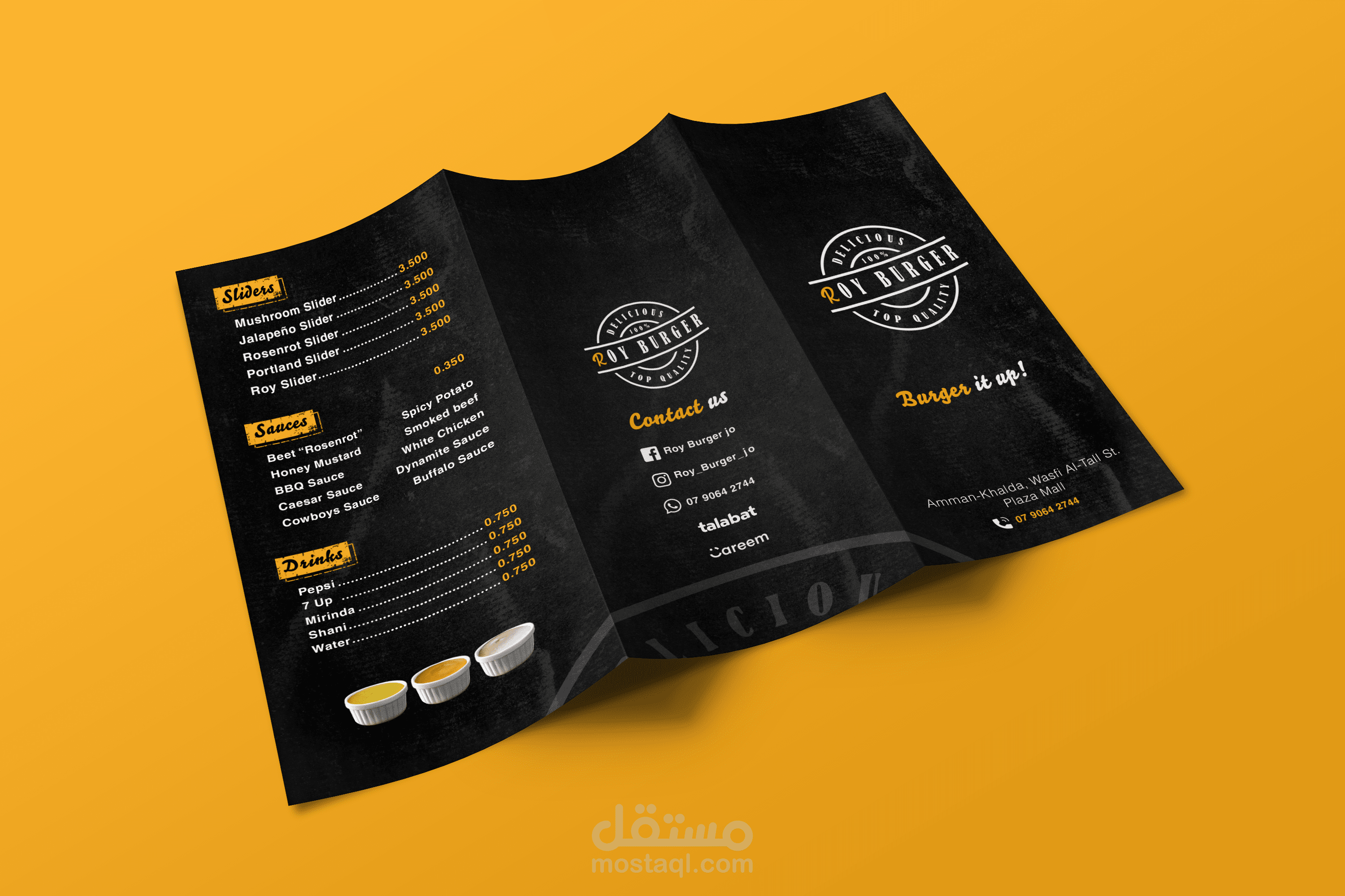 تصميم لمنيو مطعم برجر، اعتمدت الألوان التي تمثل هوية المطعم و قمت بتبسيط المنيو لجعل عملية الاختيار سهلة بالنسبة للعميل، و حرصت على ايجاد تباين في الالوان بين النص و الخلفية كحل لمشكلة كانت تعاني منها المنيو السابقة.