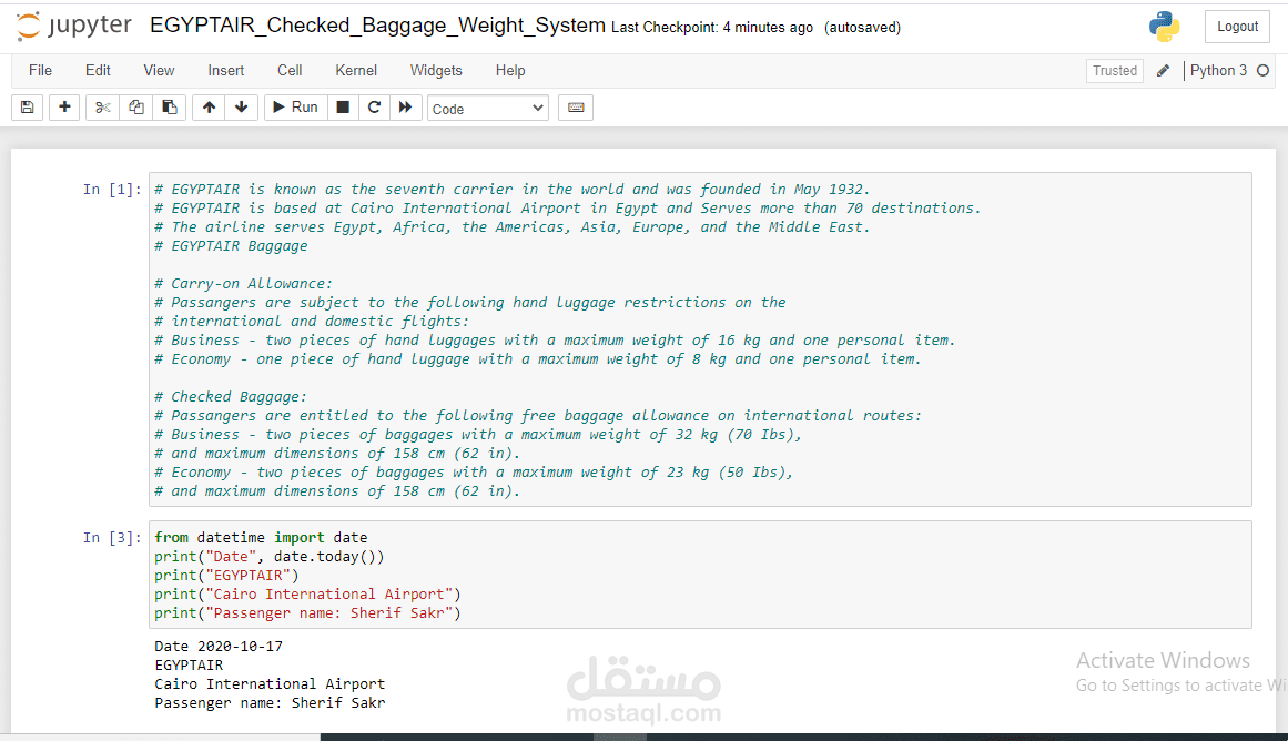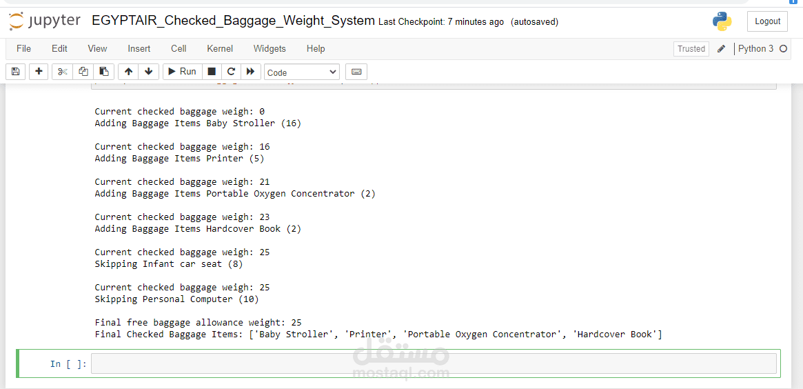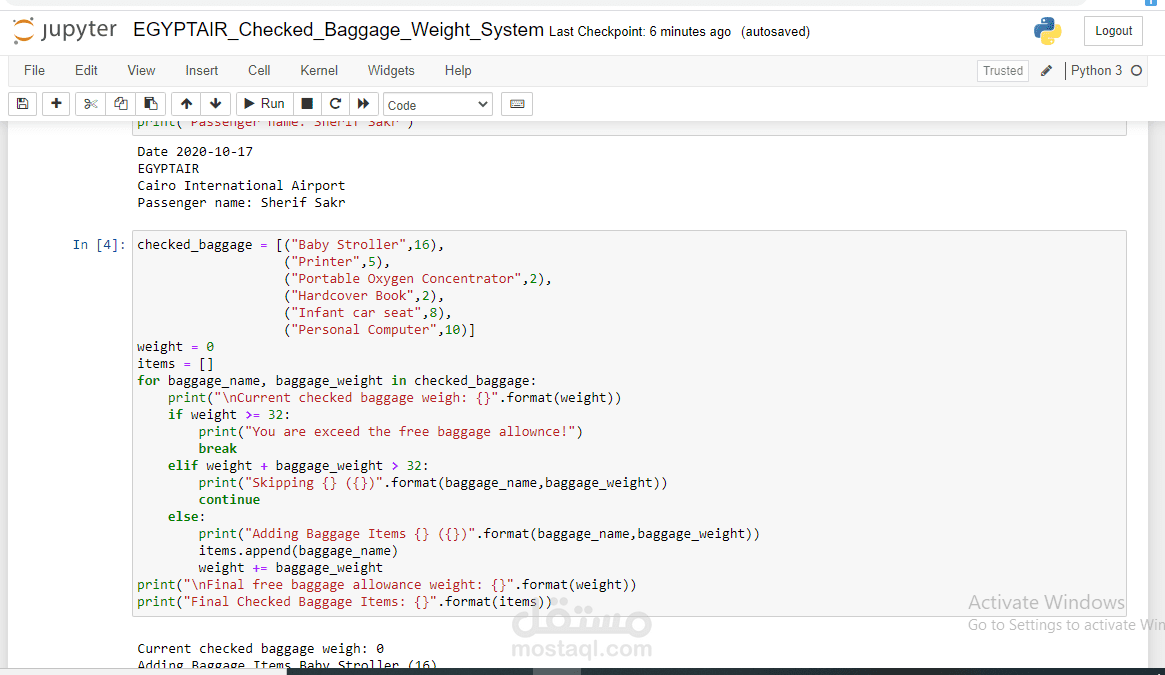 I use Python to solve the real-world problem, where the Python code solves the checked baggage weight limit program. By using the for loop to iterate or to do something repeatedly, over an iterable collection (list, string, set, tuple, or dictionary) or the checked baggage items, and using the break and continue keywords to control over the loop. However, I use the break to end from the loop when the weight reaches the limit of 32 kilograms, and use the continue to skip one iteration of a loop when adding an item would exceed the limit of 32 kilograms.
