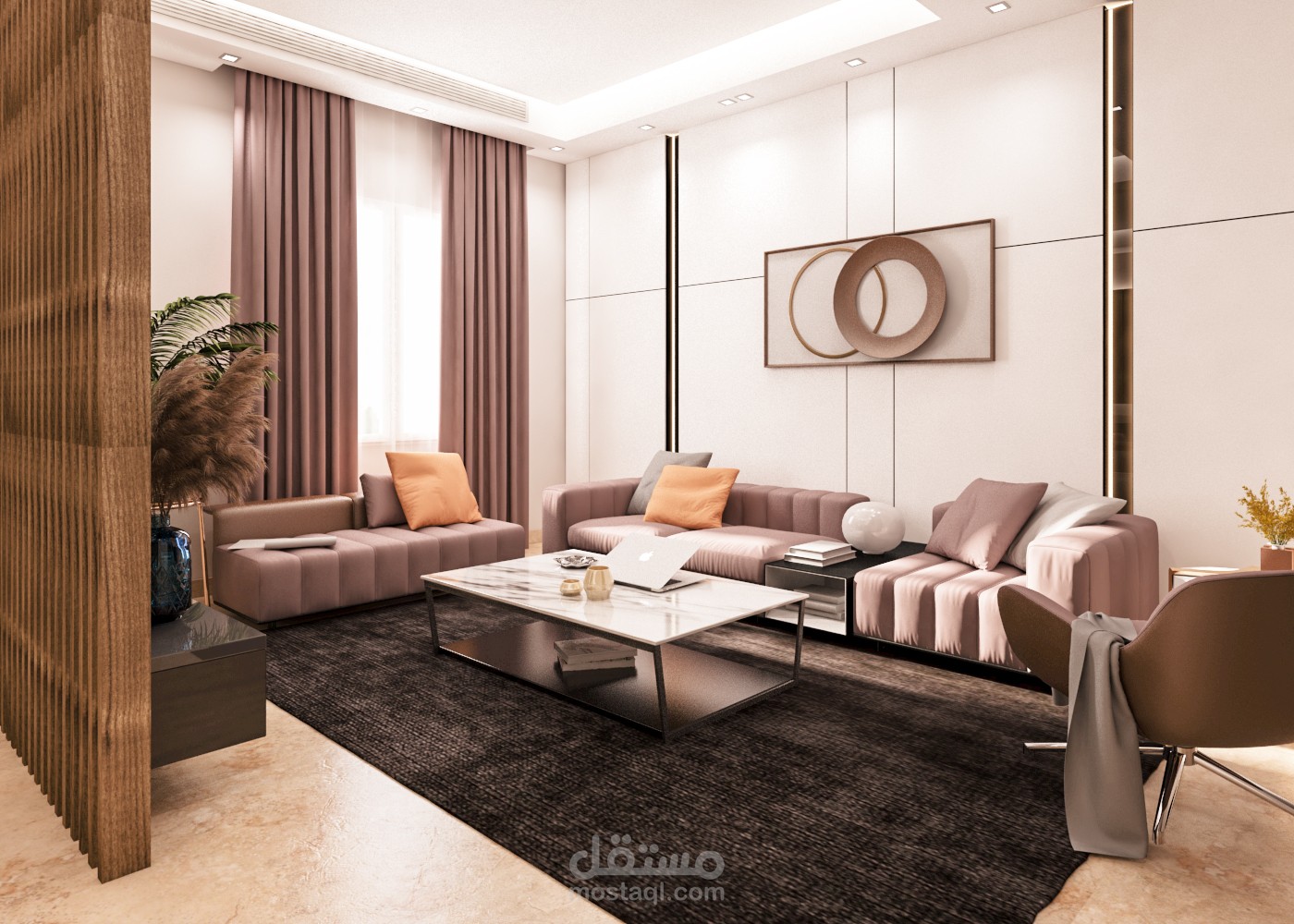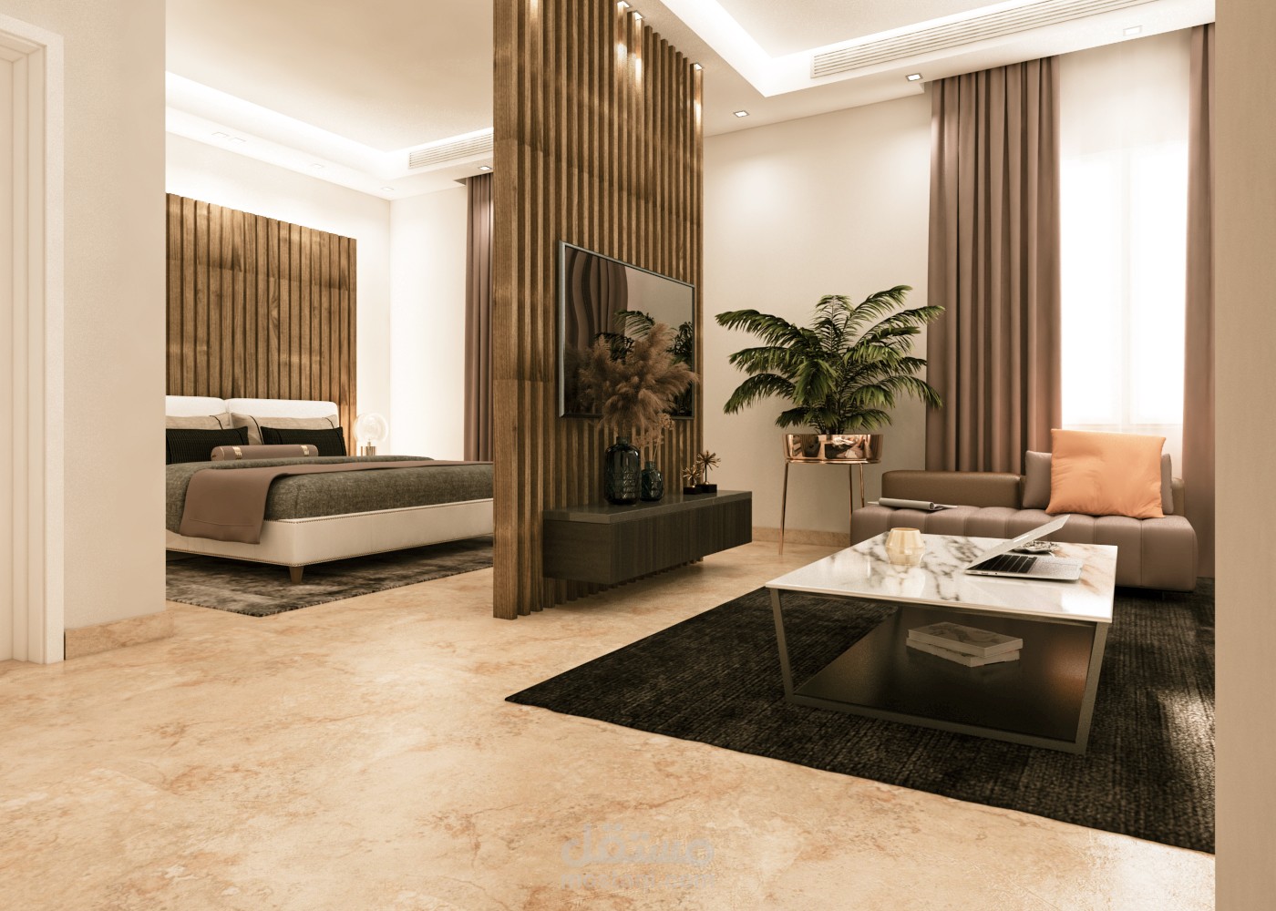 تصميم غرفه رئيسية باستايل مودرن استخدمت الوان دافئه تتماشي مع وظيفه الفراغ
