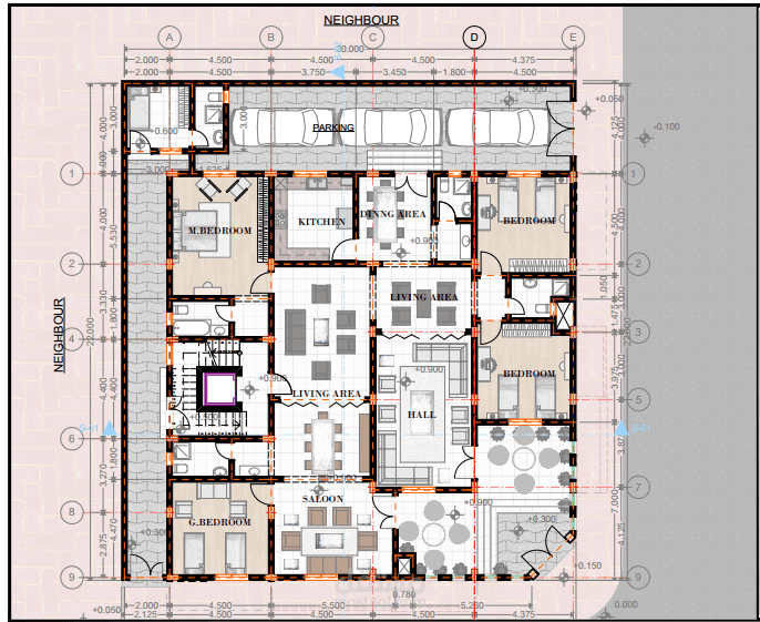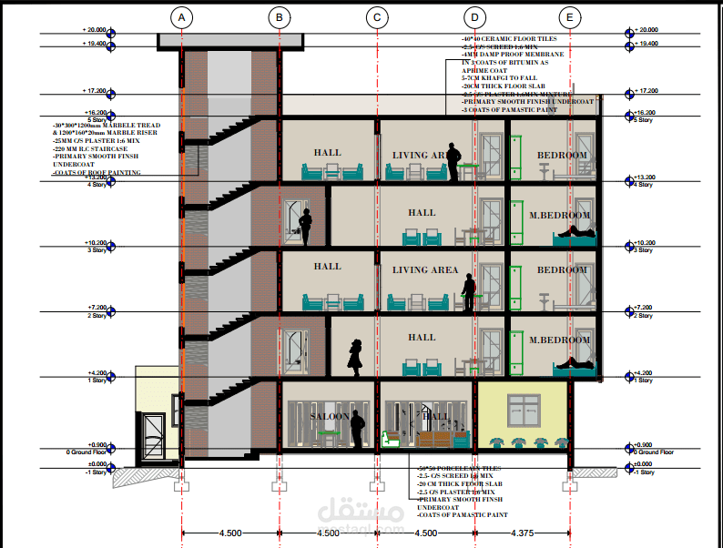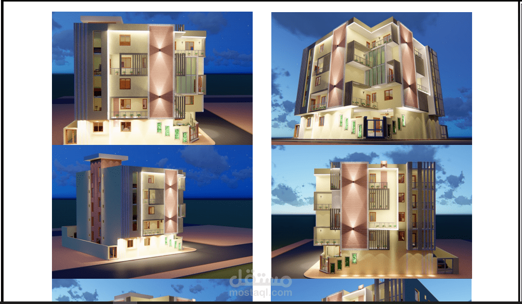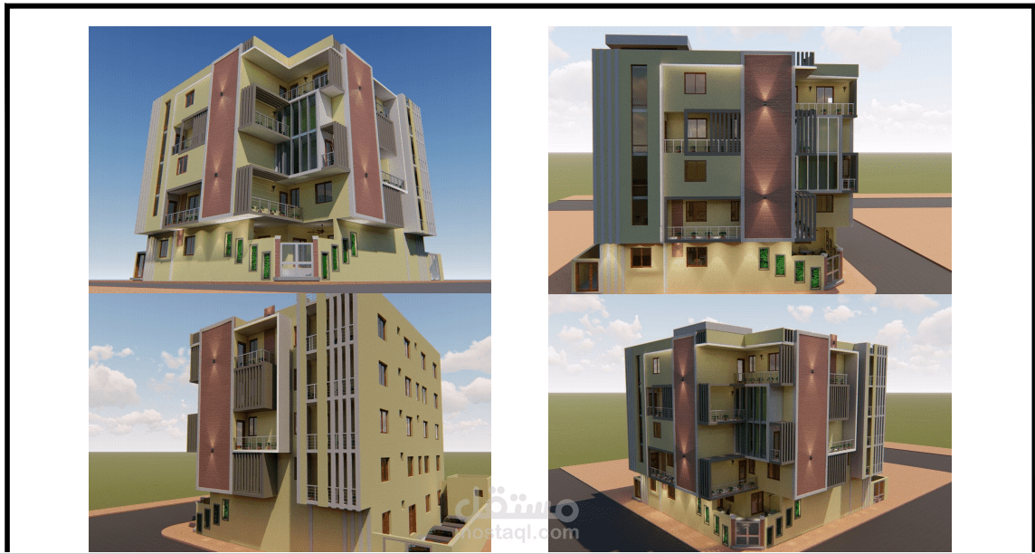 تم تصميم مخططات معمارية وإنشائية وكهربائية وسباكة وصرف وميكانيكة لمبنى سكني مكون من طابق ارضي واربعة طوابق متكررة وملحق سطح