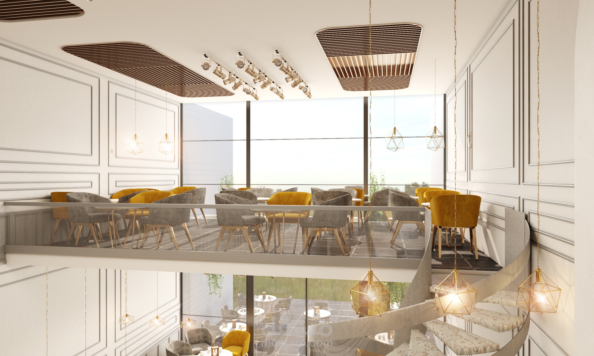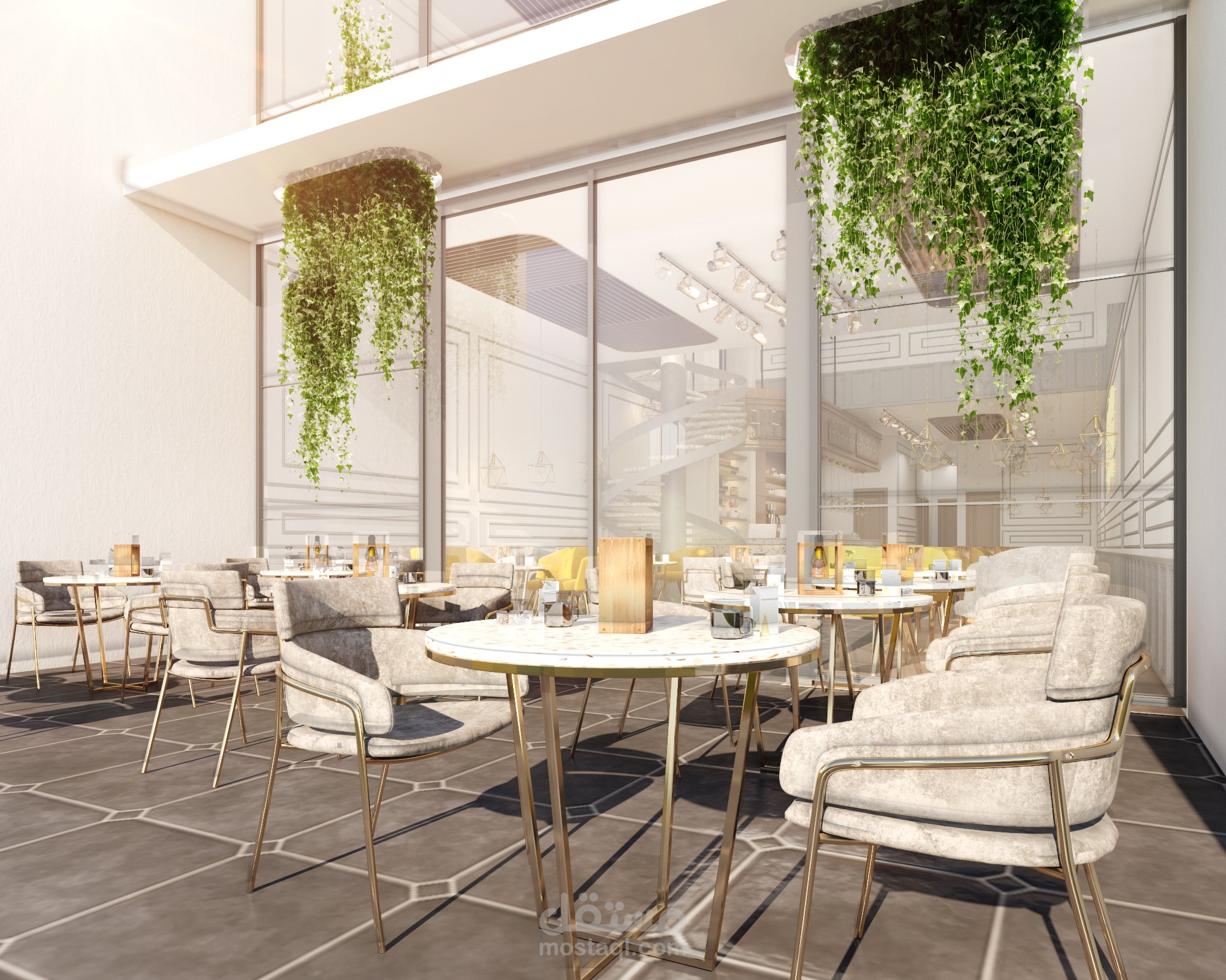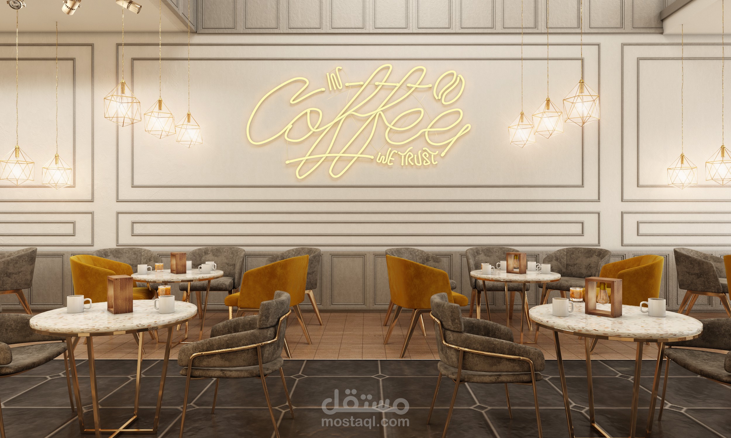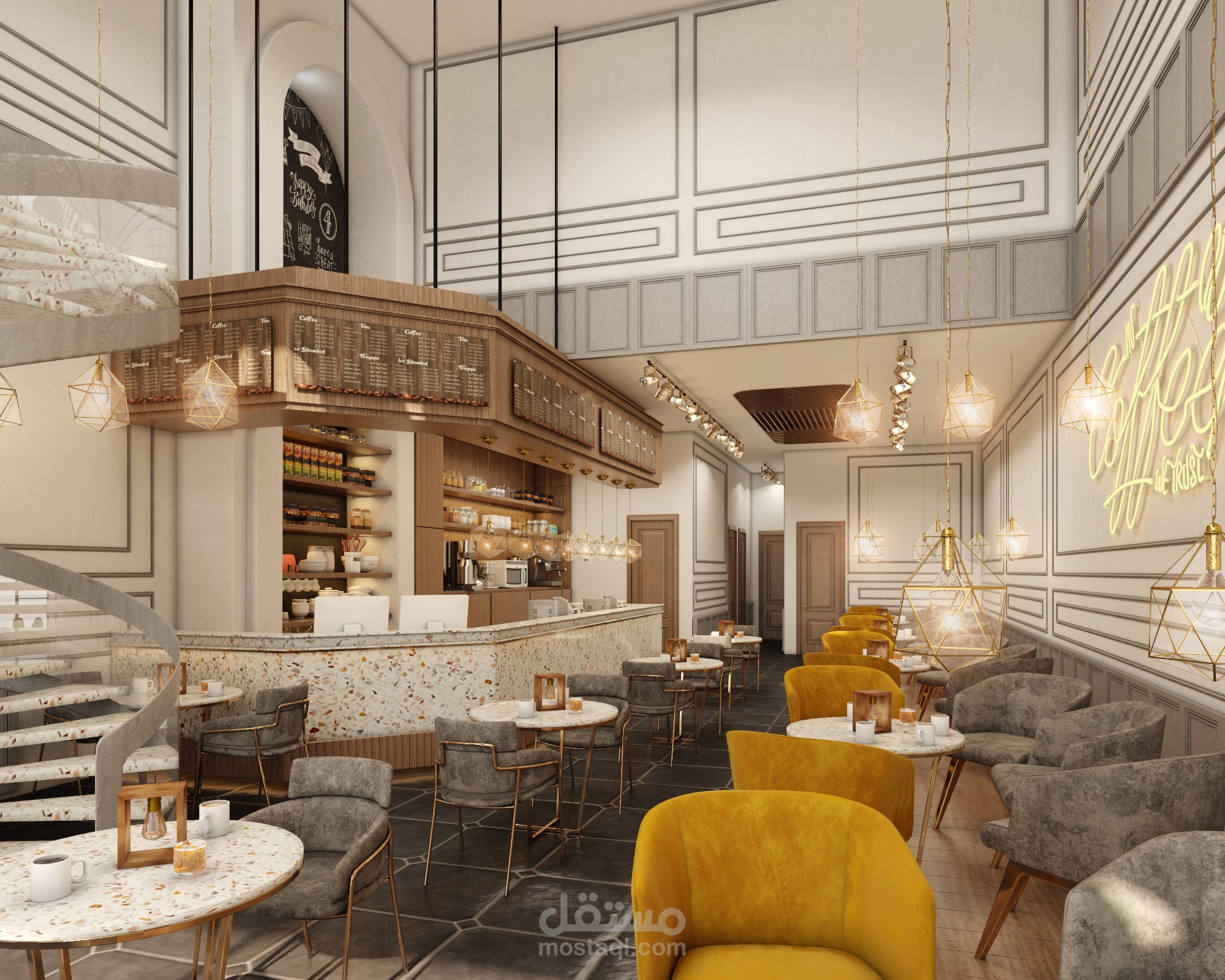 تصميم فراغ داخلي لكوفي شوب في السعودية بنمط نيو كلاسيك بشكل بسيط وانيق.