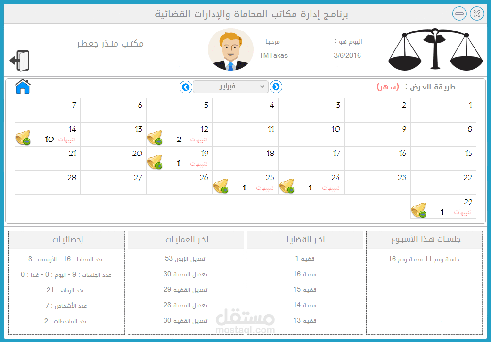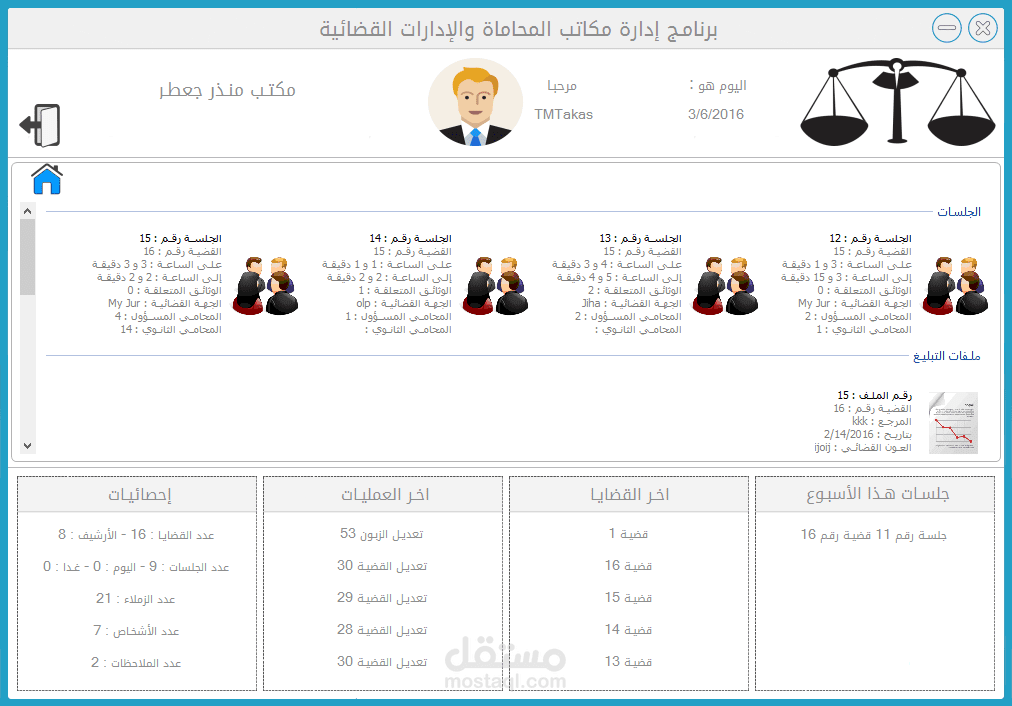برنامـج لإدارة مكاتـب المحامـات والإدارات القانونيـة يقـدم لكـم العديـد من المميـزات المتعلقـة بإدارة النزاعـات القانونيـة بفضـل العديـد من الخصائـص القضايـا، الجلسـات، الملفـات المرفقـة، الأتعـاب، الزبنـاء و العديد من الخصائص التي تساعد على تسيير العمل في مكاتب المحاماة و الإدارات القضائية.
