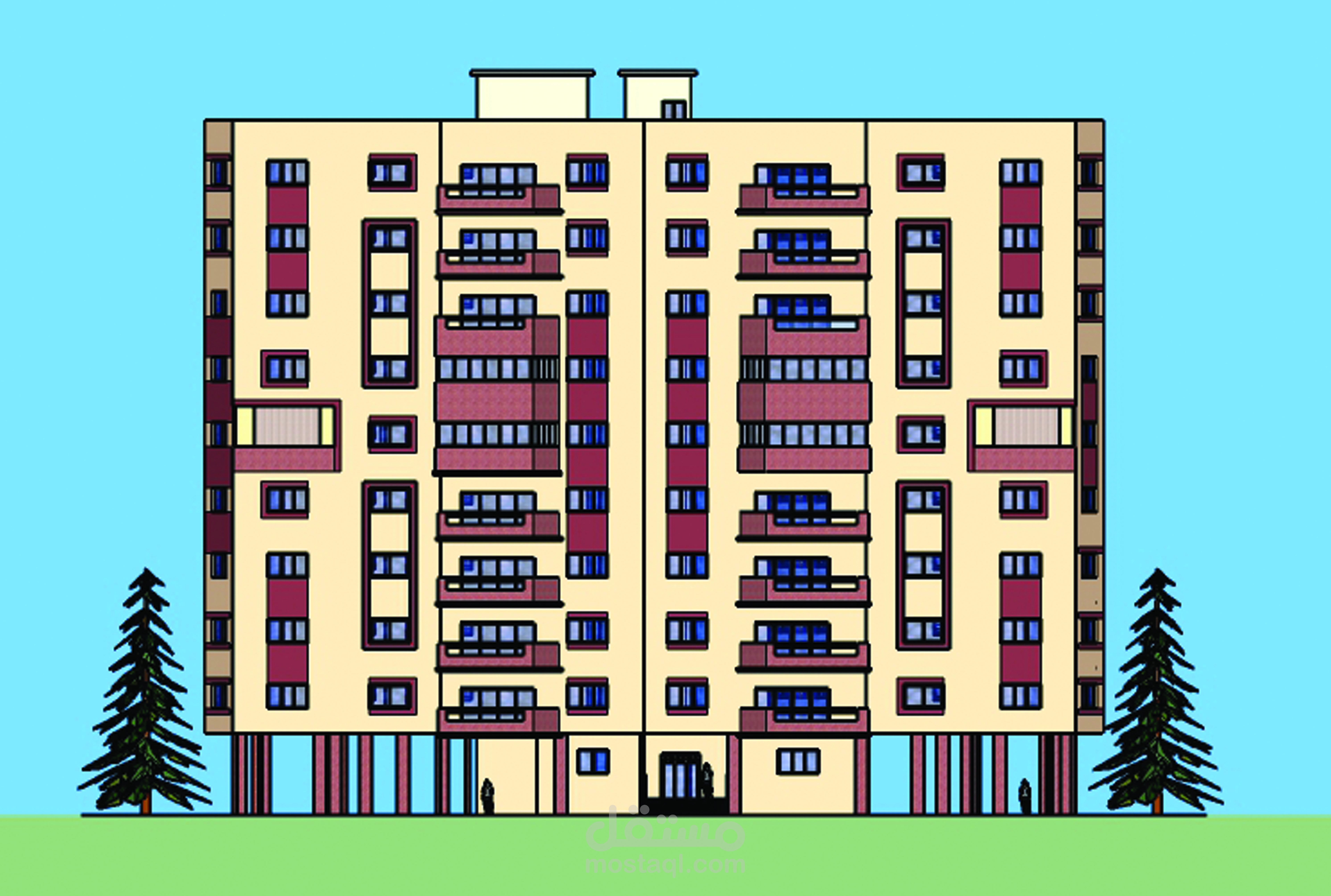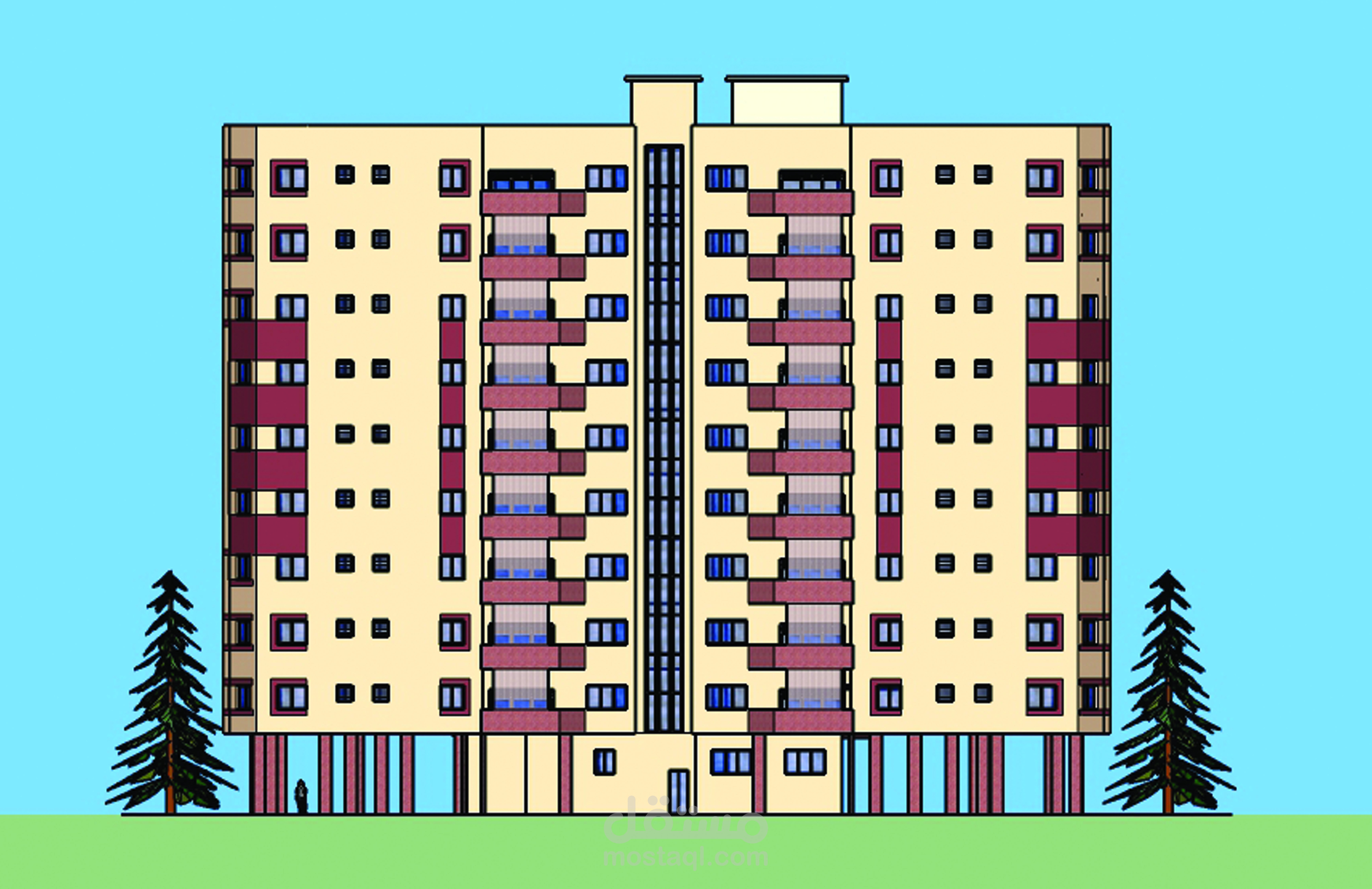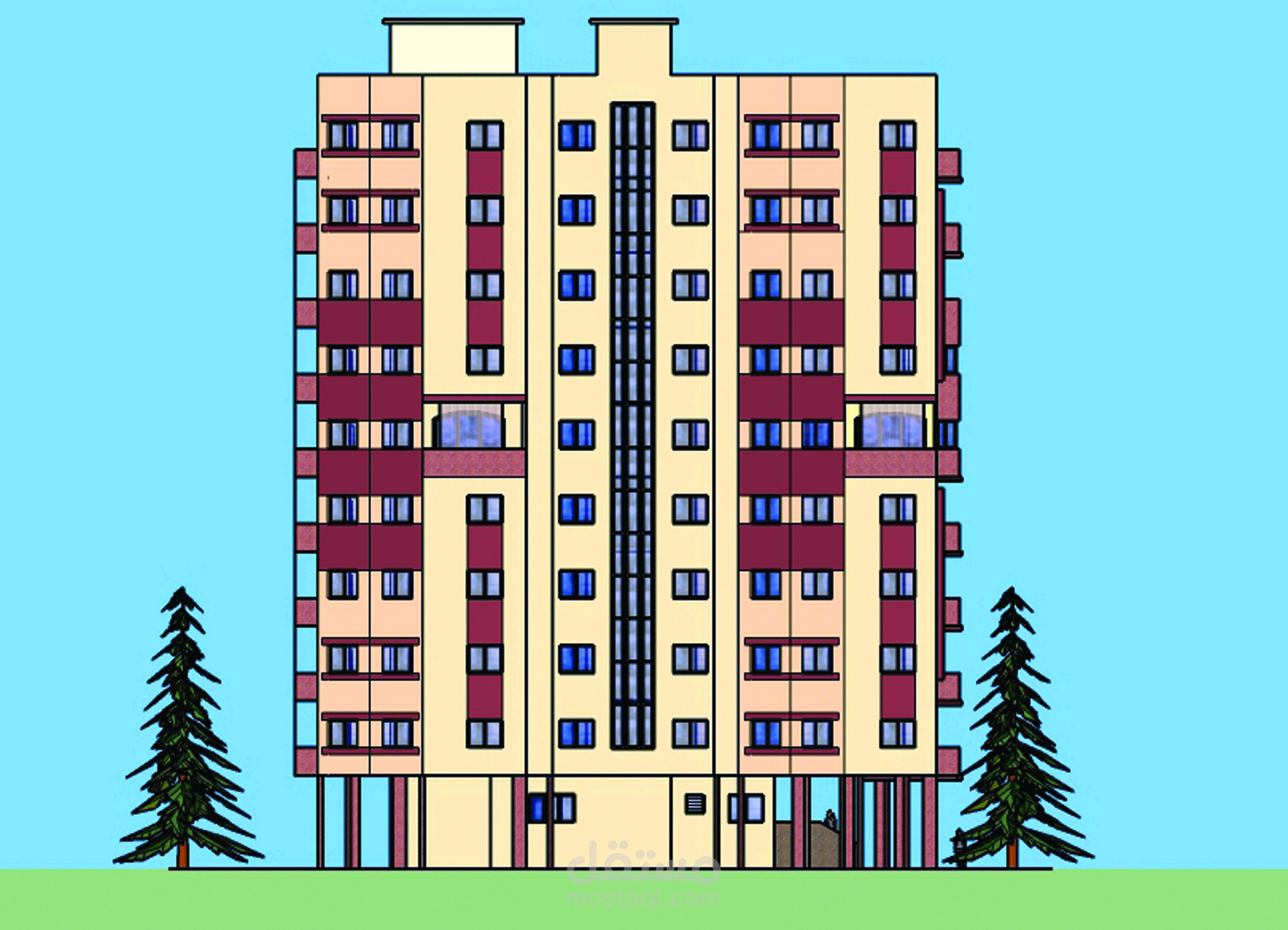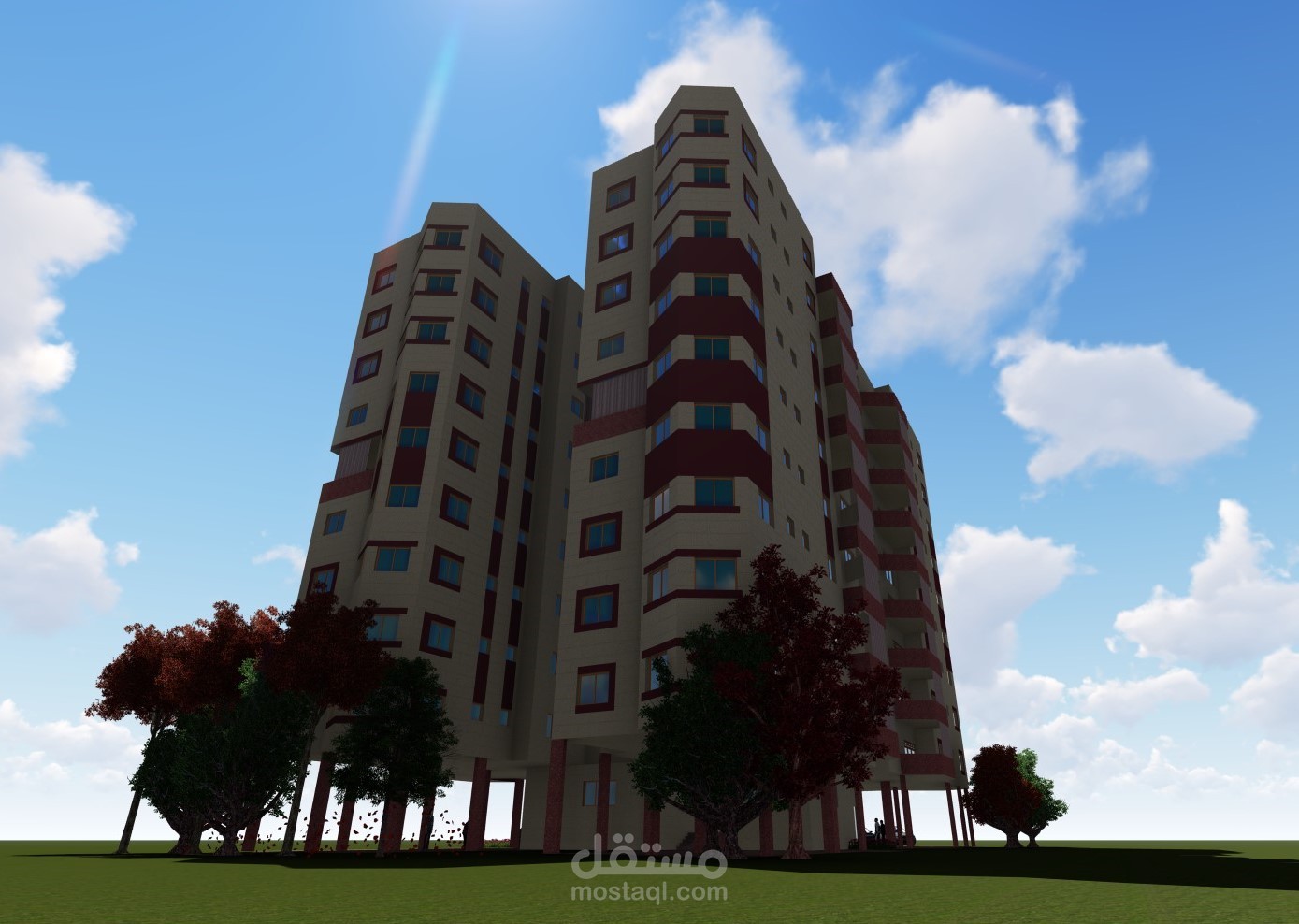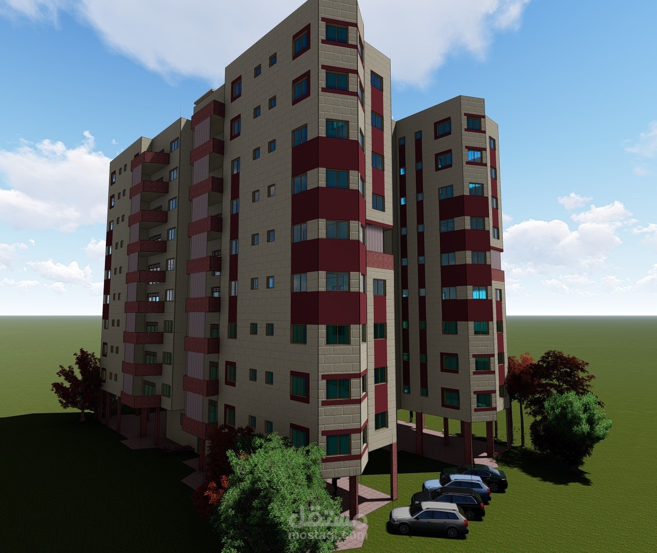 تصميم برج سكني كامل يتضمن مساقط وواجهات ورفع ثلاثي الأبعاد.