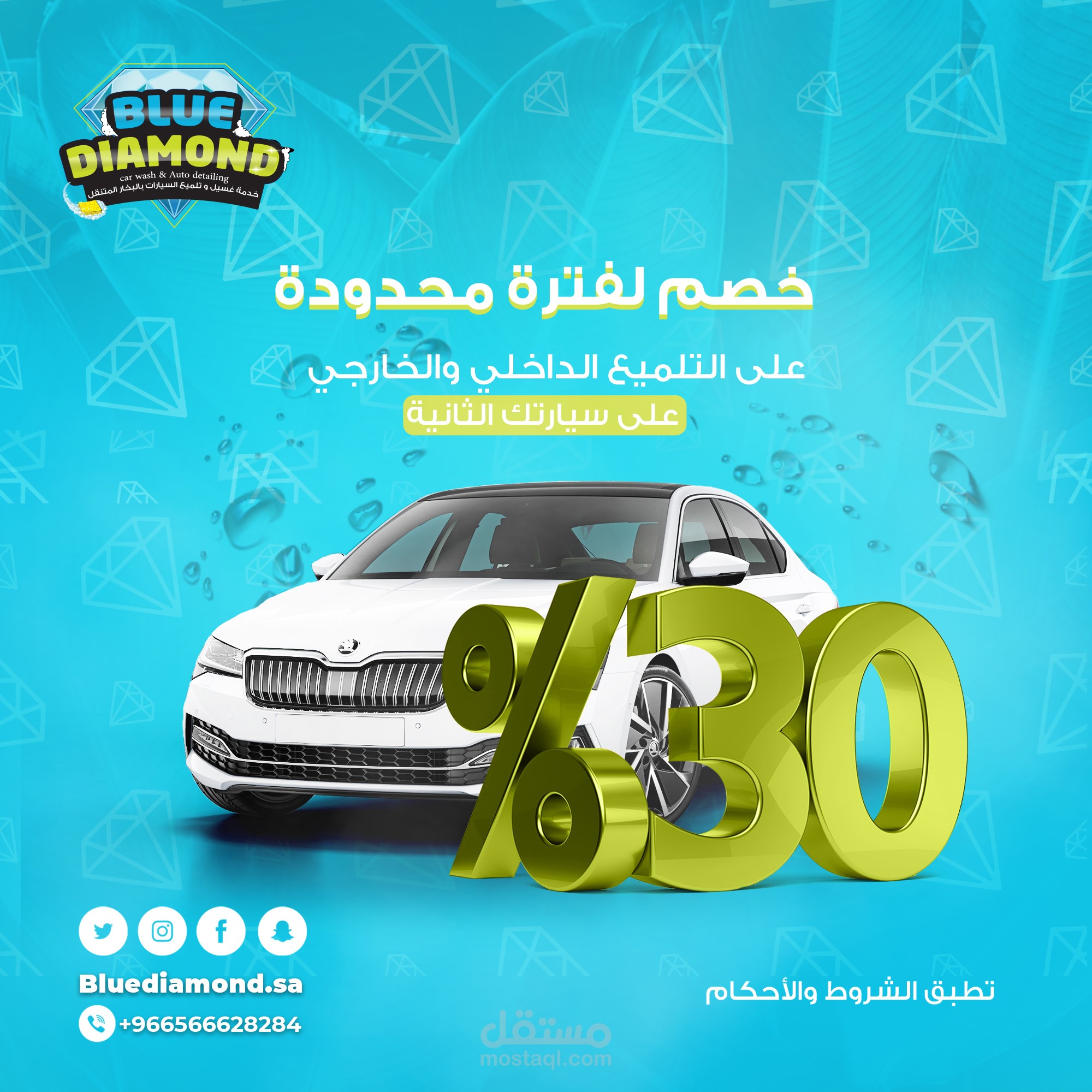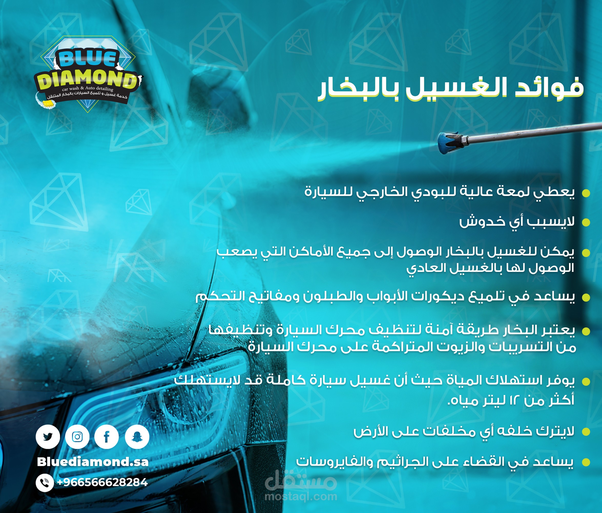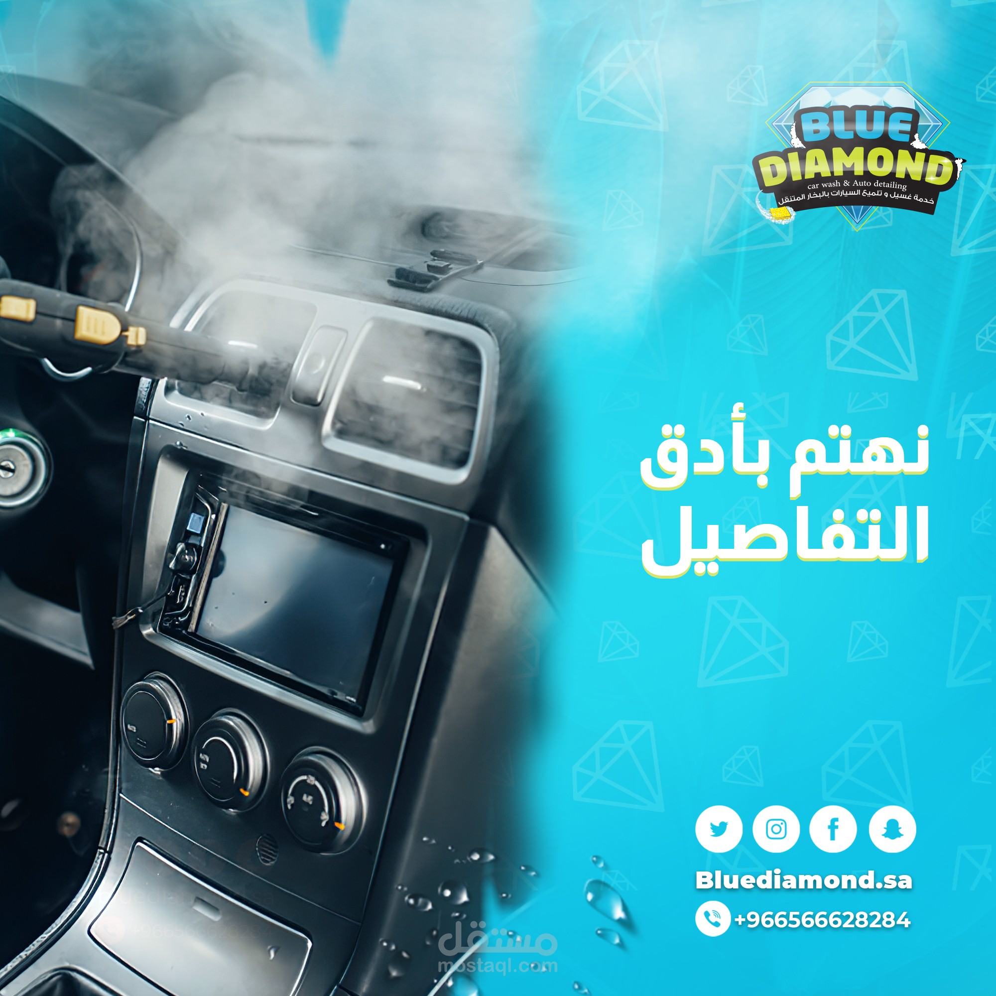 التصاميم الخاصة لشركة Blue Diamond المختصة في غسيل البخار للسيارات على الانستغرام والفيسبوك والتويتر